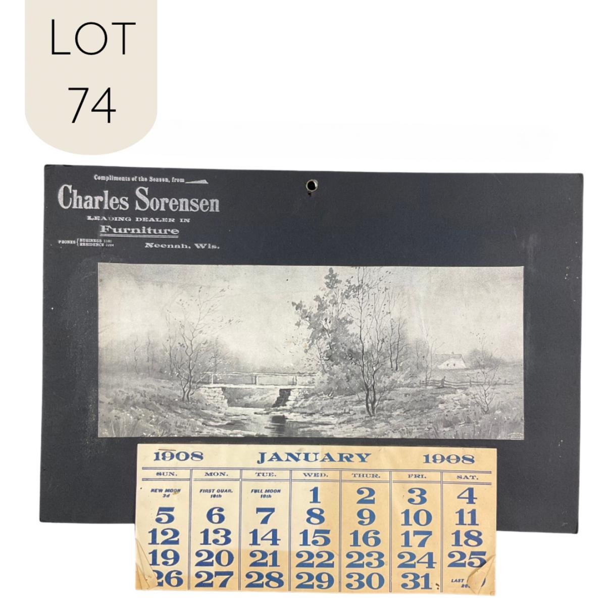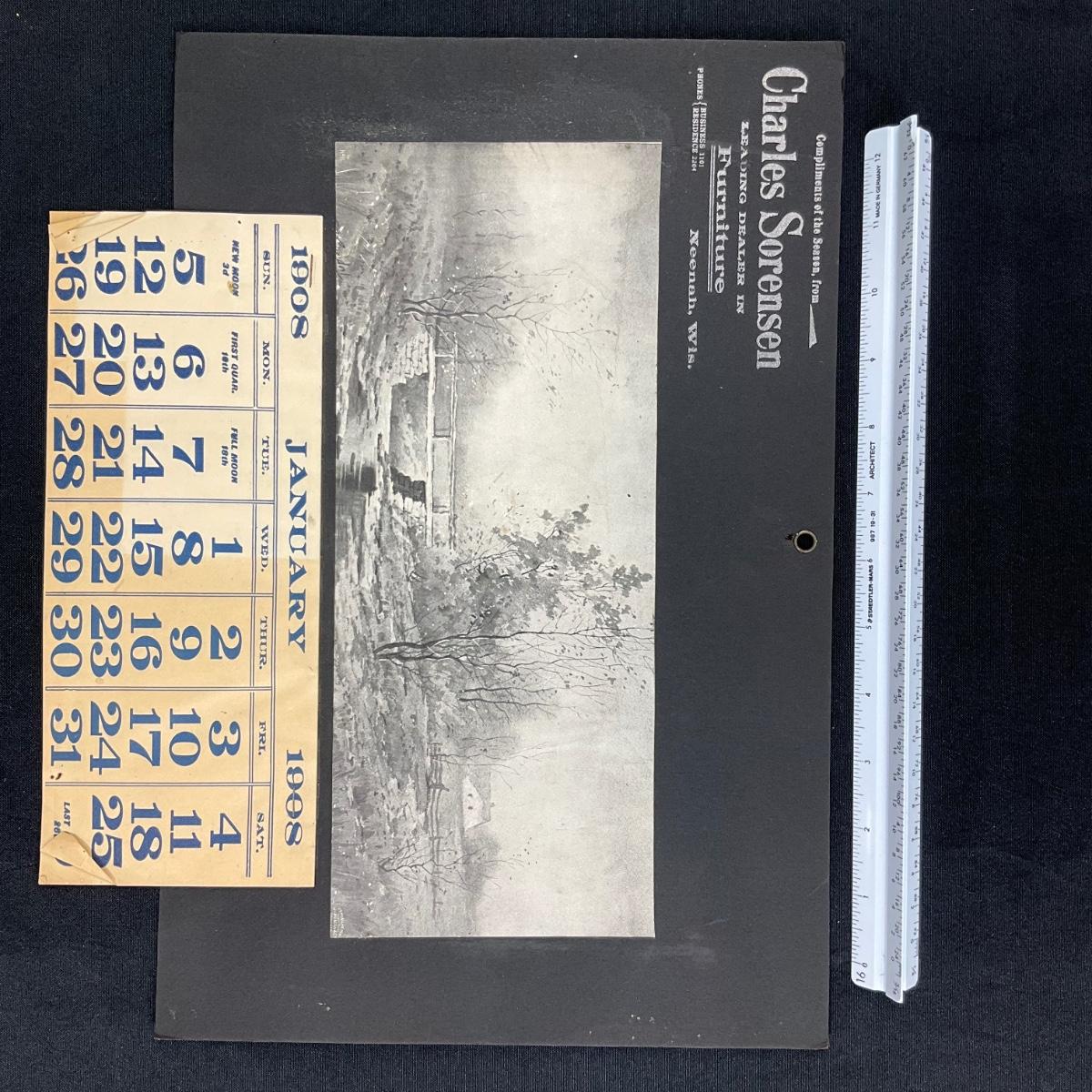 This calendar was courtesy of Charles Sorensen, Leading Dealer in Furniture in Neenah Wisconsin. The calendar features a picture simply titled "No. 11". There is a partial signature, but not legible. The picture depicts a Bridge Landscape Scene. Calendar is copyright Walter C Hartson, Copyright 1901. Calendar was produced by J I Austen & Co of Chicago Illinois. The calendar is complete, showing January 1908. The calendar measures 14 7/8" x 10". **|** Please see photos for details and condition. ::: Shipping is available on this lot. If you require shipping you must let us know at the close of the auction. We will coordinate with you after the item has been won. Shipping fees will include insurance up to or exceeding the value of all items being mailed. If you have any questions regarding this lot please contact the auctioneer either via this website, by direct email or by phone. PICK UP TIMES and other important information can be found in the TERMS and DESCRIPTION of the auction. Please take a look for pertinent information. Thanks!