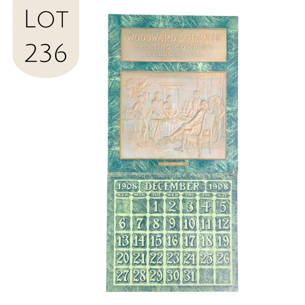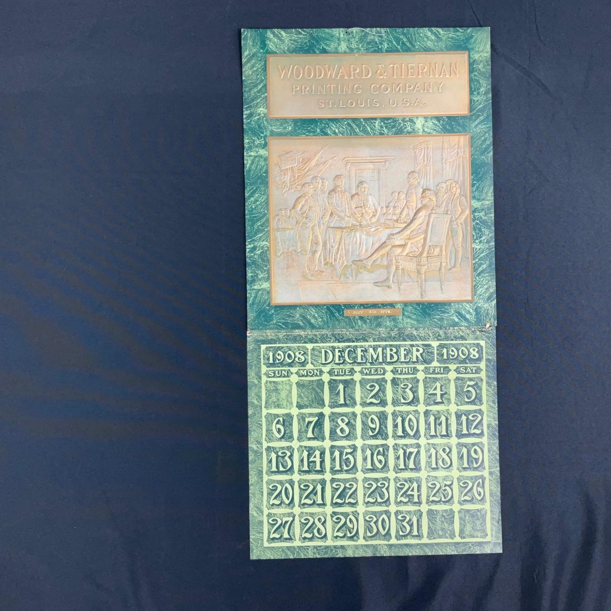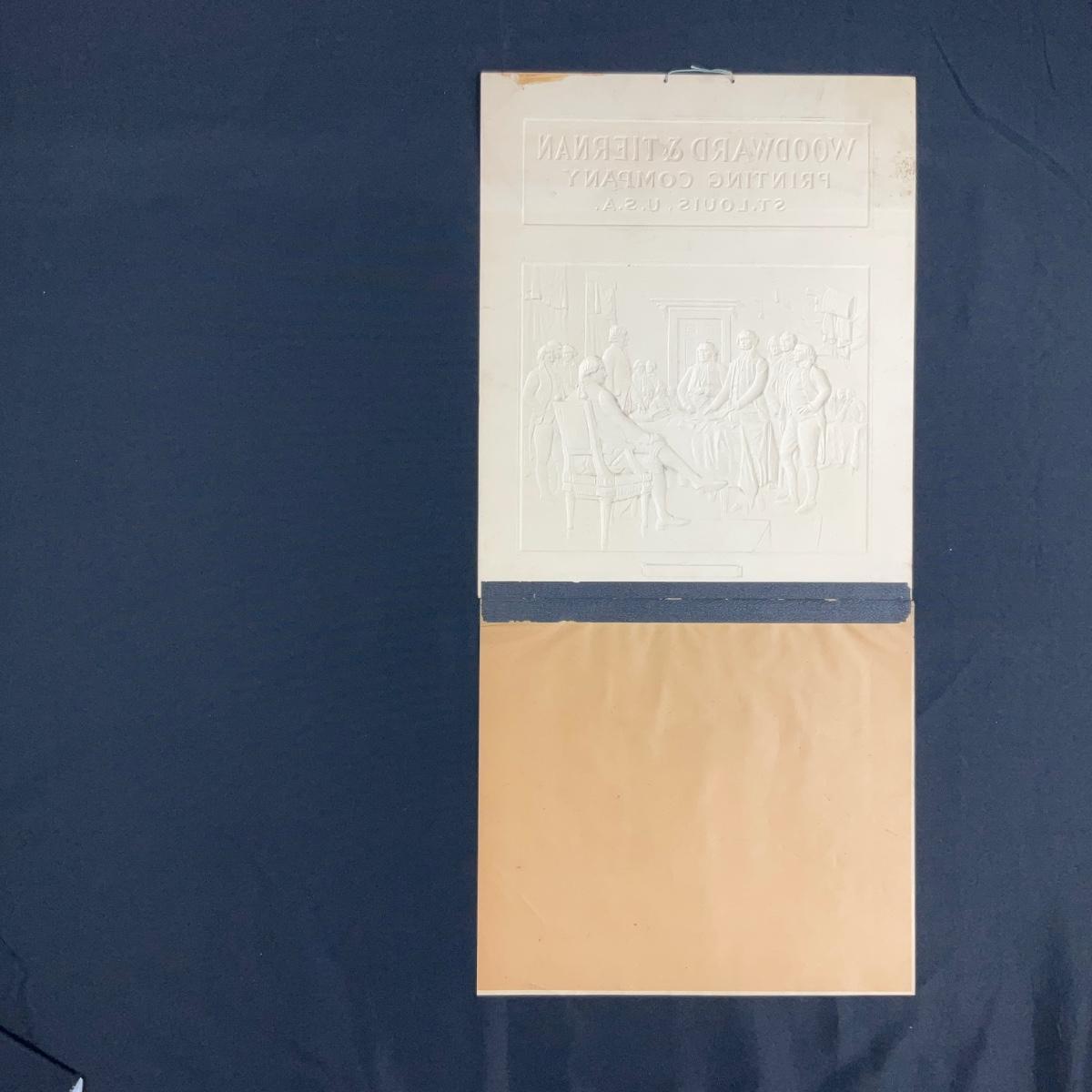This calendar was to promote the Woodward & Tiernan Printing Company of St Louis Missouri. The calendar features a raised impression of the signing of the U S Constitution. This calendar is incomplete, showing December 1908. This calendar measures 13" x 27 3/8". **|** Please see photos for details and condition. ::: Shipping is available on this lot. If you require shipping you must let us know at the close of the auction. We will coordinate with you after the item has been won. Shipping fees will include insurance up to or exceeding the value of all items being mailed. If you have any questions regarding this lot please contact the auctioneer either via this website, by direct email or by phone. PICK UP TIMES and other important information can be found in the TERMS and DESCRIPTION of the auction. Please take a look for pertinent information. Thanks!