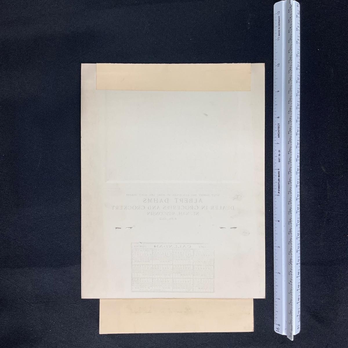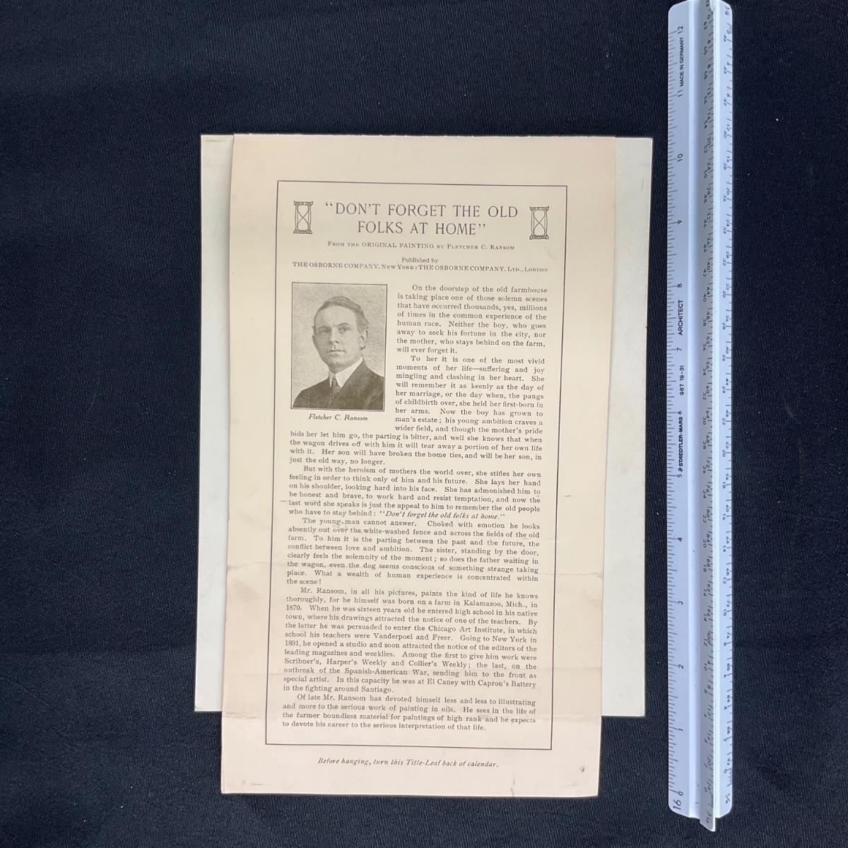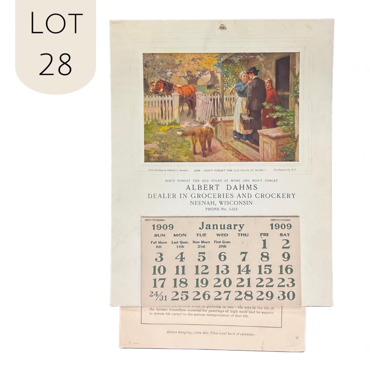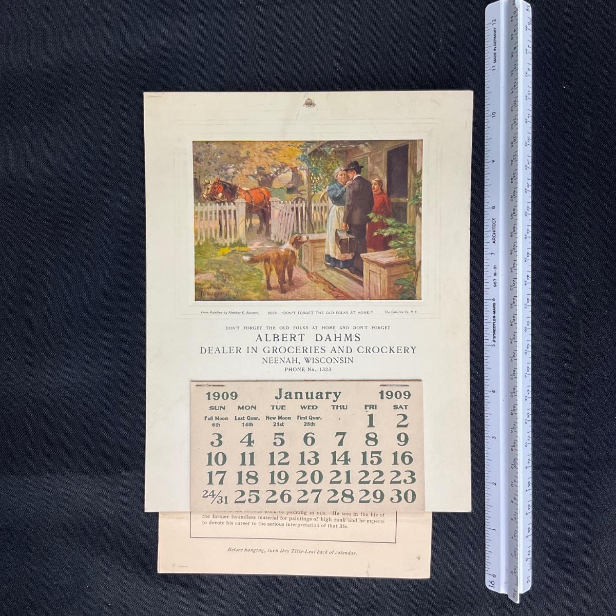 This calendar is completely complete, with the Calendar showing January 1909, and the Cover Page still intact. This Calendar features a real guilt trip of a picture titled "Don't forget the Old Folks at Home", original by Fletcher C Ransom, Printed by The Osbourne Co in New York. The Picture depicts a young man with his suitcase packed and carriage ready to go, just trying to get off the last step so he can leave the house, but his mother won't let go of his shoulder. It's picturesque and vibrant in color, but we've all been there and had this exact same moment. This Calendar promotes Albert Dahms - Dealer in Groceries and Crockery in Neenah, Wisconsin. Calendar measures 7 1/8" x 9 1/8". **|** Please see photos for details and condition. ::: Shipping is available on this lot. If you require shipping you must let us know at the close of the auction. We will coordinate with you after the item has been won. Shipping fees will include insurance up to or exceeding the value of all items being mailed. If you have any questions regarding this lot please contact the auctioneer either via this website, by direct email or by phone. PICK UP TIMES and other important information can be found in the TERMS and DESCRIPTION of the auction. Please take a look for pertinent information. Thanks!