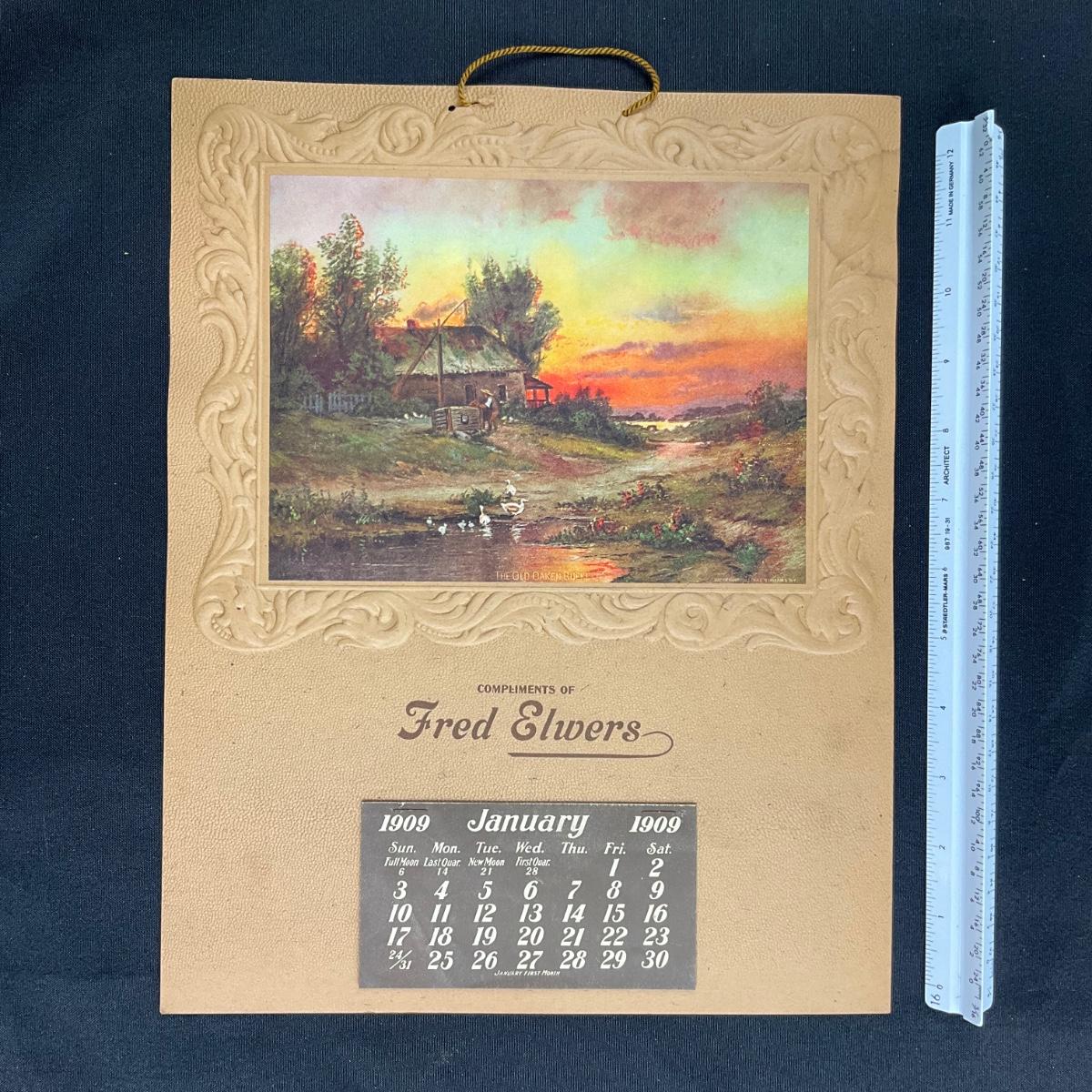 This calendar was compliments of Fred Elwers, a Druggist. Location unnamed. The calendar features a picture titled "The Olde Oaken Bucket", original painting by Chas. Williams, Copyright 1907. The picture depicts an evening rural landscape with some ducks near a pond, and a boy at a well nearby. The calendar measures 10 1/2" x 13 3/4". The calendar is complete, showing January 1909. **|** Please see photos for details and condition. ::: Shipping is available on this lot. If you require shipping you must let us know at the close of the auction. We will coordinate with you after the item has been won. Shipping fees will include insurance up to or exceeding the value of all items being mailed. If you have any questions regarding this lot please contact the auctioneer either via this website, by direct email or by phone. PICK UP TIMES and other important information can be found in the TERMS and DESCRIPTION of the auction. Please take a look for pertinent information. Thanks!
