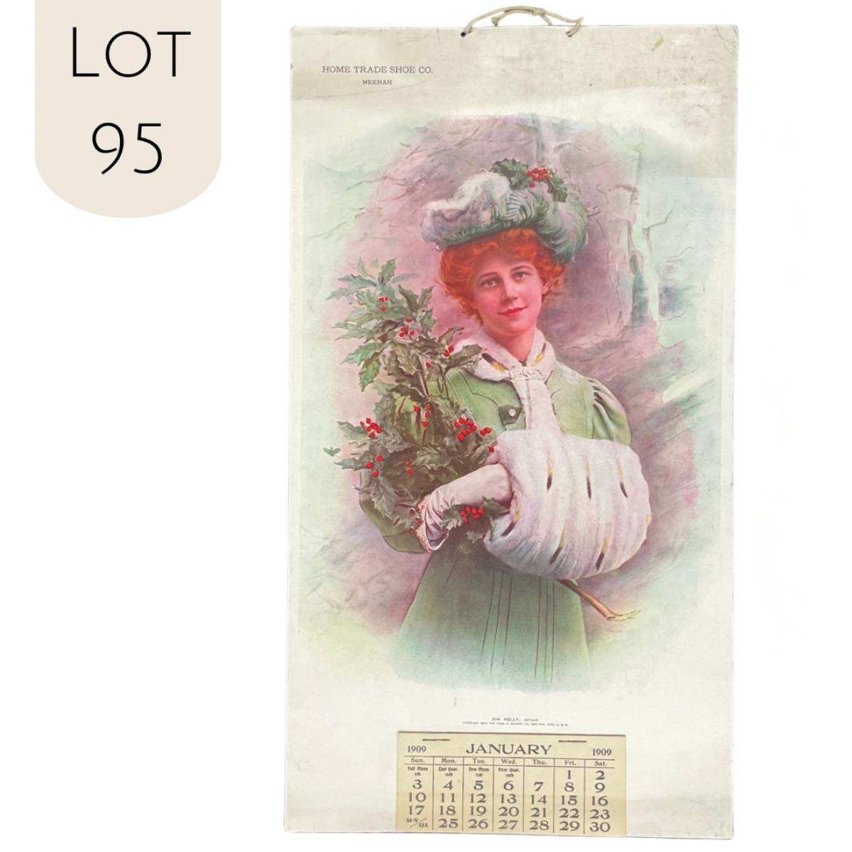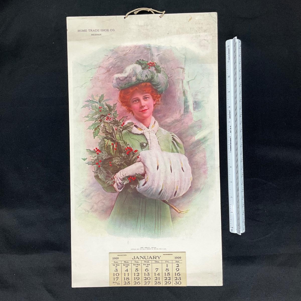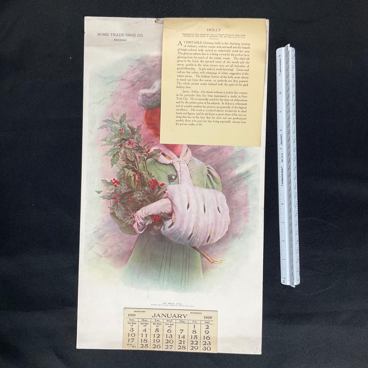 This calendar was compliments of the Home-Trade Shoe Company, located in Neenah Wisconsin. The calendar features a picture titled "Holly" original by James Arthur (bio included), copyright 1907, The Thos. D. Murphy Co., Red Oak Iowa. This picture depicts a Young red-haired woman with an ermine stole, muff around her arm and a large sprig of holly in her arms. This calendar is complete, showing January 1909. The calendar measures 10" x 18". **|** Please see photos for details and condition. ::: Shipping is available on this lot. If you require shipping you must let us know at the close of the auction. We will coordinate with you after the item has been won. Shipping fees will include insurance up to or exceeding the value of all items being mailed. If you have any questions regarding this lot please contact the auctioneer either via this website, by direct email or by phone. PICK UP TIMES and other important information can be found in the TERMS and DESCRIPTION of the auction. Please take a look for pertinent information. Thanks!