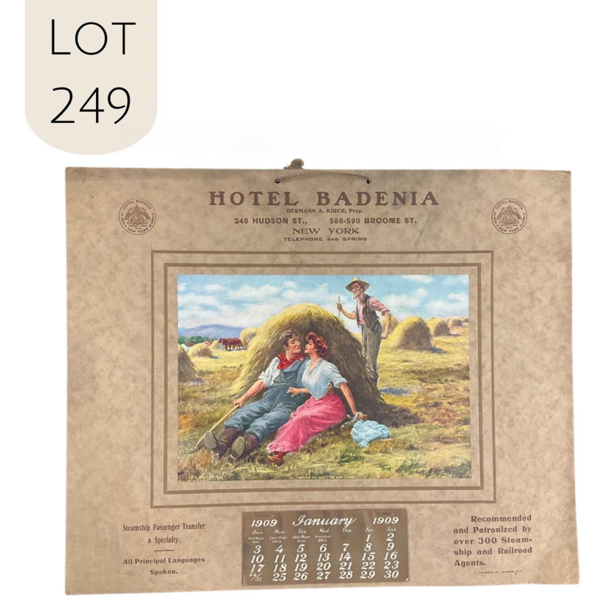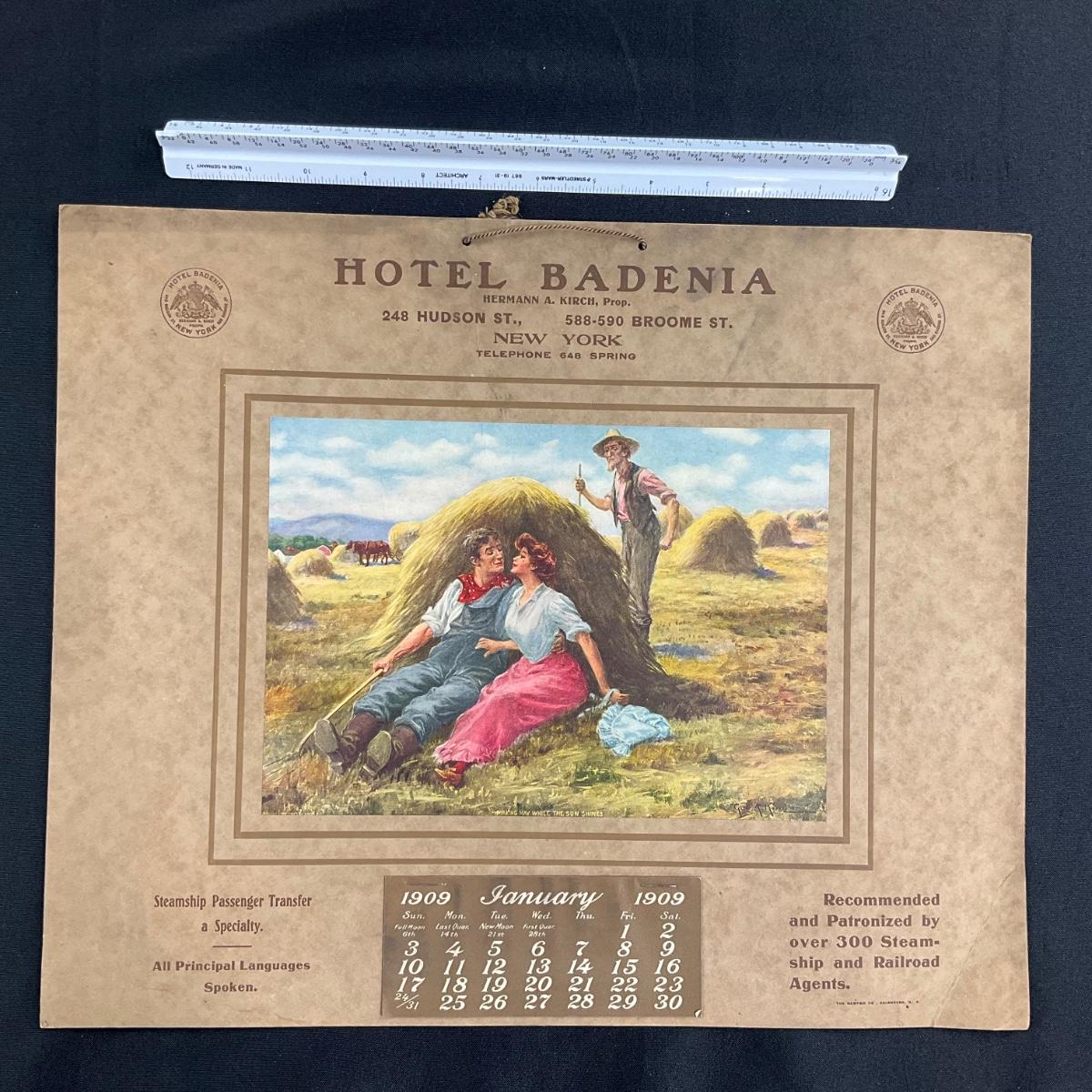This attractive calendar was courtesy of the Hotel Badenia of New York. Ol' Hermann A Kirch was the proprietor at that time. The calendar features a picture of a romancing couple leaning against a haystack, titled "Making Hay While The Sun Shines", original painting by Geo. W. King. This calendar is promoting lodging for steamships and railroads along the way. This calendar is complete, showing January 1909. The calendar measures 17" x 14". **|** Please see photos for details and condition. ::: Shipping is available on this lot. If you require shipping you must let us know at the close of the auction. We will coordinate with you after the item has been won. Shipping fees will include insurance up to or exceeding the value of all items being mailed. If you have any questions regarding this lot please contact the auctioneer either via this website, by direct email or by phone. PICK UP TIMES and other important information can be found in the TERMS and DESCRIPTION of the auction. Please take a look for pertinent information. Thanks!