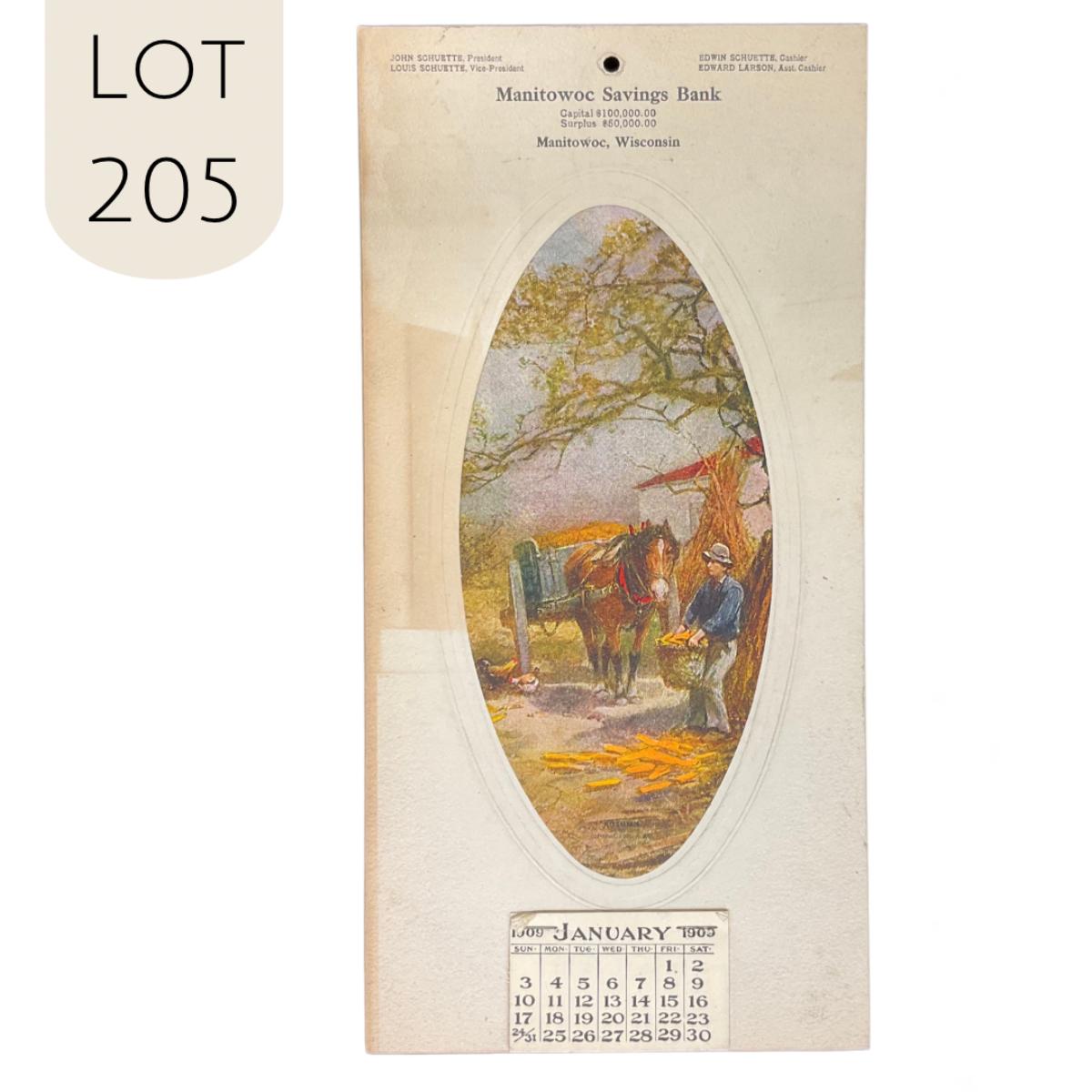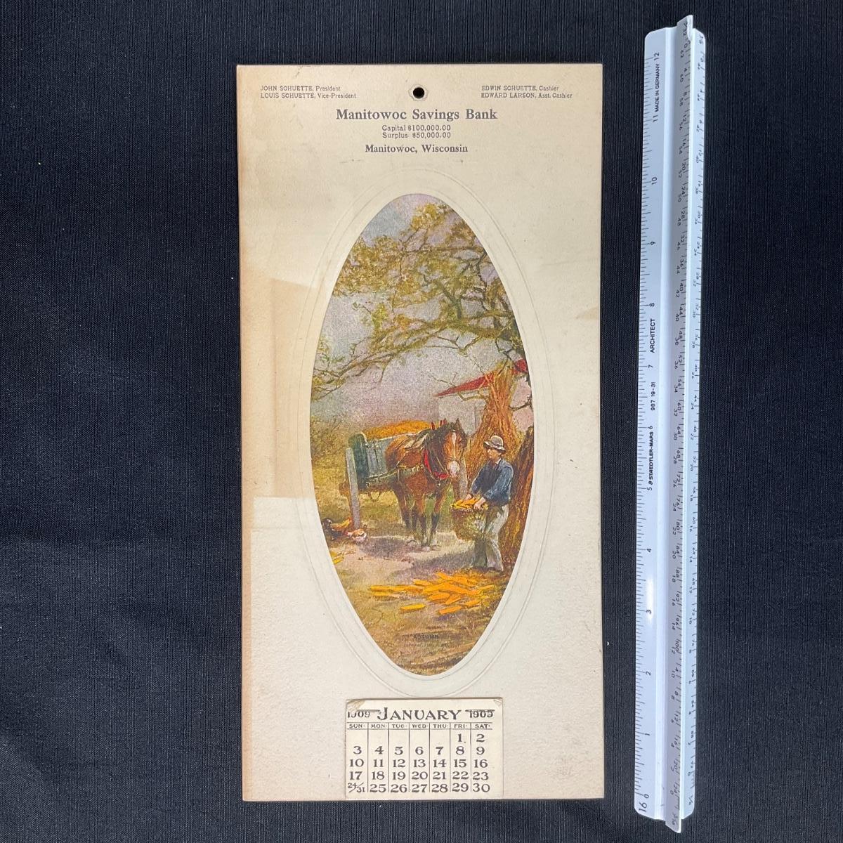 This calendar for the Manitowoc Savings Bank of Wisconsin features a farm scene with a horse, cart and a man holding a bushel of corn, titled "Autumn". Original painting by R. Hill, copyright 1905. This calendar is complete, showing January 1909. This calendar measures 5 7/8" x 11 7/8". **|** Please see photos for details and condition. ::: Shipping is available on this lot. If you require shipping you must let us know at the close of the auction. We will coordinate with you after the item has been won. Shipping fees will include insurance up to or exceeding the value of all items being mailed. If you have any questions regarding this lot please contact the auctioneer either via this website, by direct email or by phone. PICK UP TIMES and other important information can be found in the TERMS and DESCRIPTION of the auction. Please take a look for pertinent information. Thanks!