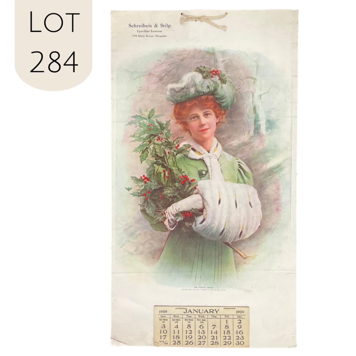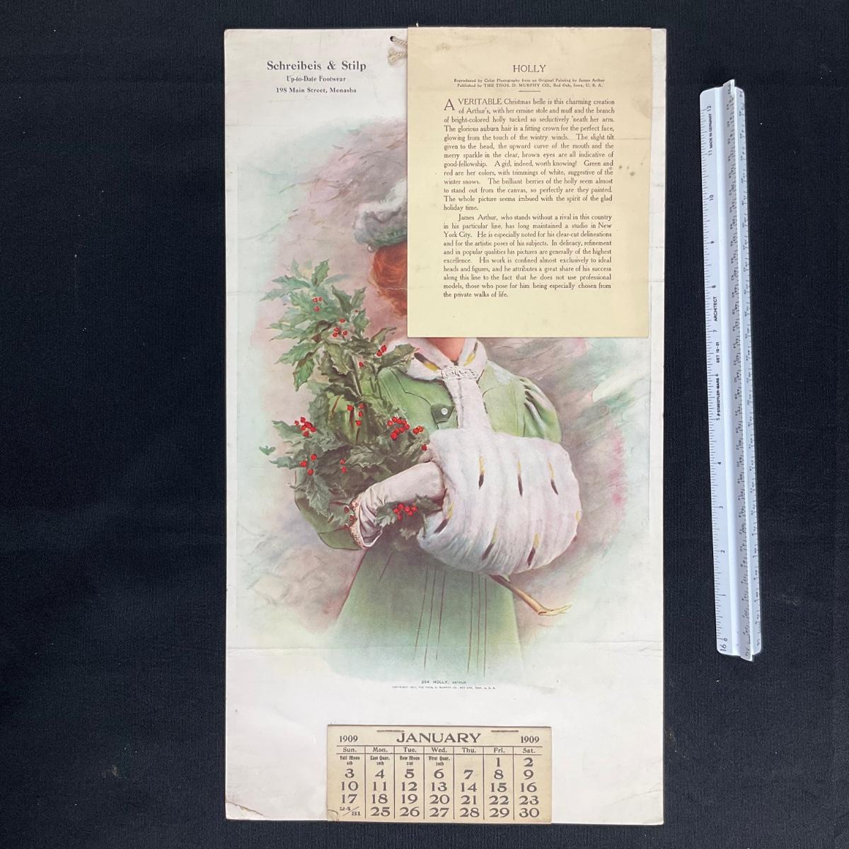This calendar was compliments of Schreibeis & Stilp, dealers in Up-to-Date Footwear, located on Main Street in Menasha Wisconsin. This calendar features a portrait of a young woman with an ermine stole and muff, holding a large sprig of holly, original painting by James Arthur, copyright 1907 The Thos D Murphy Co. Red Oak Iowa. This calendar is complete, showing January 1909, and includes the cover sheet. This calendar measures 10" x 18". **|** Please see photos for details and condition. ::: Shipping is available on this lot. If you require shipping you must let us know at the close of the auction. We will coordinate with you after the item has been won. Shipping fees will include insurance up to or exceeding the value of all items being mailed. If you have any questions regarding this lot please contact the auctioneer either via this website, by direct email or by phone. PICK UP TIMES and other important information can be found in the TERMS and DESCRIPTION of the auction. Please take a look for pertinent information. Thanks!