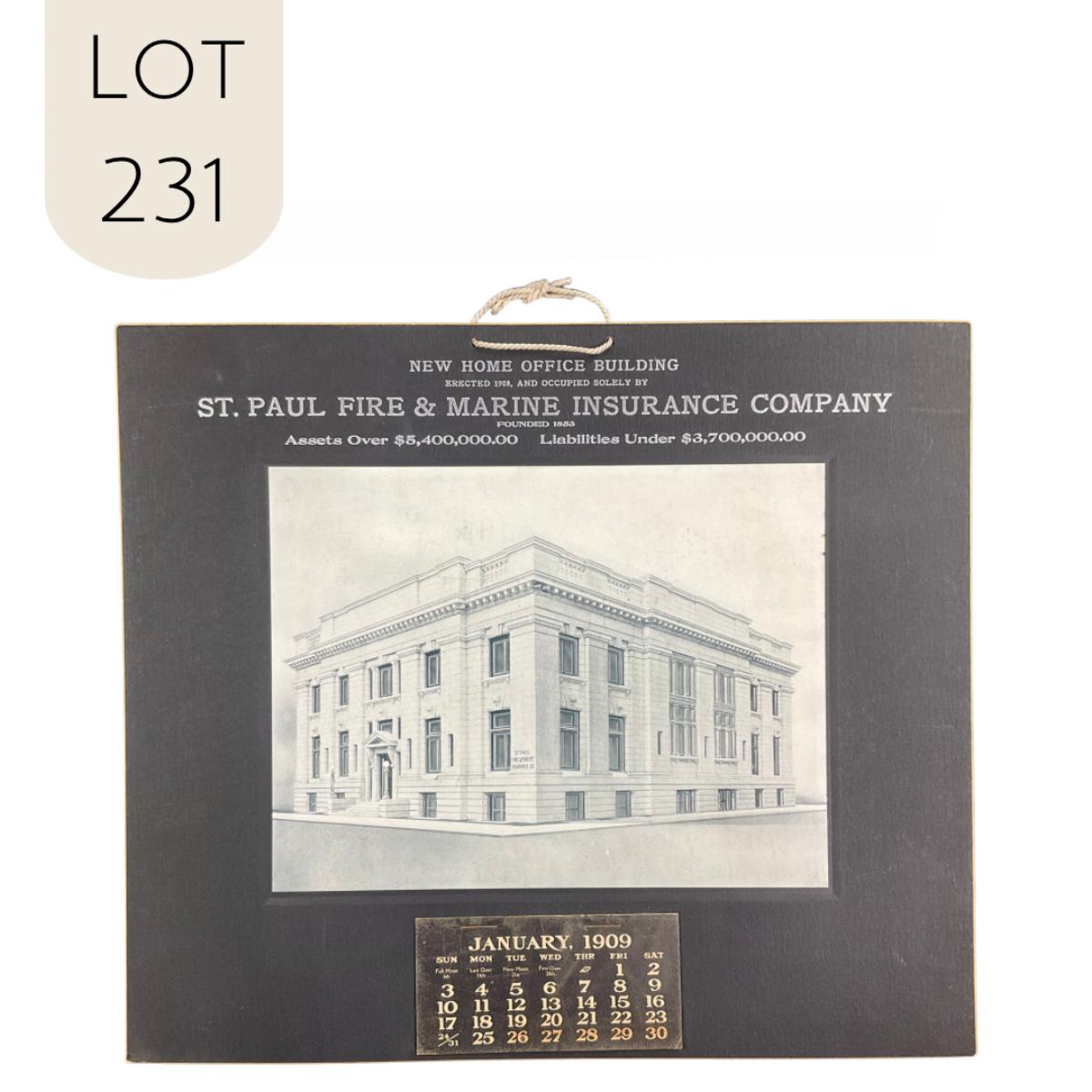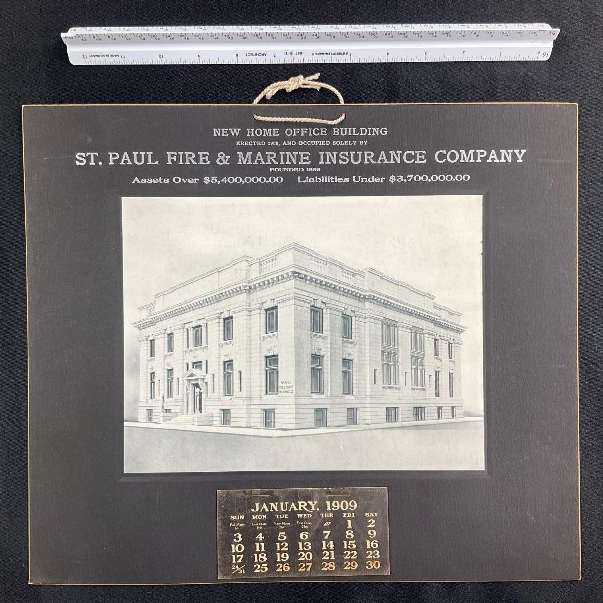 This calendar was compliments of the St Paul Fire and Marine Insurance Company. This calendar also brags about their "New Home Office Building", erected in 1908. This calendar is complete, showing January 1909. This calendar measures 14 5/8" x 12 3/4". **|** Please see photos for details and condition. ::: Shipping is available on this lot. If you require shipping you must let us know at the close of the auction. We will coordinate with you after the item has been won. Shipping fees will include insurance up to or exceeding the value of all items being mailed. If you have any questions regarding this lot please contact the auctioneer either via this website, by direct email or by phone. PICK UP TIMES and other important information can be found in the TERMS and DESCRIPTION of the auction. Please take a look for pertinent information. Thanks!