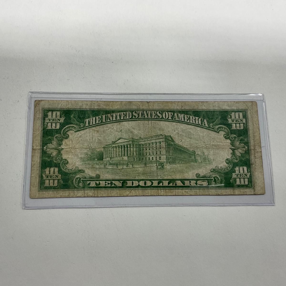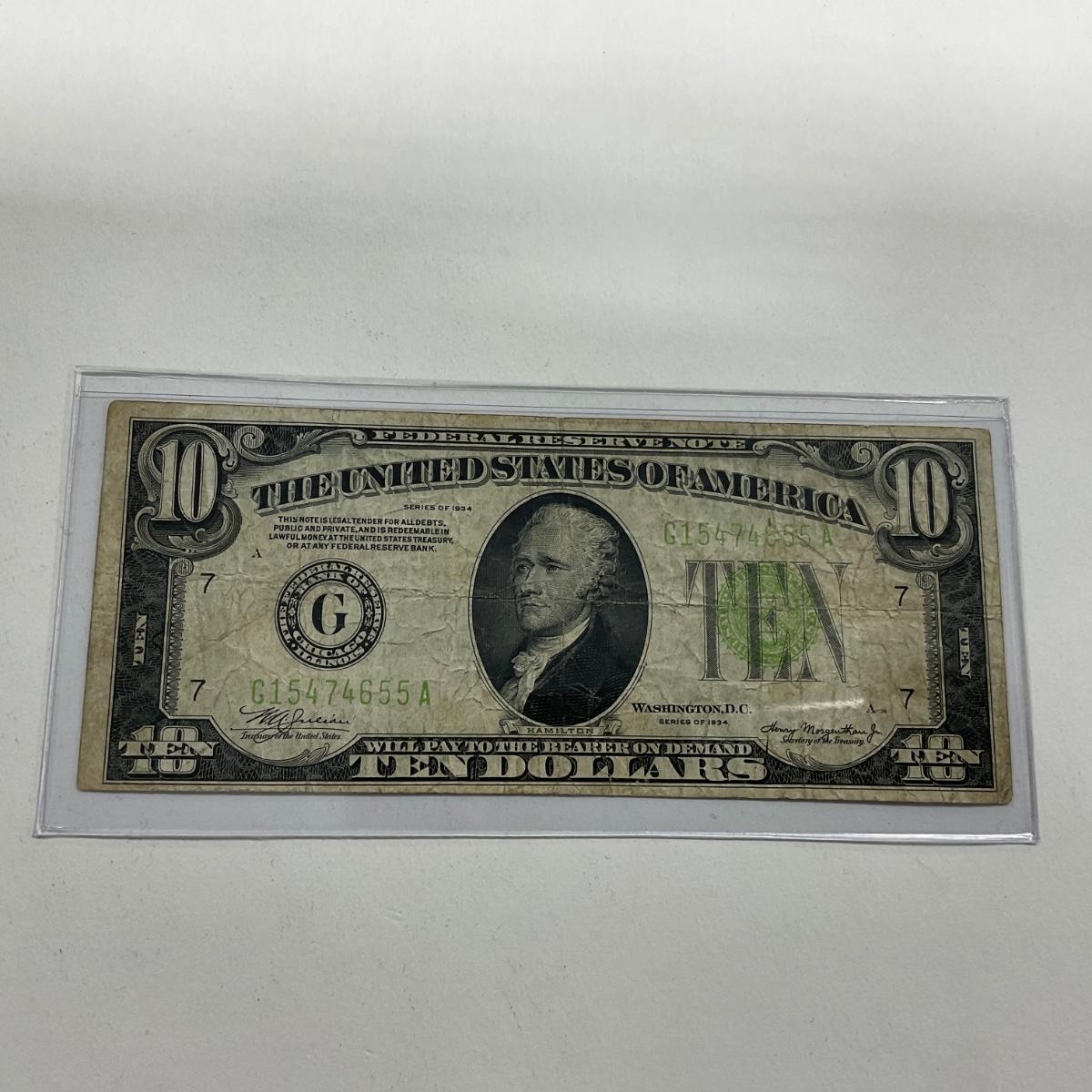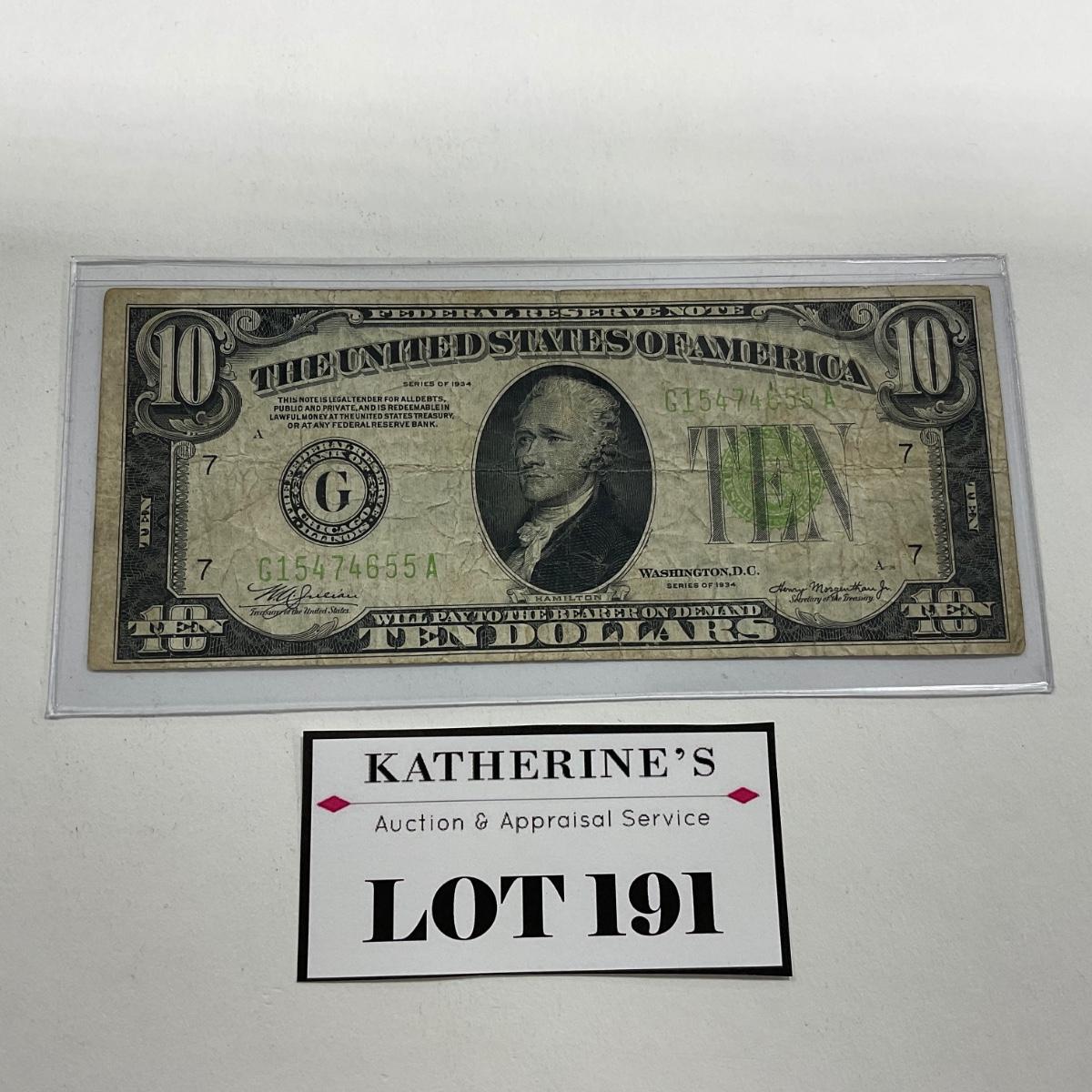 One ten dollar 1934 federal reserve light seal “Lime” average circulation. Please see photos for details and condition. ::: Shipping is available on this lot. If you require shipping you must let us know at the close of the auction. We will coordinate with you after the item has been won. Shipping fees will include insurance up to or exceeding the value of all items being mailed. If you have any questions regarding this lot please contact the auctioneer either via this website, by direct email or by phone. PICK UP TIMES and other important information can be found in the TERMS and DESCRIPTION of the auction. Please take a look for pertinent information. Thanks!