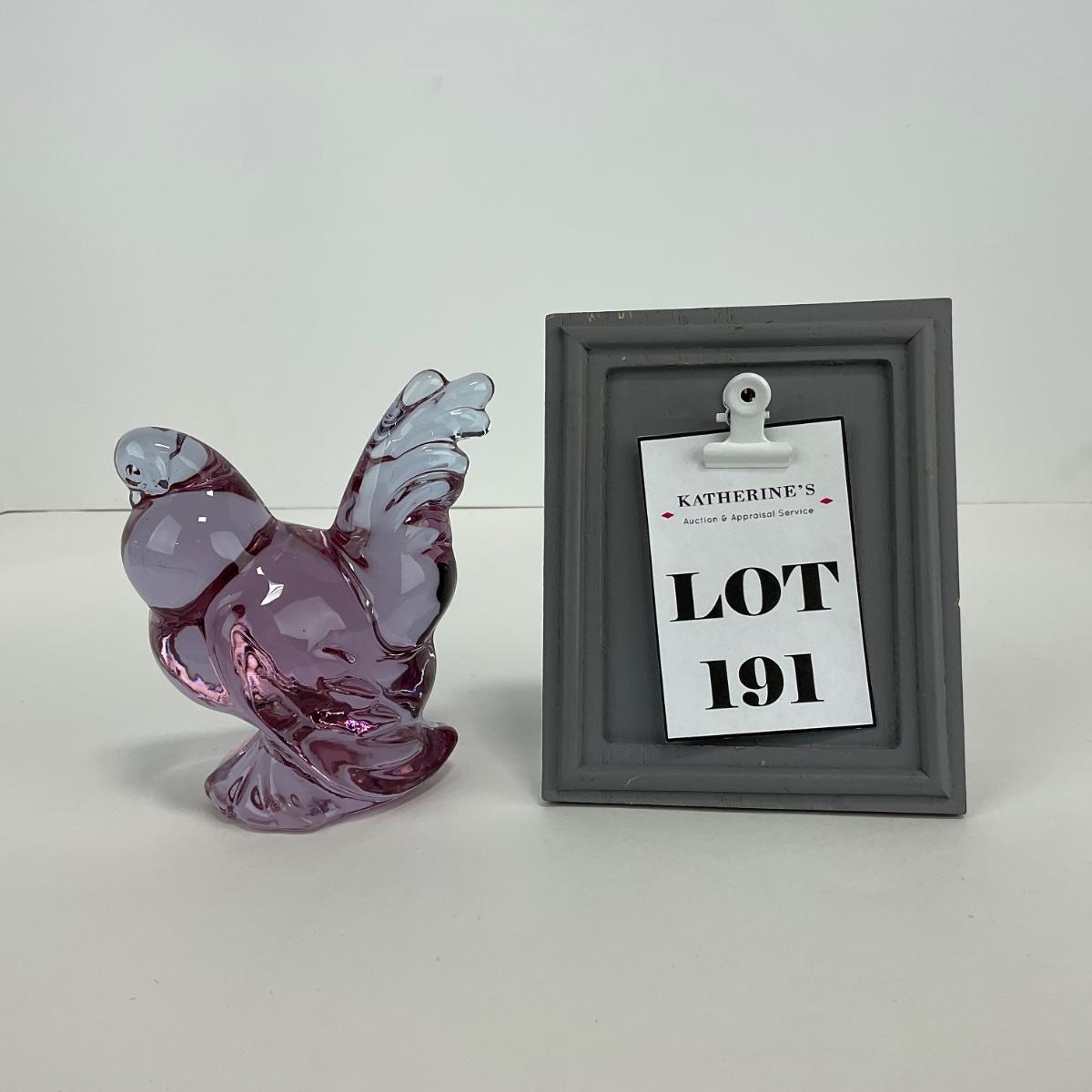 One Heisey by Imperial marked lavender ice hen figure. This piece has no damage, and appears to be in great shape with no visable chips, cracks, or broken pieces. 3 1/2 inches wide by 4 1/4 inches tall. Please see photos for details and condition. Any condition statement is given as a courtesy to a client, is an opinion, and should not be treated as a statement of fact. Reference to condition written, oral or within a condition report shall not be regarded as a full account of condition and may not include all defects, alterations, or restorations. Absence of a condition report does not imply a lot is flawless or lacking imperfections or damage. Katherine’s Auction & Appraisal Service shall have no responsibility for any error or omission. Returns shall not be accepted on the basis of condition. ::: Shipping is available on this lot. If you require shipping you must let us know at the close of the auction. We will coordinate with you after the item has been won. Shipping fees will include insurance up to or exceeding the value of all items being mailed. If you have any questions regarding this lot please contact the auctioneer either via this website, by direct email or by phone. PICK UP TIMES and other important information can be found in the TERMS and DESCRIPTION of the auction. Please take a look for pertinent information. Thanks!