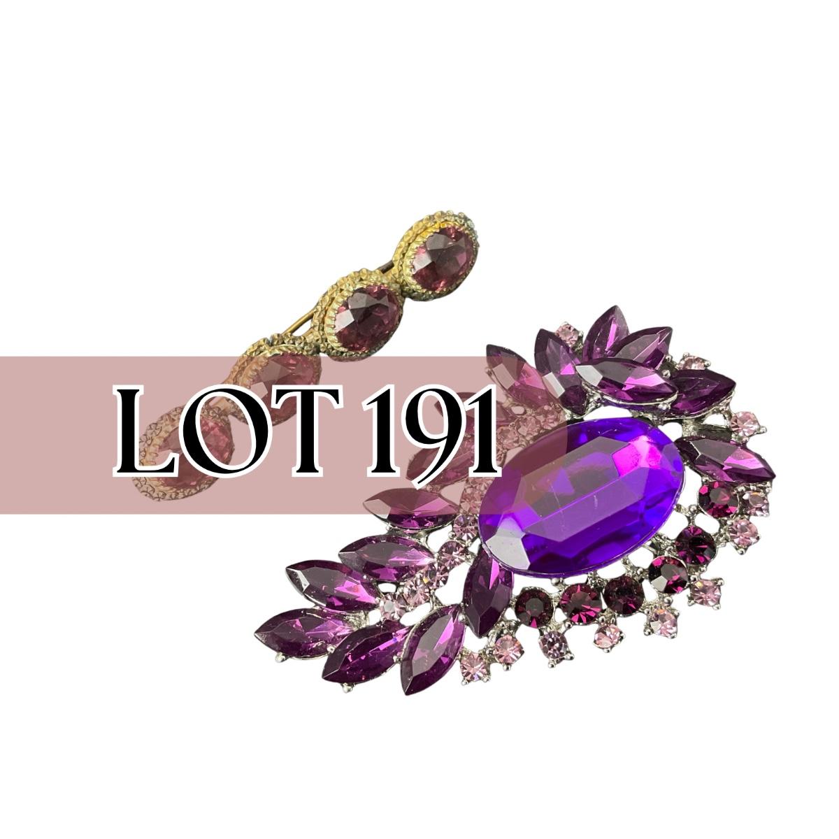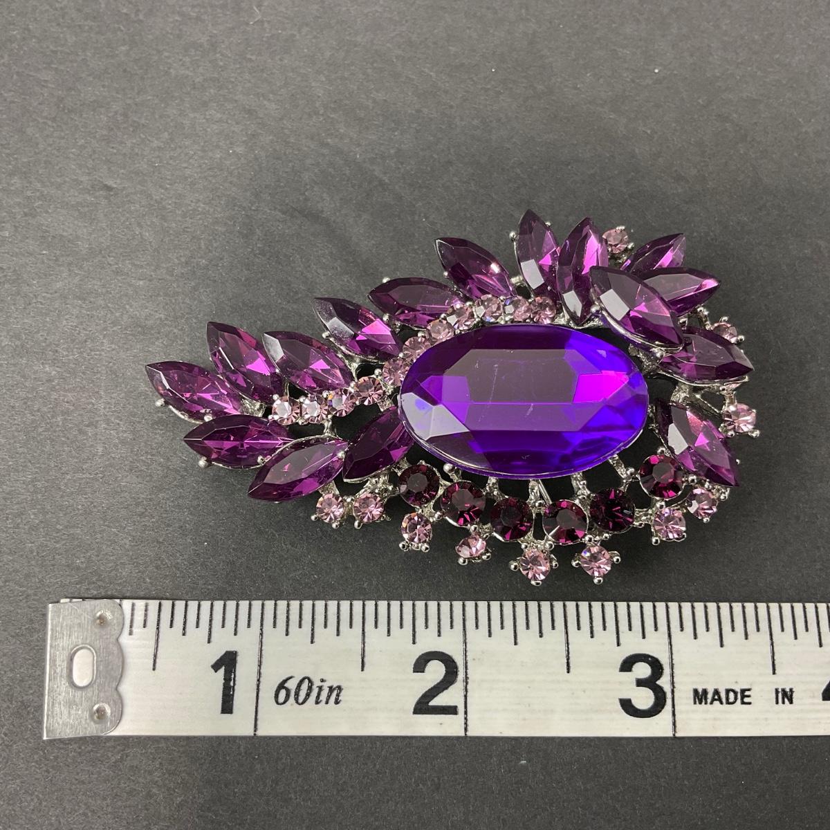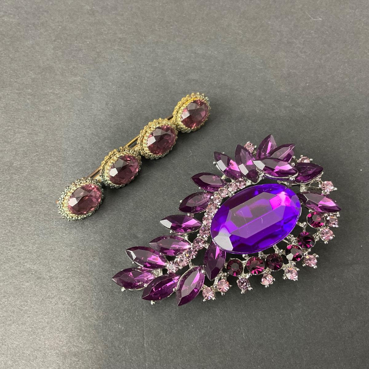 Two unique purple rhinestone brooches. Please see photos for details and condition. Any condition statement is given as a courtesy to a client, is an opinion, and should not be treated as a statement of fact. Reference to condition written, oral or within a condition report shall not be regarded as a full account of condition and may not include all defects, alterations, or restorations. Absence of a condition report does not imply a lot is flawless or lacking imperfections or damage. Katherine’s Auction & Appraisal Service shall have no responsibility for any error or omission. Returns shall not be accepted on the basis of condition. ::: Shipping is available on this lot. If you require shipping you must let us know at the close of the auction. We will coordinate with you after the item has been won. Shipping fees will include insurance up to or exceeding the value of all items being mailed. If you have any questions regarding this lot please contact the auctioneer either via this website, by direct email or by phone. PICK UP TIMES and other important information can be found in the TERMS and DESCRIPTION of the auction. Please take a look for pertinent information. Thanks!