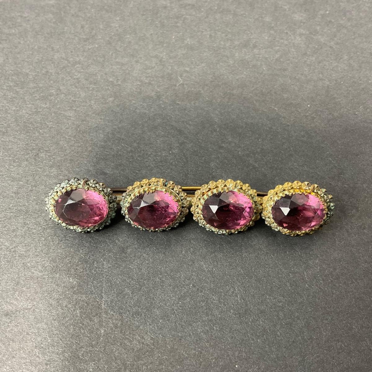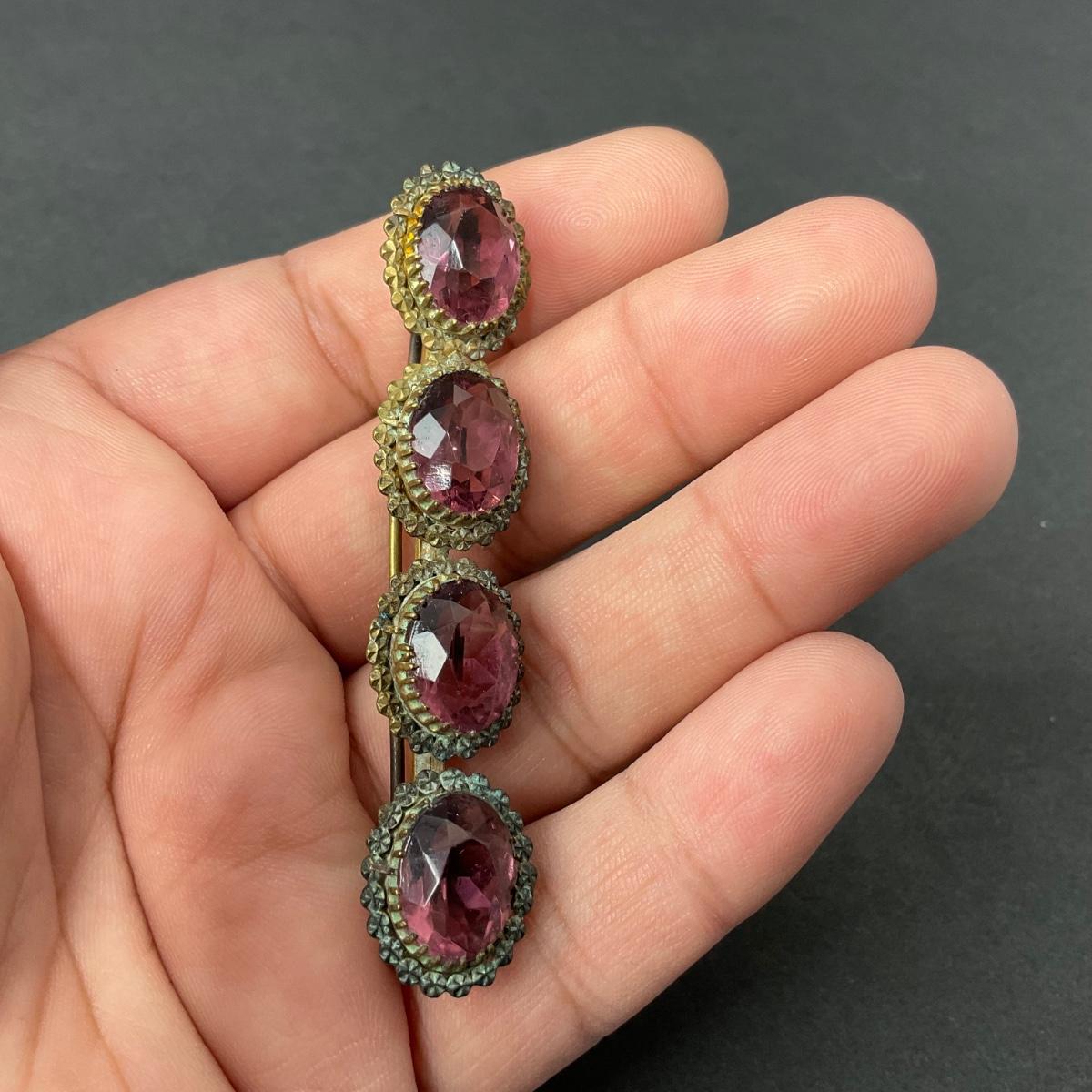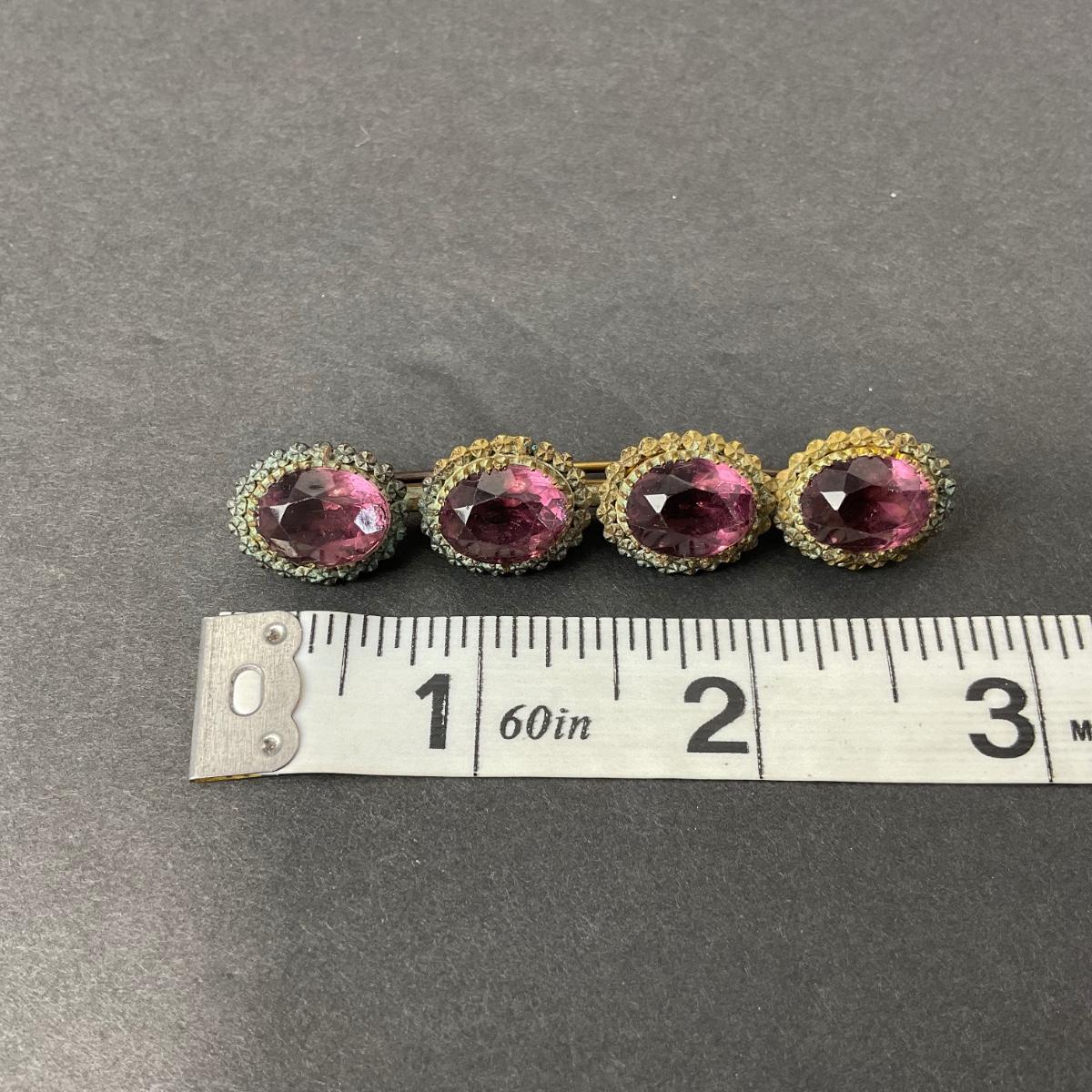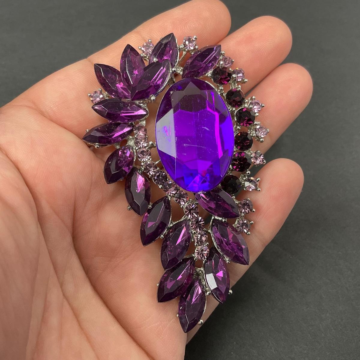 Two unique purple rhinestone brooches. Please see photos for details and condition. Any condition statement is given as a courtesy to a client, is an opinion, and should not be treated as a statement of fact. Reference to condition written, oral or within a condition report shall not be regarded as a full account of condition and may not include all defects, alterations, or restorations. Absence of a condition report does not imply a lot is flawless or lacking imperfections or damage. Katherine’s Auction & Appraisal Service shall have no responsibility for any error or omission. Returns shall not be accepted on the basis of condition. ::: Shipping is available on this lot. If you require shipping you must let us know at the close of the auction. We will coordinate with you after the item has been won. Shipping fees will include insurance up to or exceeding the value of all items being mailed. If you have any questions regarding this lot please contact the auctioneer either via this website, by direct email or by phone. PICK UP TIMES and other important information can be found in the TERMS and DESCRIPTION of the auction. Please take a look for pertinent information. Thanks!