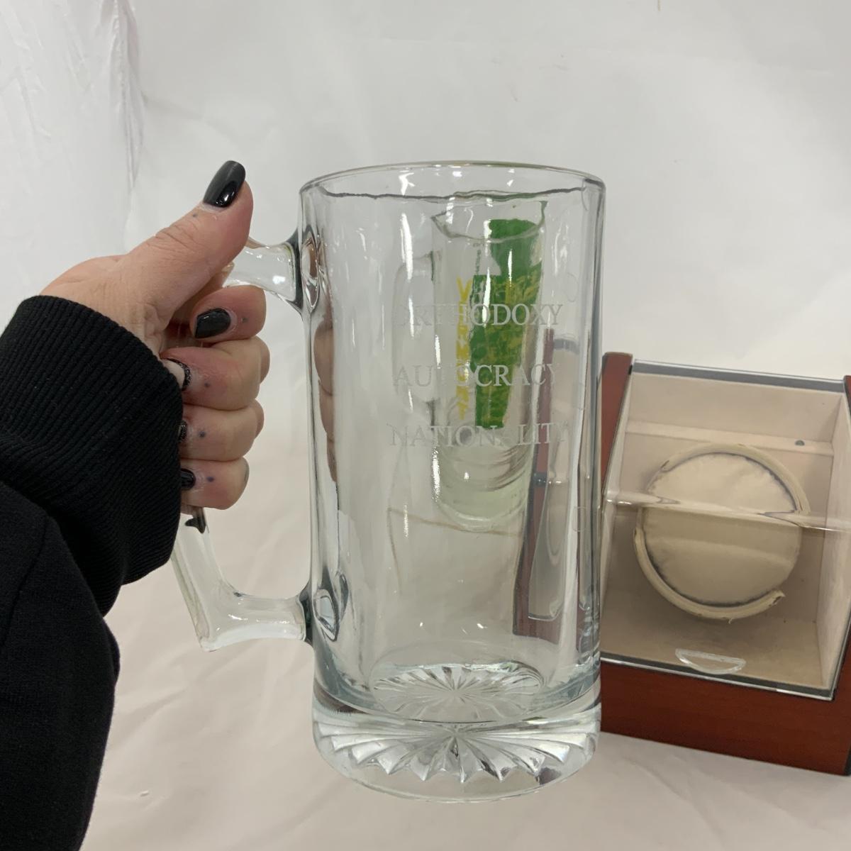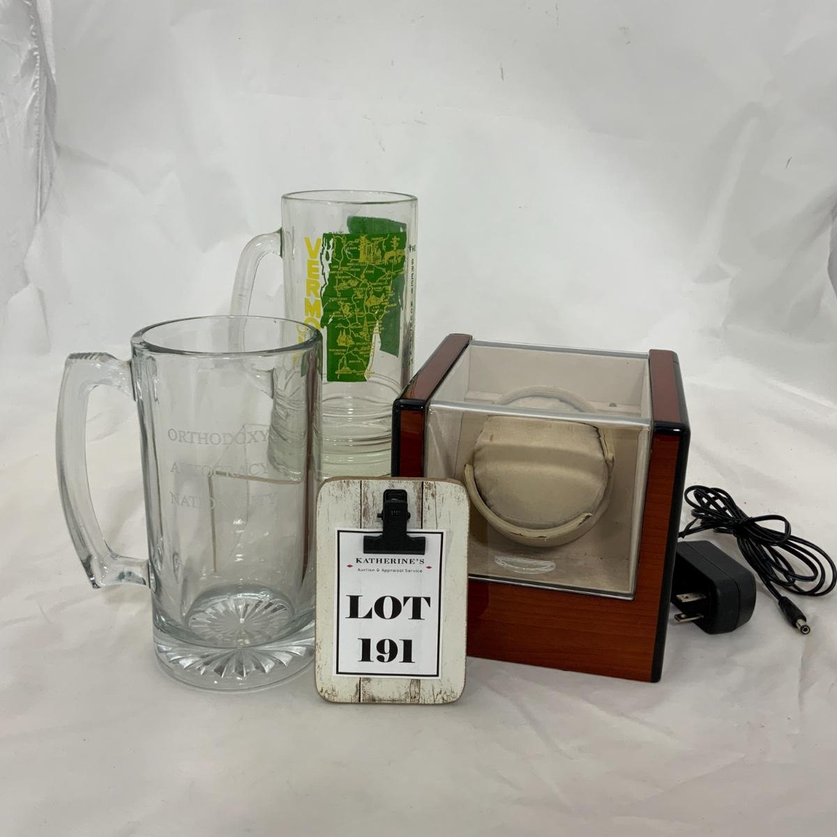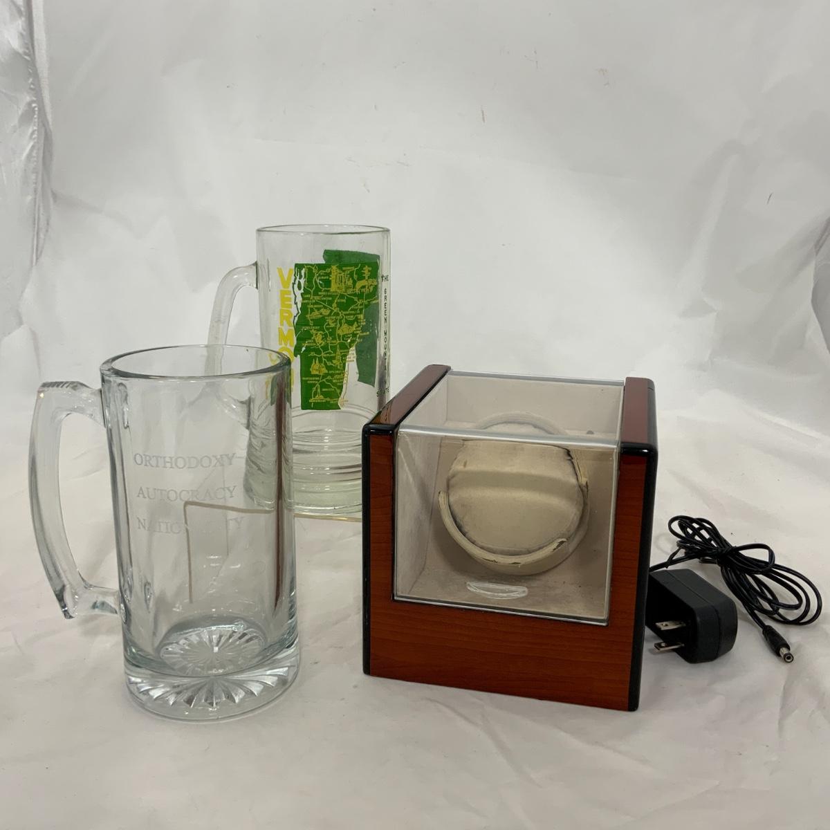 From the Estate of Peter and Alice Radovanovich: If you have a watch that you LOVE this is one lot that you need to invest in. This rotating watch display will turn 360 or 180 degrees, at varying speeds. It can be plugged into the wall, or run with batteries. Two large mugs to toast to your watch, One engraved “Orthodoxy Autocracy Nationality” and another one from Vermont. Please see photos for details and condition. ::: Shipping is NOT available on this lot. If you have any questions regarding this lot please contact the auctioneer either via this website, by direct email or by phone. PICK UP TIMES and other important information can be found in the TERMS and DESCRIPTION of the auction. Please take a look for pertinent information. Thanks!