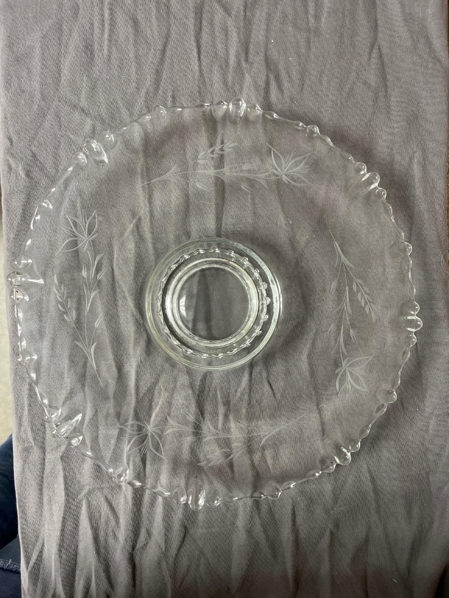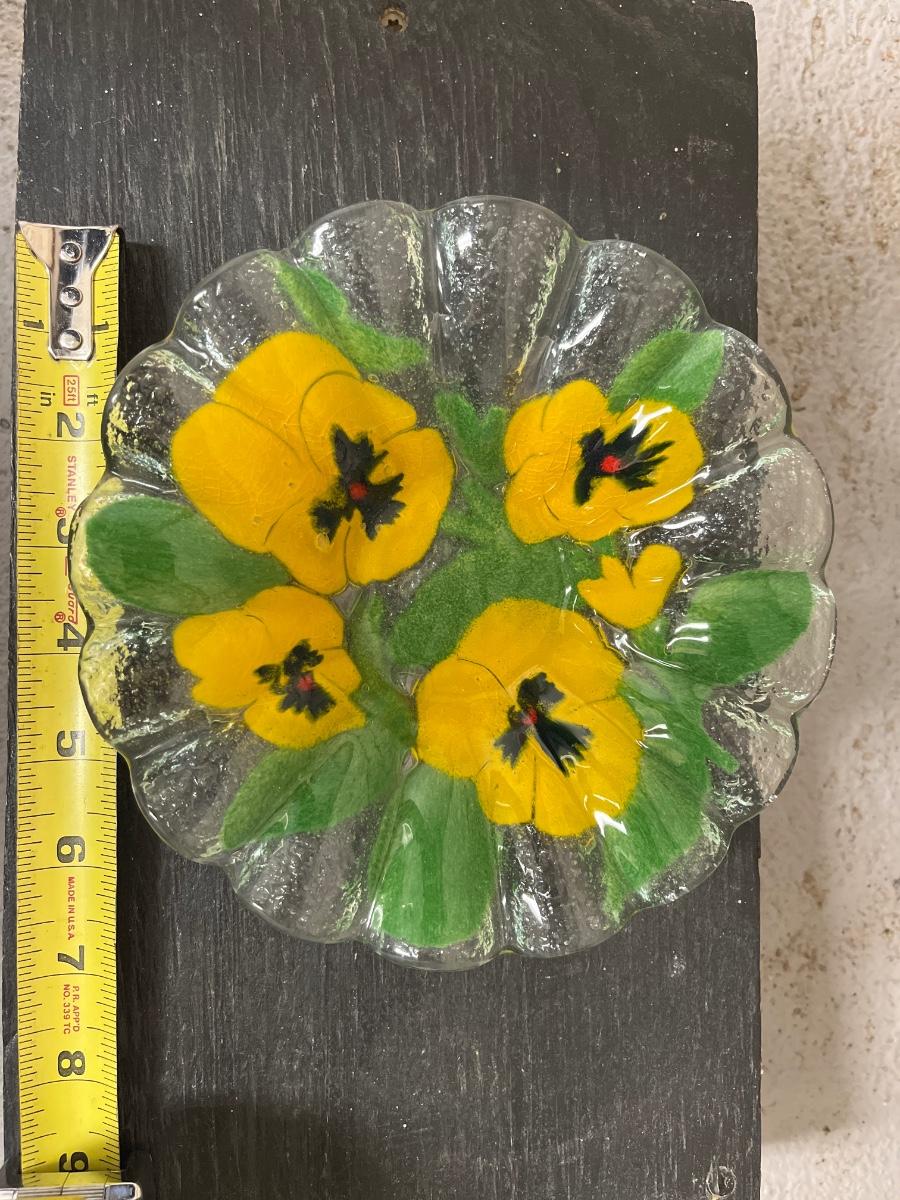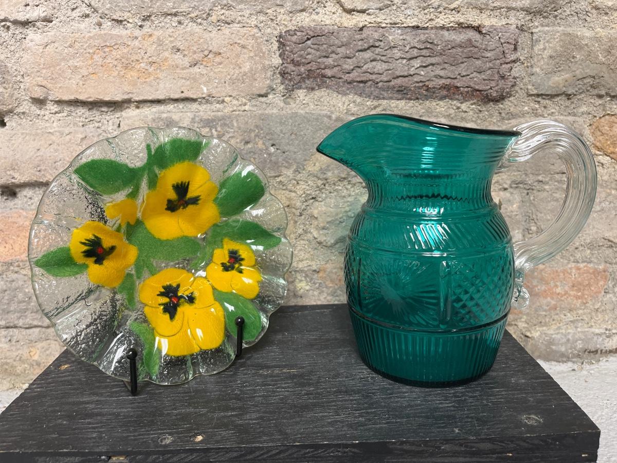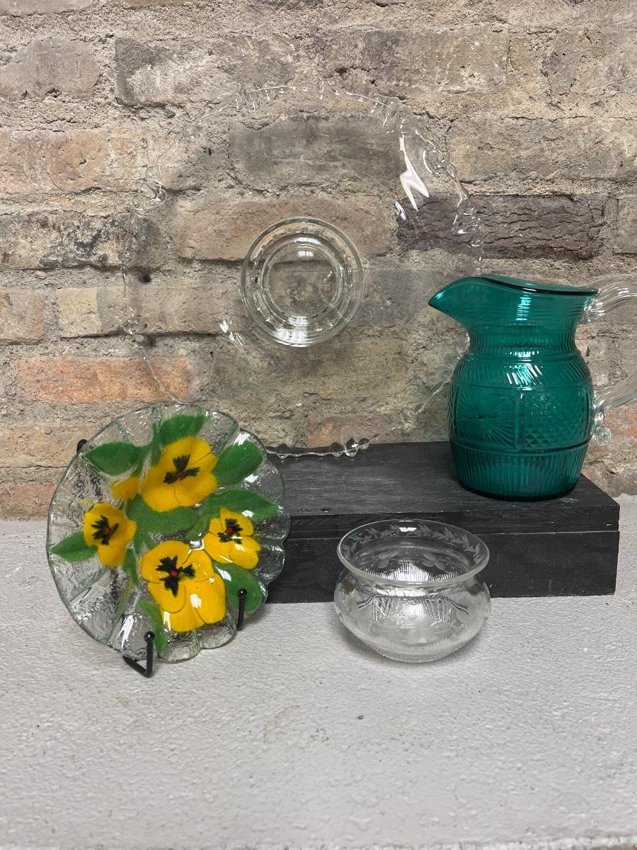 Etched cake plate Fostoria?, fused glass pansy dish, MOMA repro pitcher, Sinclair cut rose bowl. 1910 was an avid and discerning collector. There are multiple lots from 1910 in this auction, each unique and interesting.