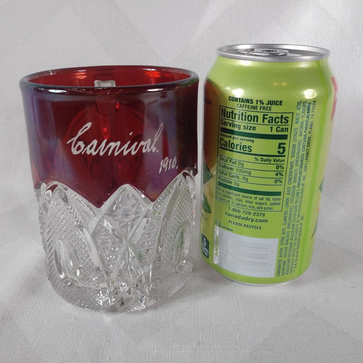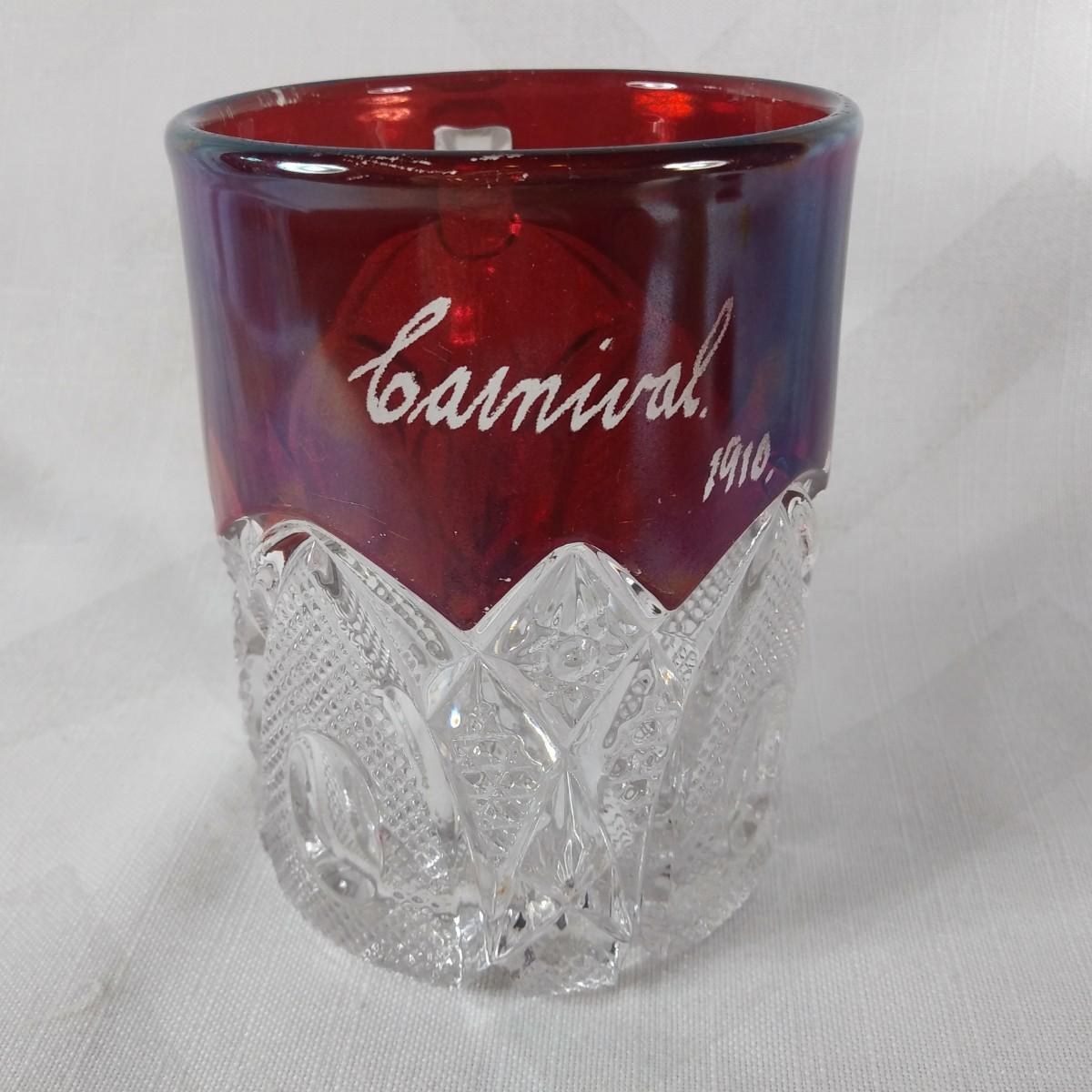 This auction lot is for a 1910 Ruby Flashed Glass Mug. This is a full-sized, heavy-pressed glass mug - Carnival 1910. Some of the Ruby flashing is slightly scratched consistent with age and use. This is an unusual size and shape for antique souvenir flashed glass. Would be a nice addition to your collection. There are no chips or cracks in the glass.