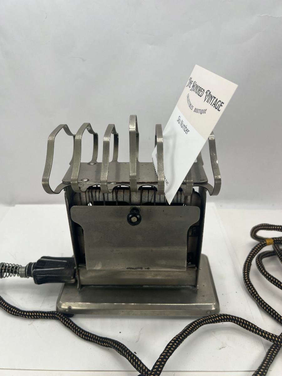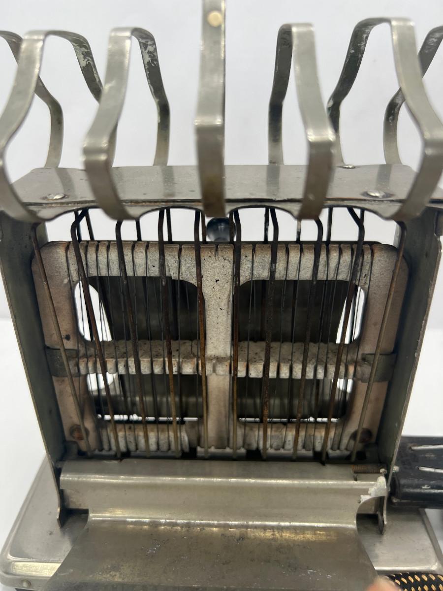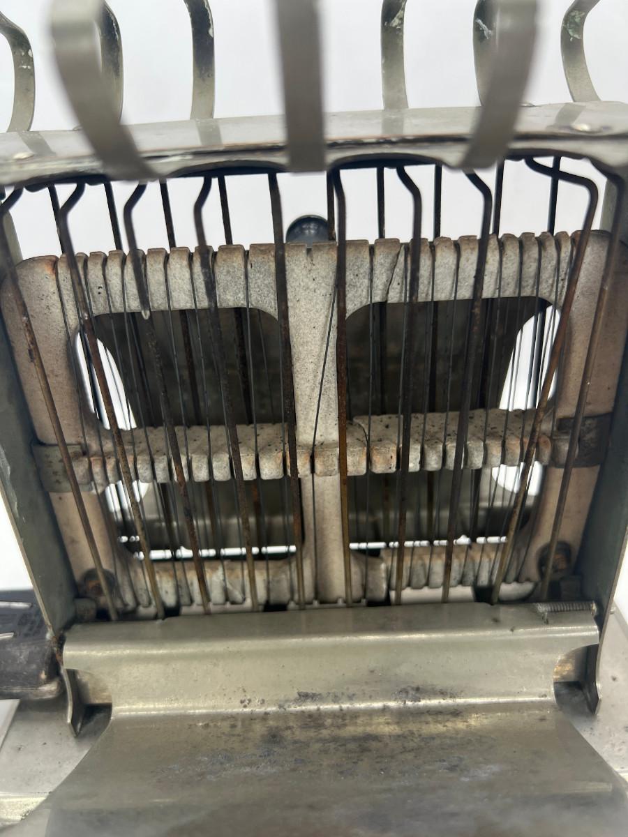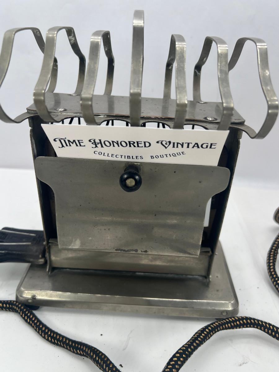A unique feature: a top rack to keep toast warm! This toaster was advertised as being “Convenient in the Breakfast Room, Sick Room, Apartment or Wherever there is an electric fixture”! And the “Keep Hot Rack Increases Its Capacity!” It is in fine display condition; the Bakelite knobs are in place
