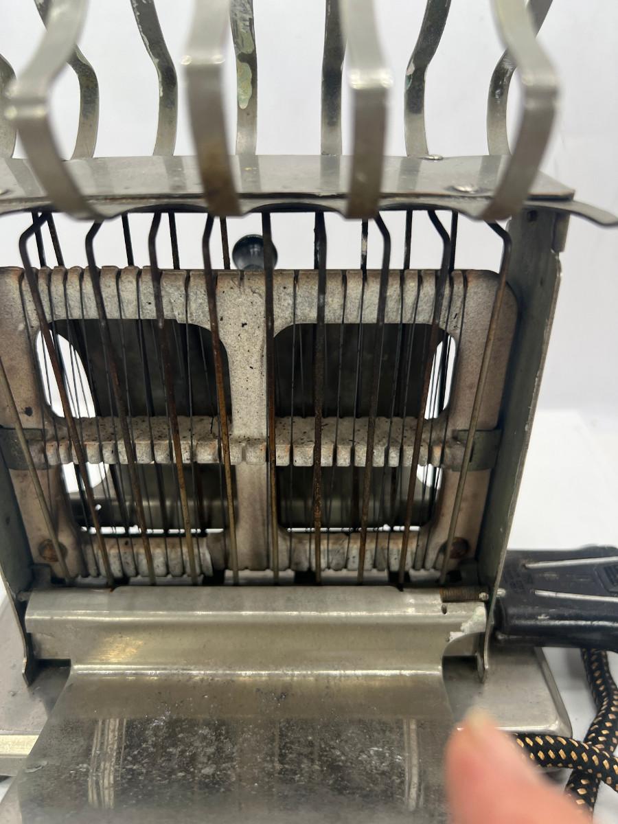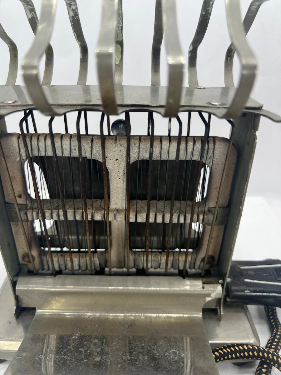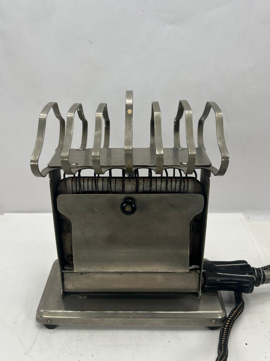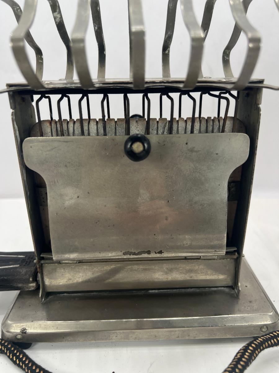 A unique feature: a top rack to keep toast warm! This toaster was advertised as being “Convenient in the Breakfast Room, Sick Room, Apartment or Wherever there is an electric fixture”! And the “Keep Hot Rack Increases Its Capacity!” It is in fine display condition; the Bakelite knobs are in place