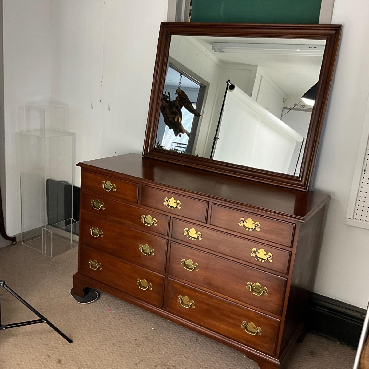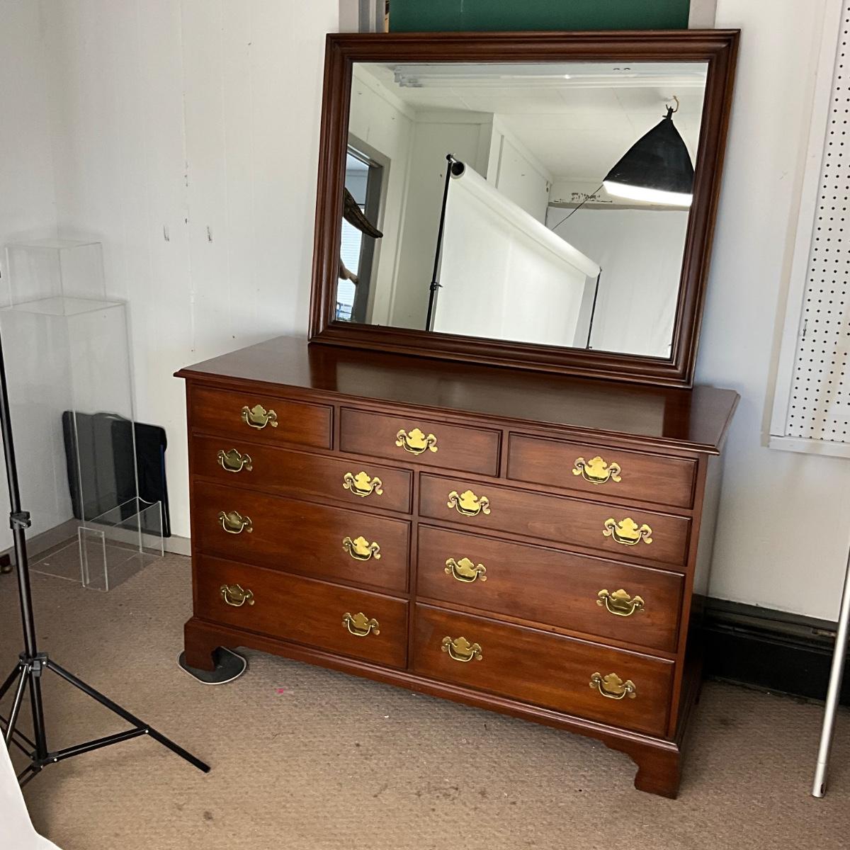 The 9 drawer dresser is marked Henkel Harris Black Cherry and measures 54.5"w x 20.5" deep x 34" high. The mirror that is included does not attach to the dresser it hangs on a wall , The mirror measures 44.5" x 34.5" x 2". and is mahogany