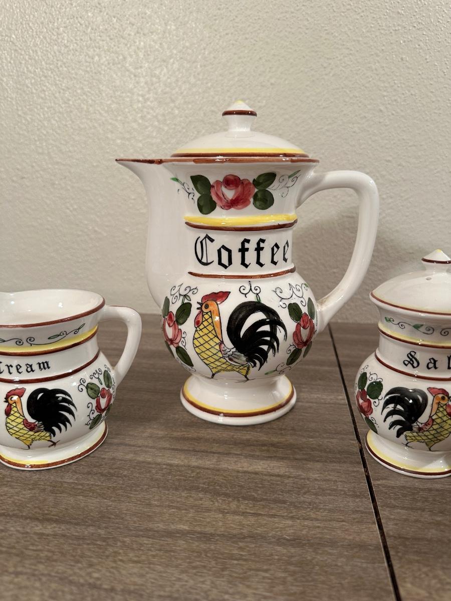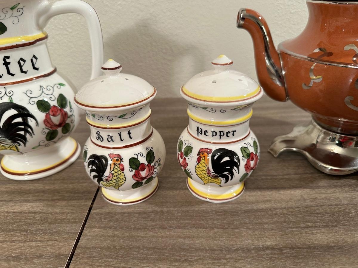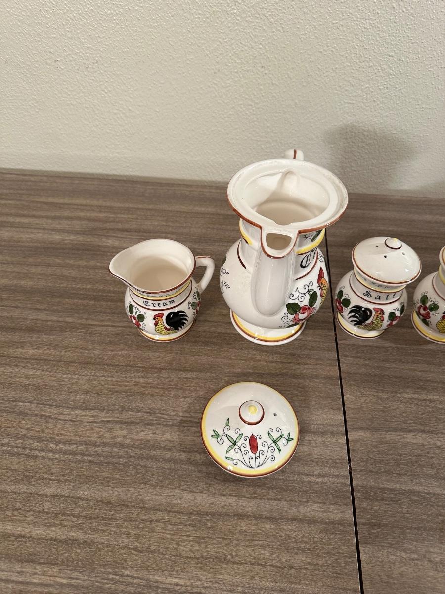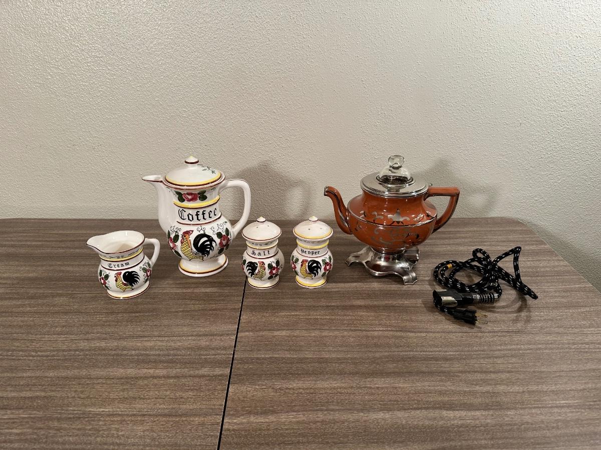 1912 ROYAL ROCHESTER ENAMEL PERCOLATOR AND CERAMIC TEAPOT, CREAMER AND SHAKERS