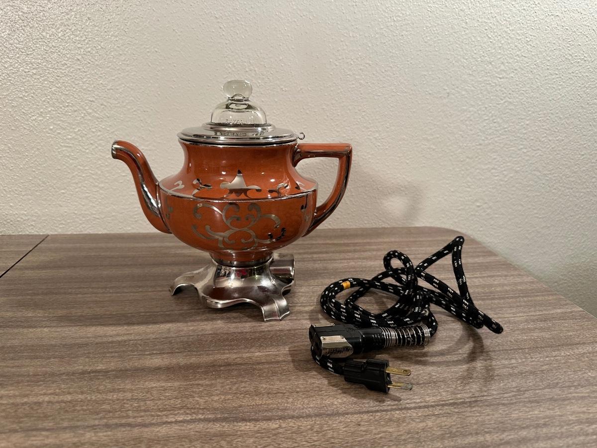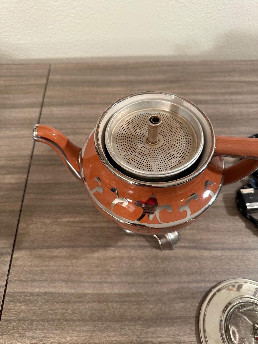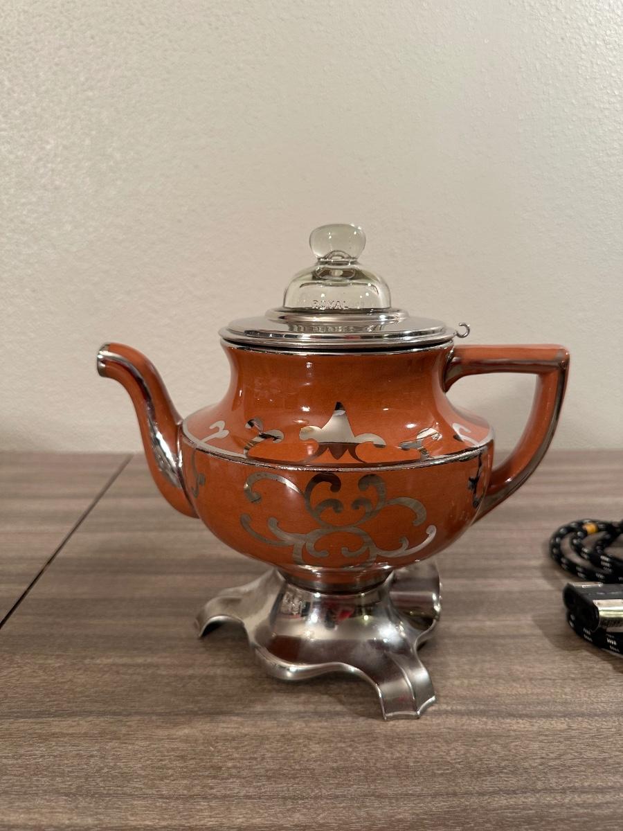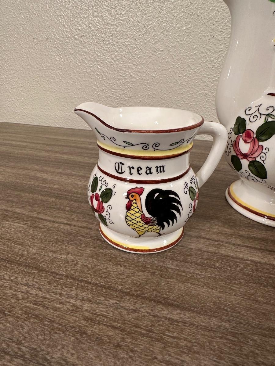 1912 ROYAL ROCHESTER ENAMEL PERCOLATOR AND CERAMIC TEAPOT, CREAMER AND SHAKERS