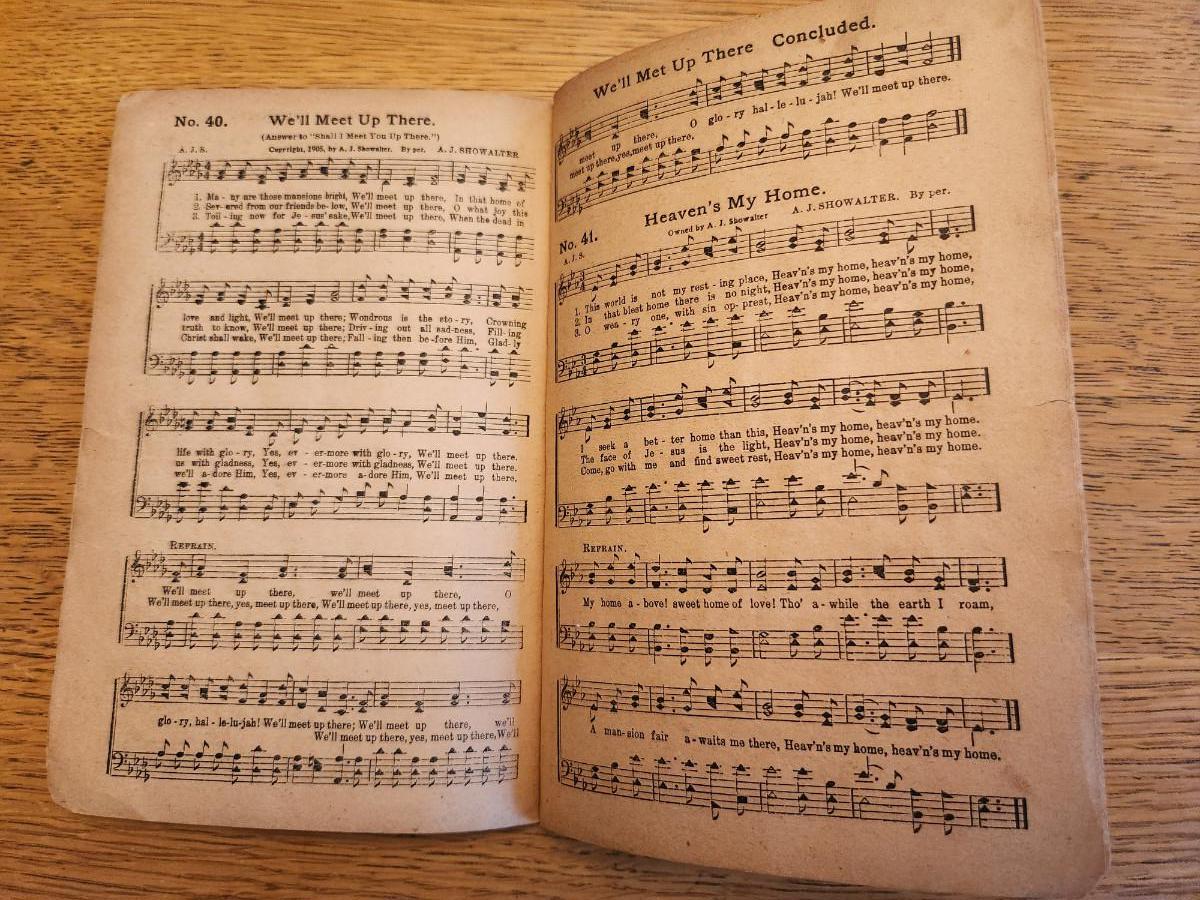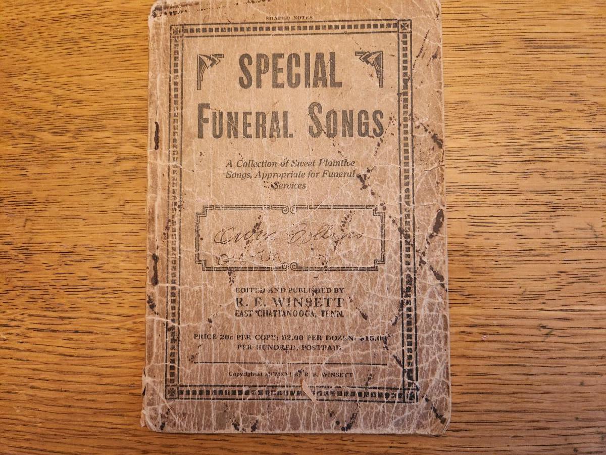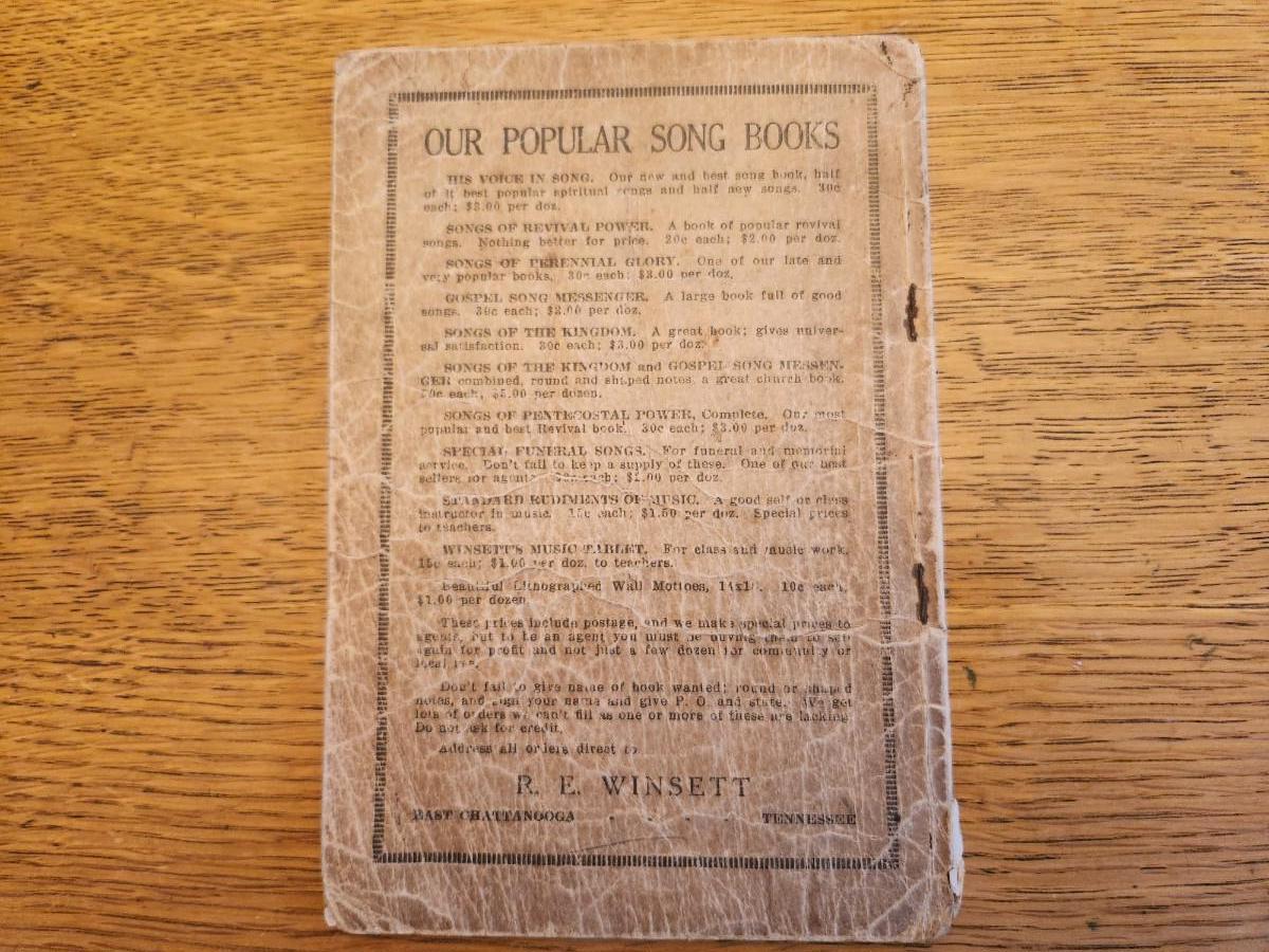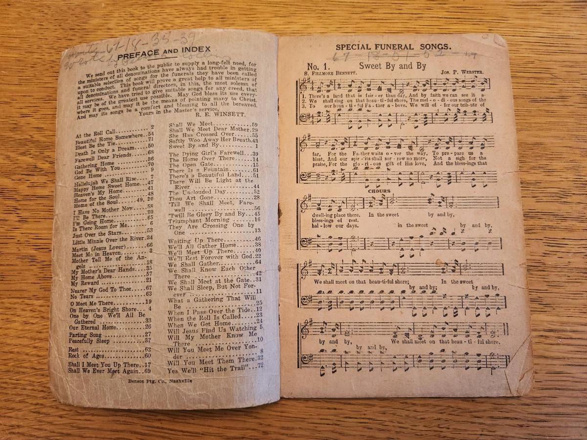 This auction lot is for an old, antique 1914 Funeral Songbook. Quite a find, has sung many a soul over the old river Jordan. The booklet was printed on acidic paper and is fragile - but very readable, Some cracking on pages and much wear on cover - see photos. A good find for your church organist friend!