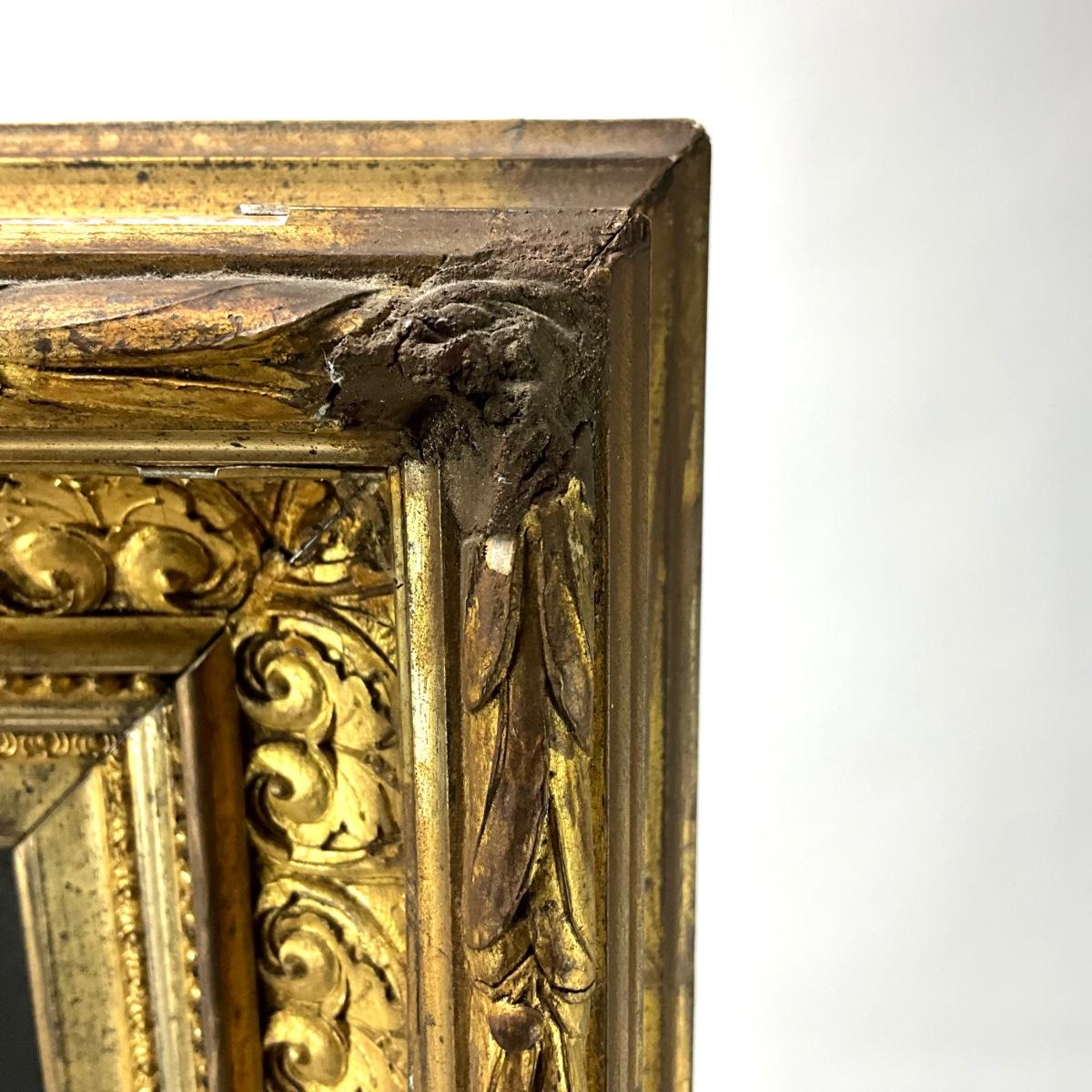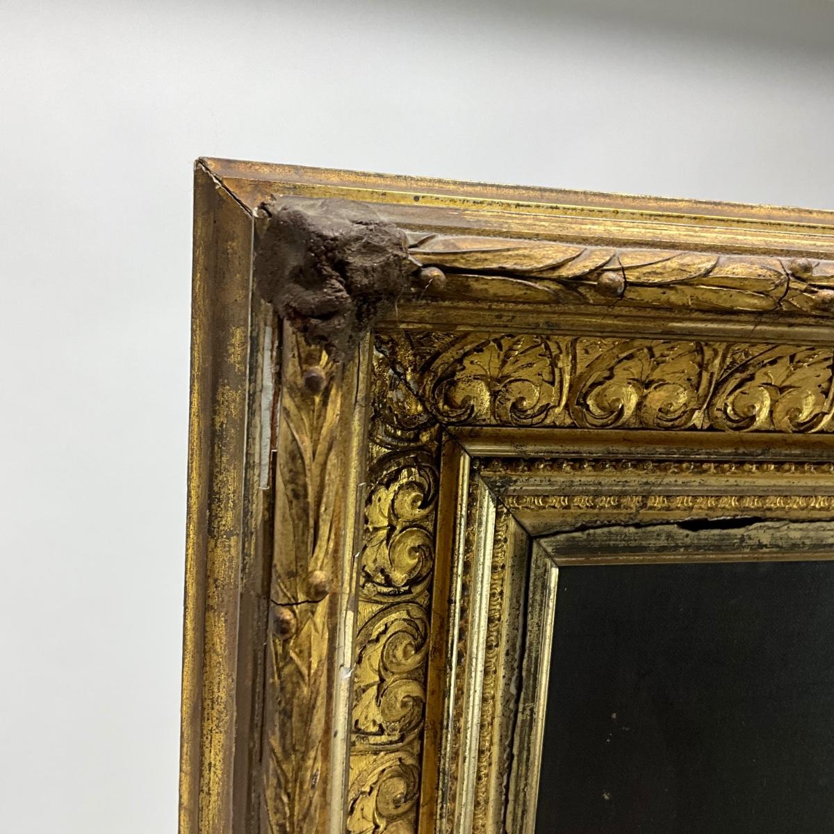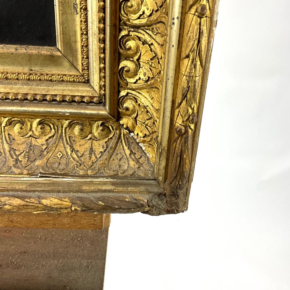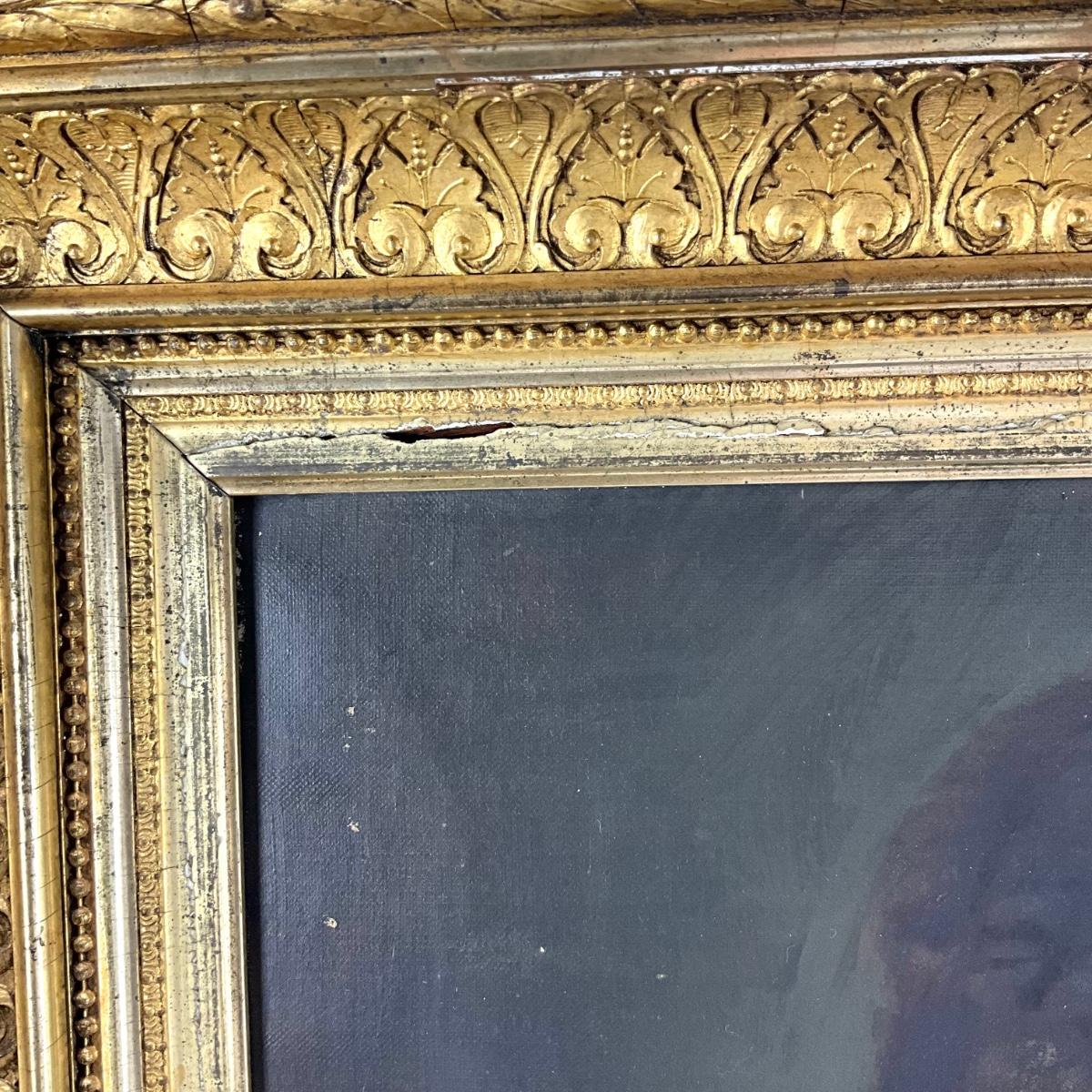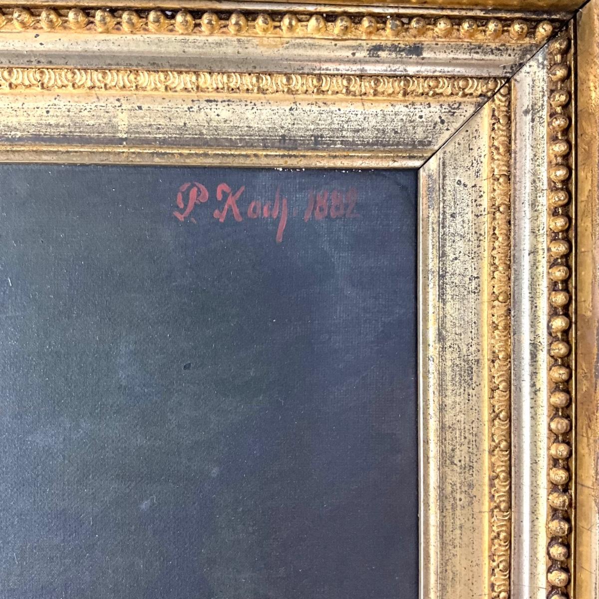 The oil portrait is in a gold gilt frame that has some wear and damage, there are repairs made to the corners of the frame that are visible. Portrait is dated 1882 and signed by P. Koch. The painting measures 20" wide x 24" high and the frame measures 27.5" wide x 32" high.