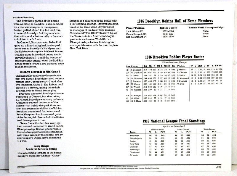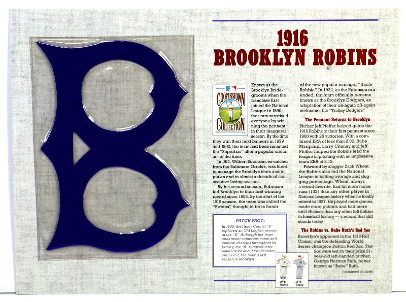 1916 Brooklyn Robins Official MLB Team Patch from Cooperstown Collection by Willabee & Ward, comes in protective sleeve with statistics and info card.