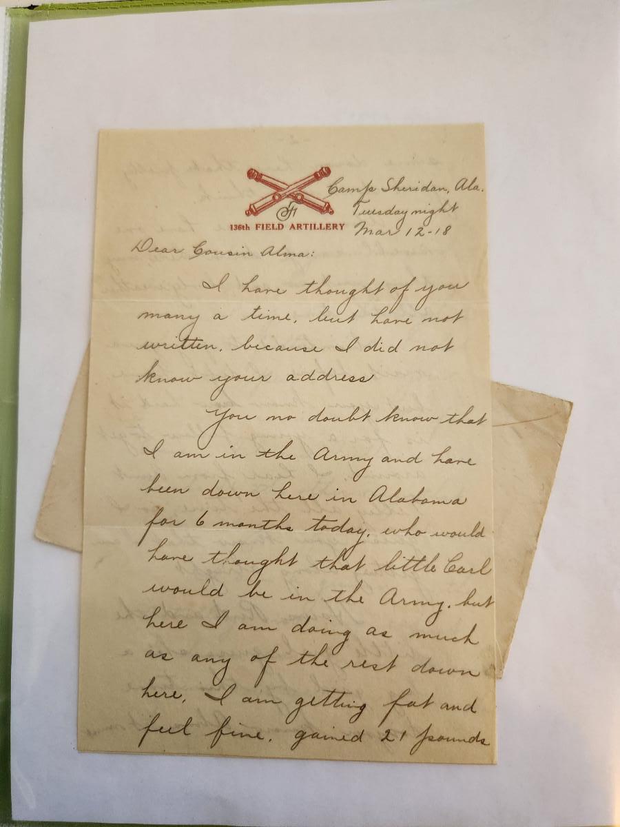 This auction lot is for a 1918 WWI Army Soldier's Letter. The letter is from a recruit stationed at Camp Sheridan in Alabama preparing to enter the combat. Letter was written in March of 1918 - the war did not end until November of that year, eight months later. This letter was found in the Tatman Family Bible.