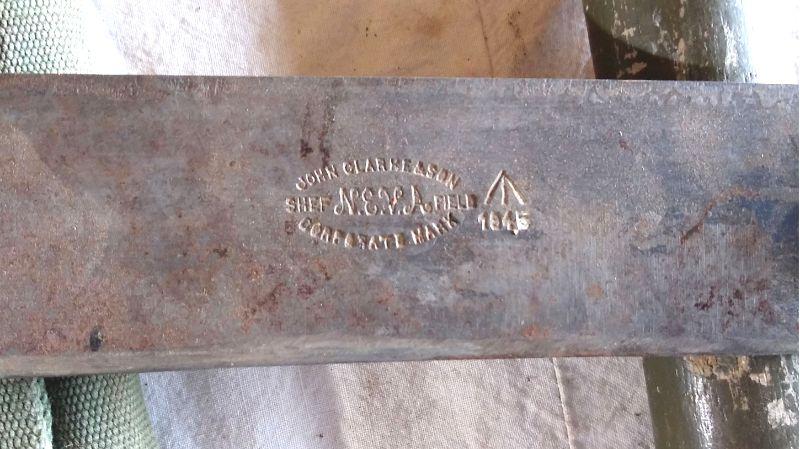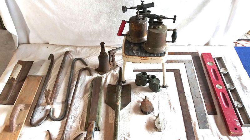 Machete by John Clarneason 1945, shef N.E.V.A. field Corporate mark, shovel, binoculars, torches, 2 hooks, crowbar, jack, 2 pulleys