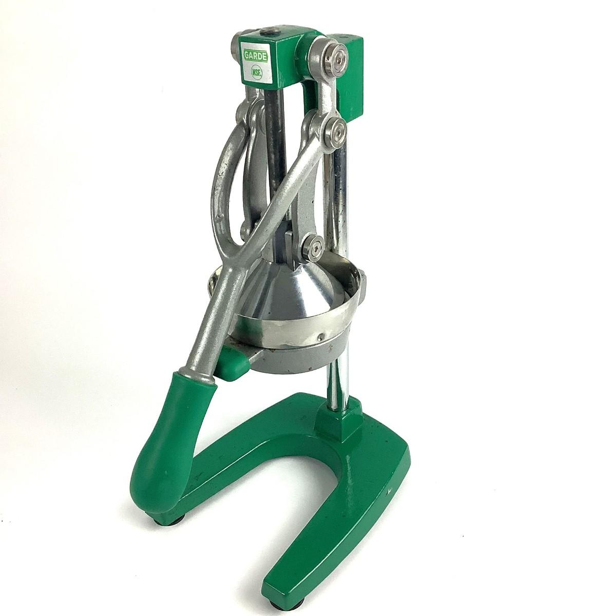 Heavy-duty Garde citrus juicer, ideal for commercial or home use. This professional-grade juicer features a sturdy cast iron base and an ergonomic handle, making it easy to extract maximum juice from oranges, lemons, limes, and more. Its green and silver design adds a splash of color to your kitchen. NSF certified for safety and durability, this juicer is perfect for cafes, restaurants, or juice enthusiasts.