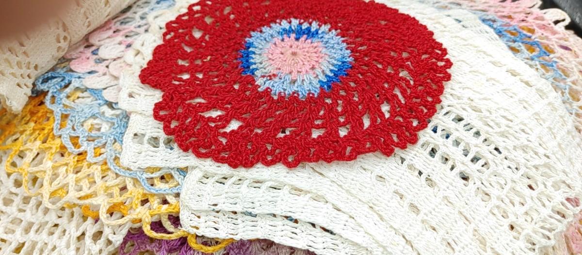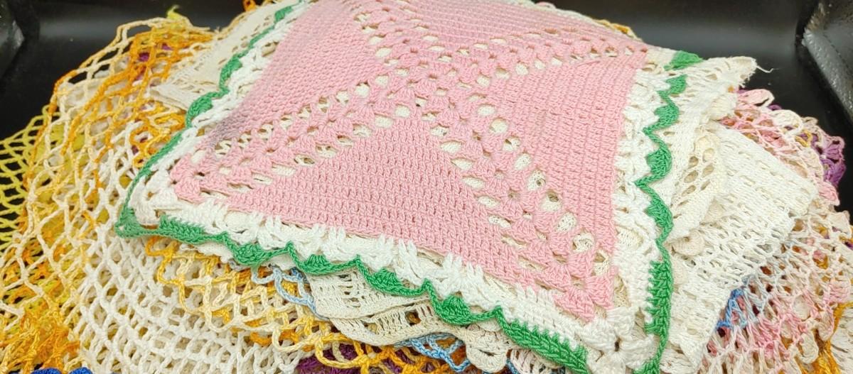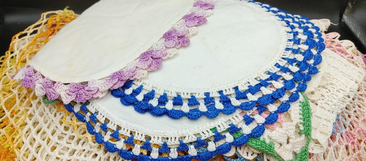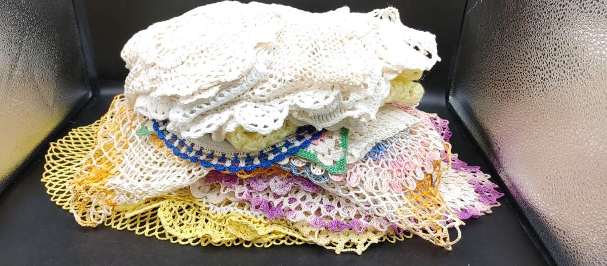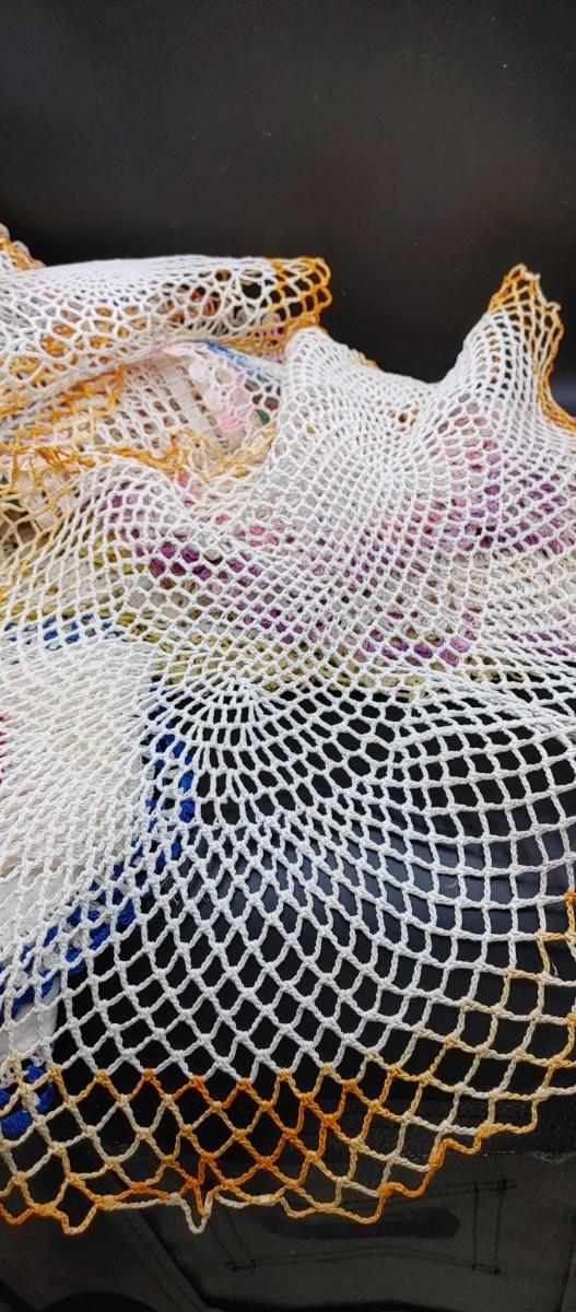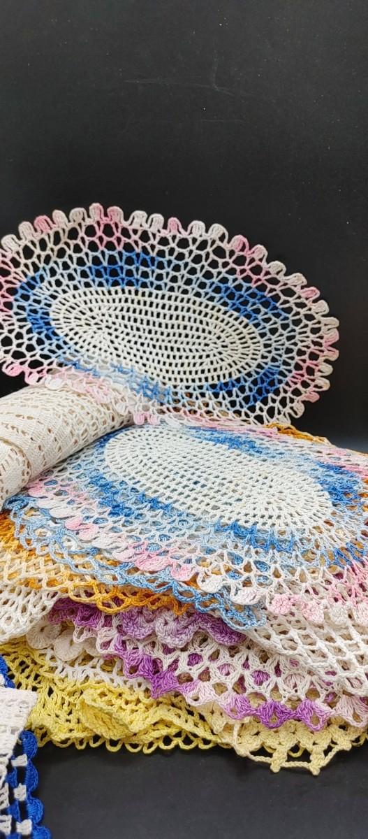 #192 (46) Vintage Hand Made colorful Doilies.. some are neutral beige color but most are colorful and many of them are starts extremely nice lot of vintage doilies.