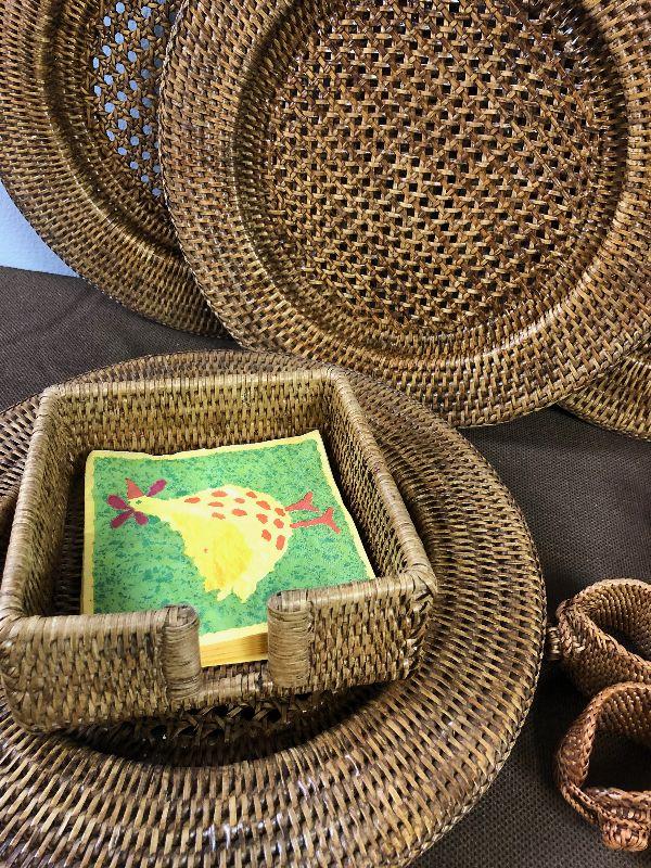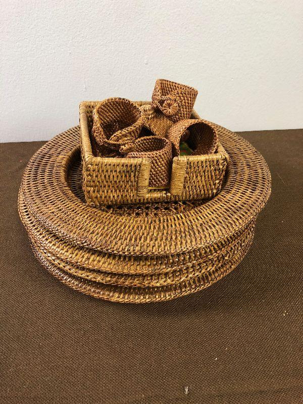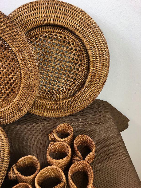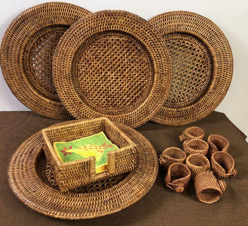 #192 4 Ratan Chargers, Napkin Rings & Holder