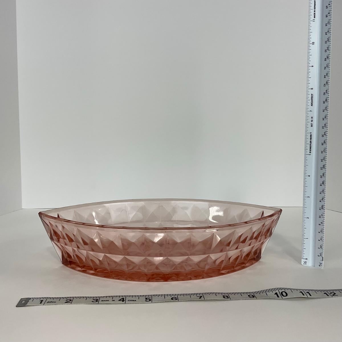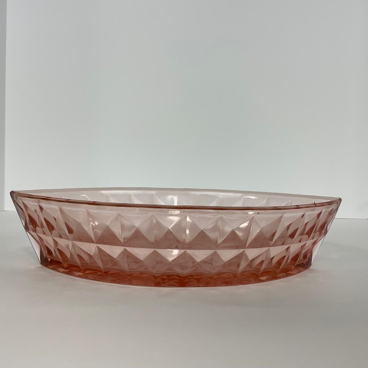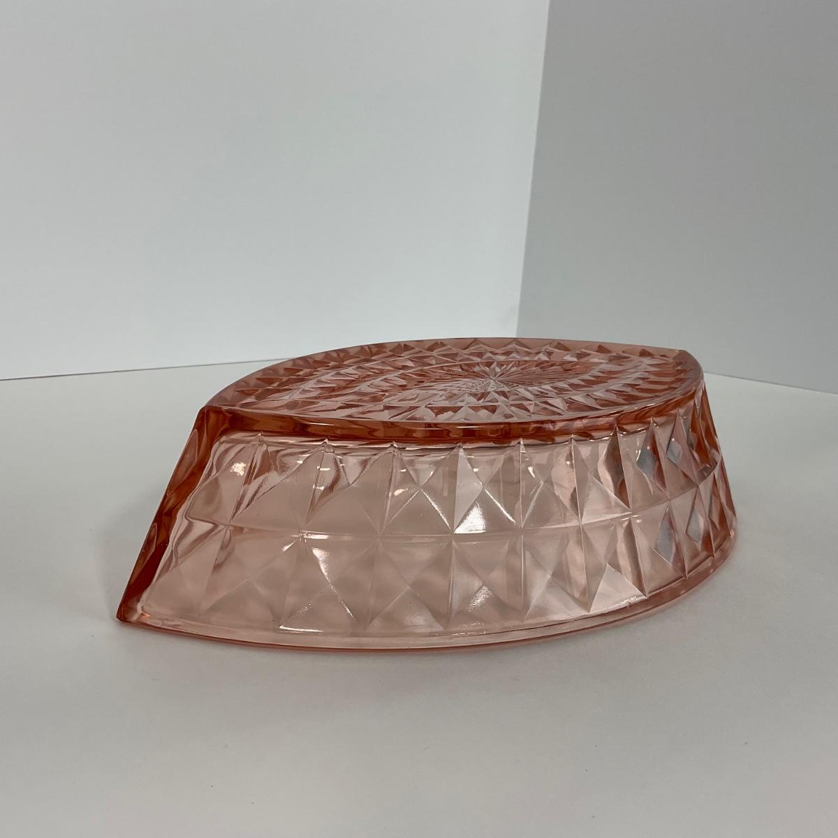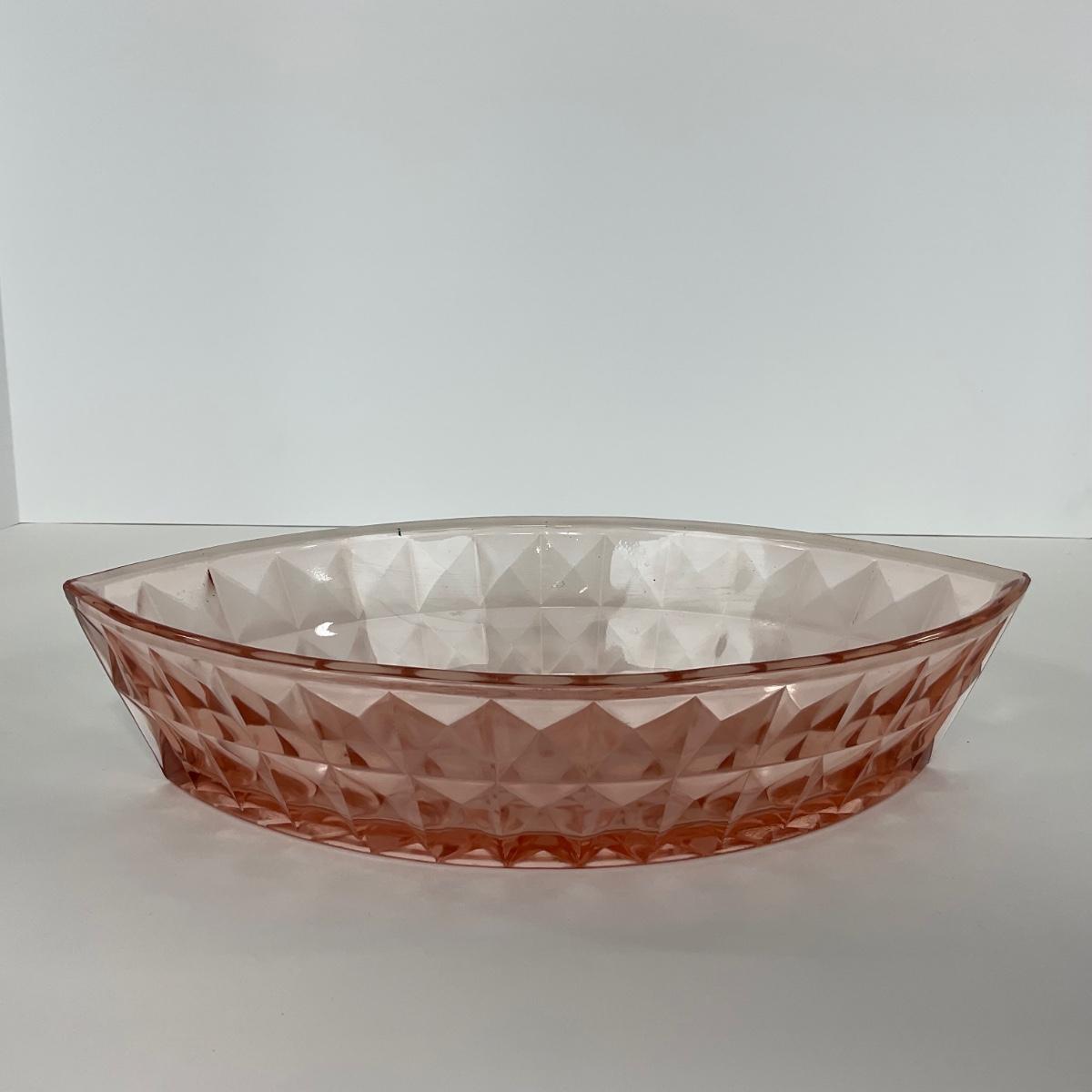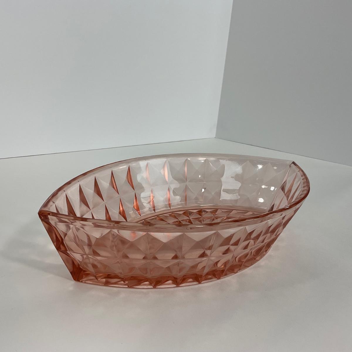 One pink Windsor Diamond Jeanette Glass Co. (1932-1946) boat dish. Please see photos for details and condition. ::: Shipping is available on this lot. If you require shipping you must let us know at the close of the auction. We will coordinate with you after the item has been won. Shipping fees will include insurance up to or exceeding the value of all items being mailed. If you have any questions regarding this lot please contact the auctioneer either via this website, by direct email or by phone. PICK UP TIMES and other important information can be found in the TERMS and DESCRIPTION of the auction. Please take a look for pertinent information. Thanks!