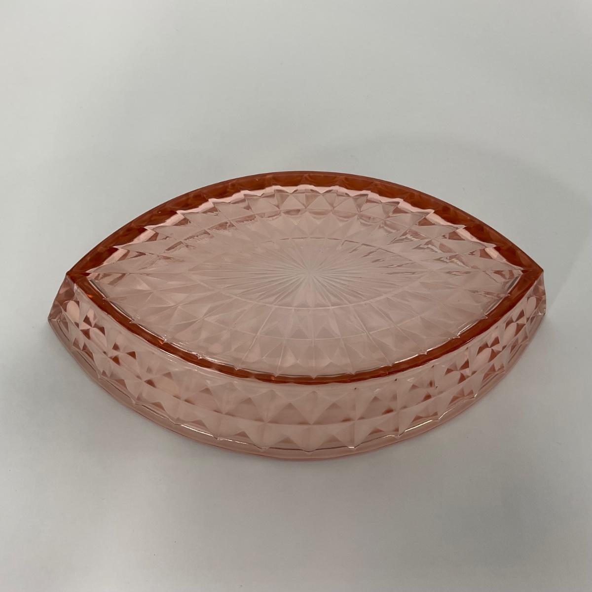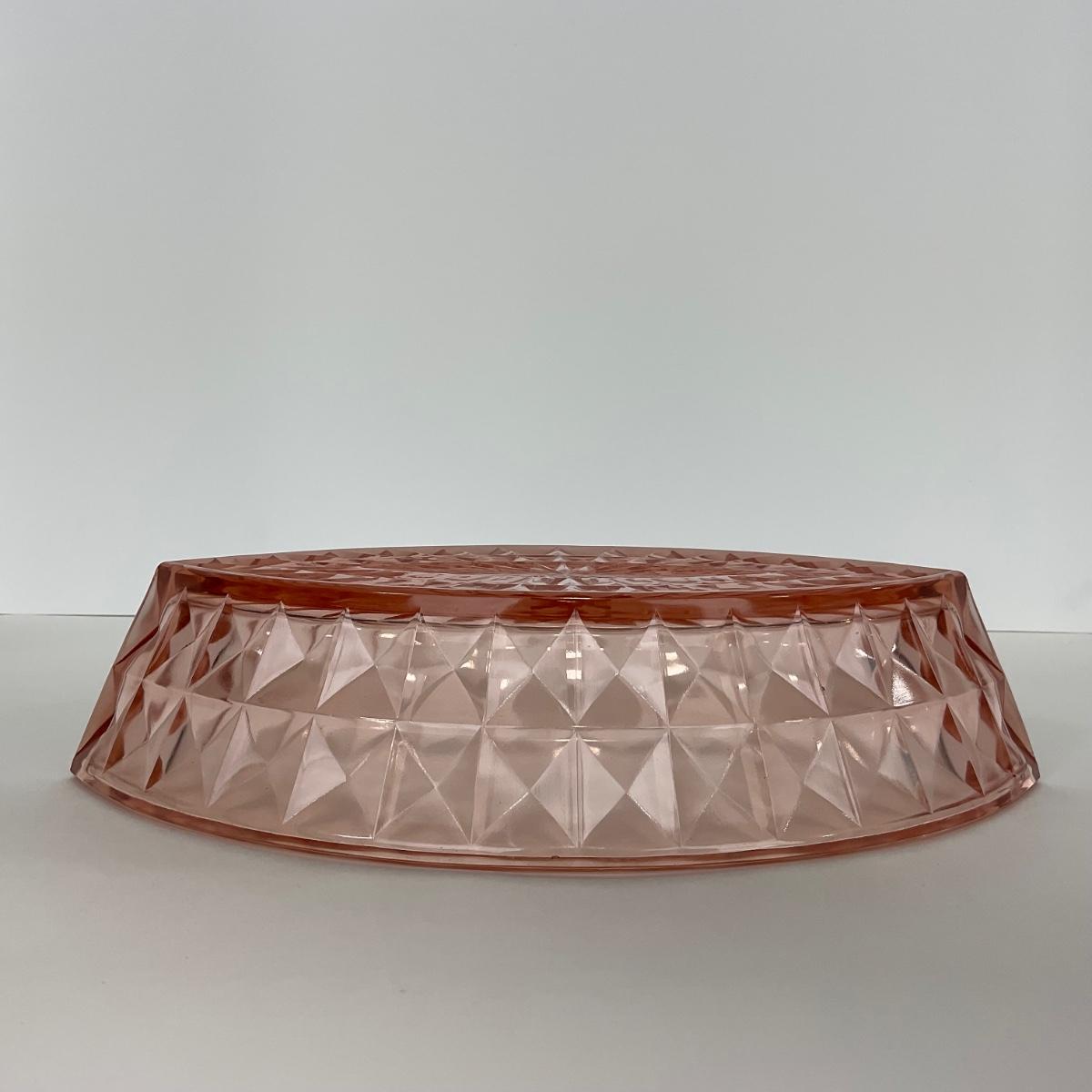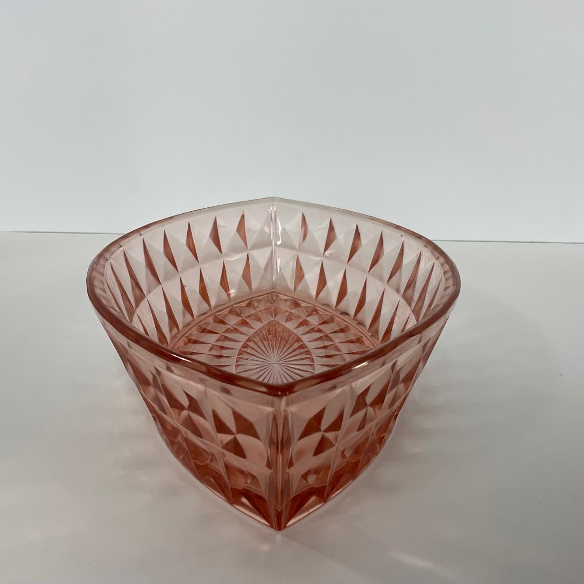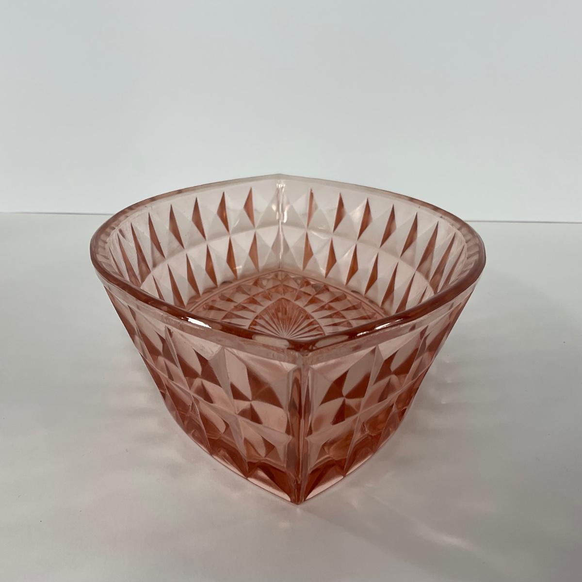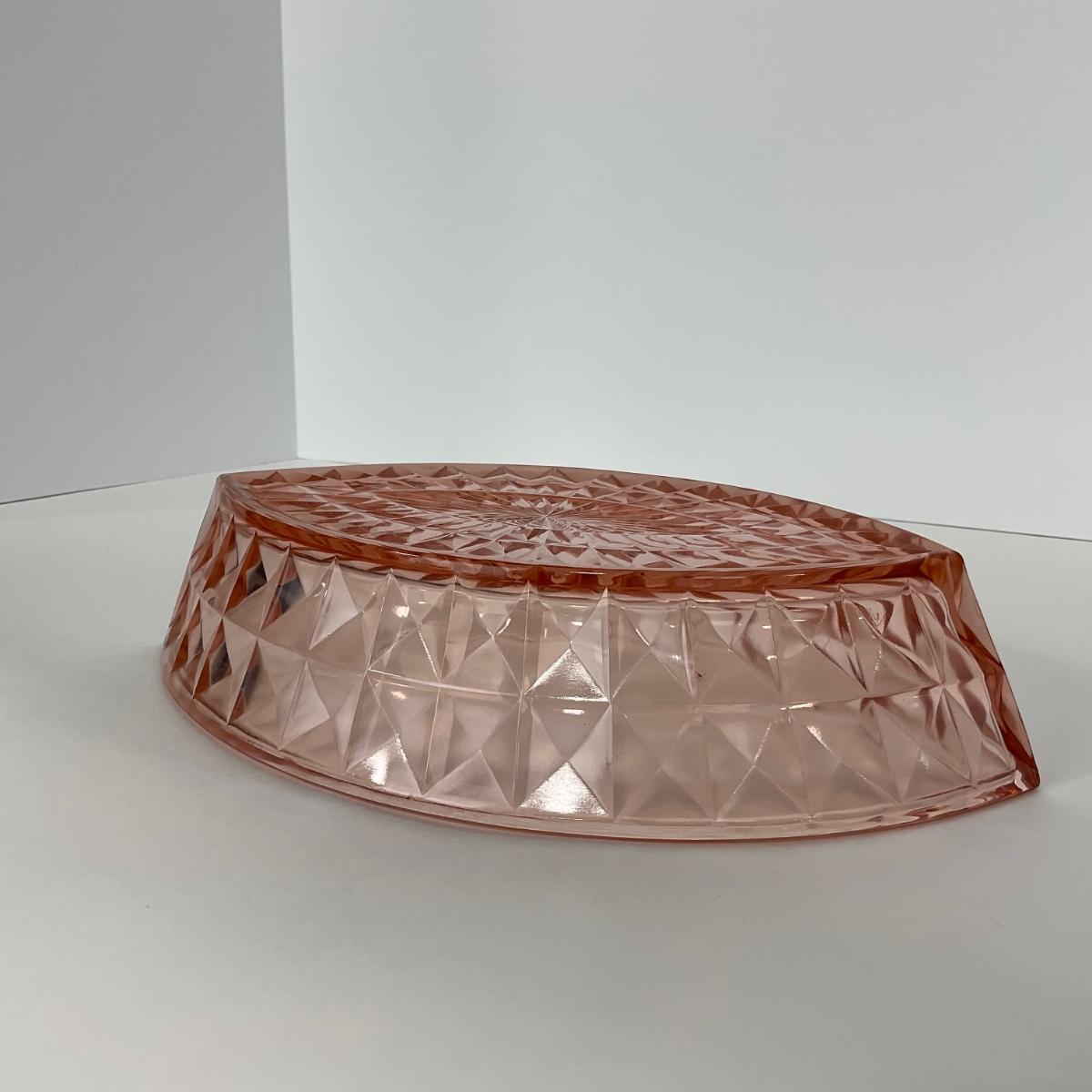 One pink Windsor Diamond Jeanette Glass Co. (1932-1946) boat dish. Please see photos for details and condition. ::: Shipping is available on this lot. If you require shipping you must let us know at the close of the auction. We will coordinate with you after the item has been won. Shipping fees will include insurance up to or exceeding the value of all items being mailed. If you have any questions regarding this lot please contact the auctioneer either via this website, by direct email or by phone. PICK UP TIMES and other important information can be found in the TERMS and DESCRIPTION of the auction. Please take a look for pertinent information. Thanks!