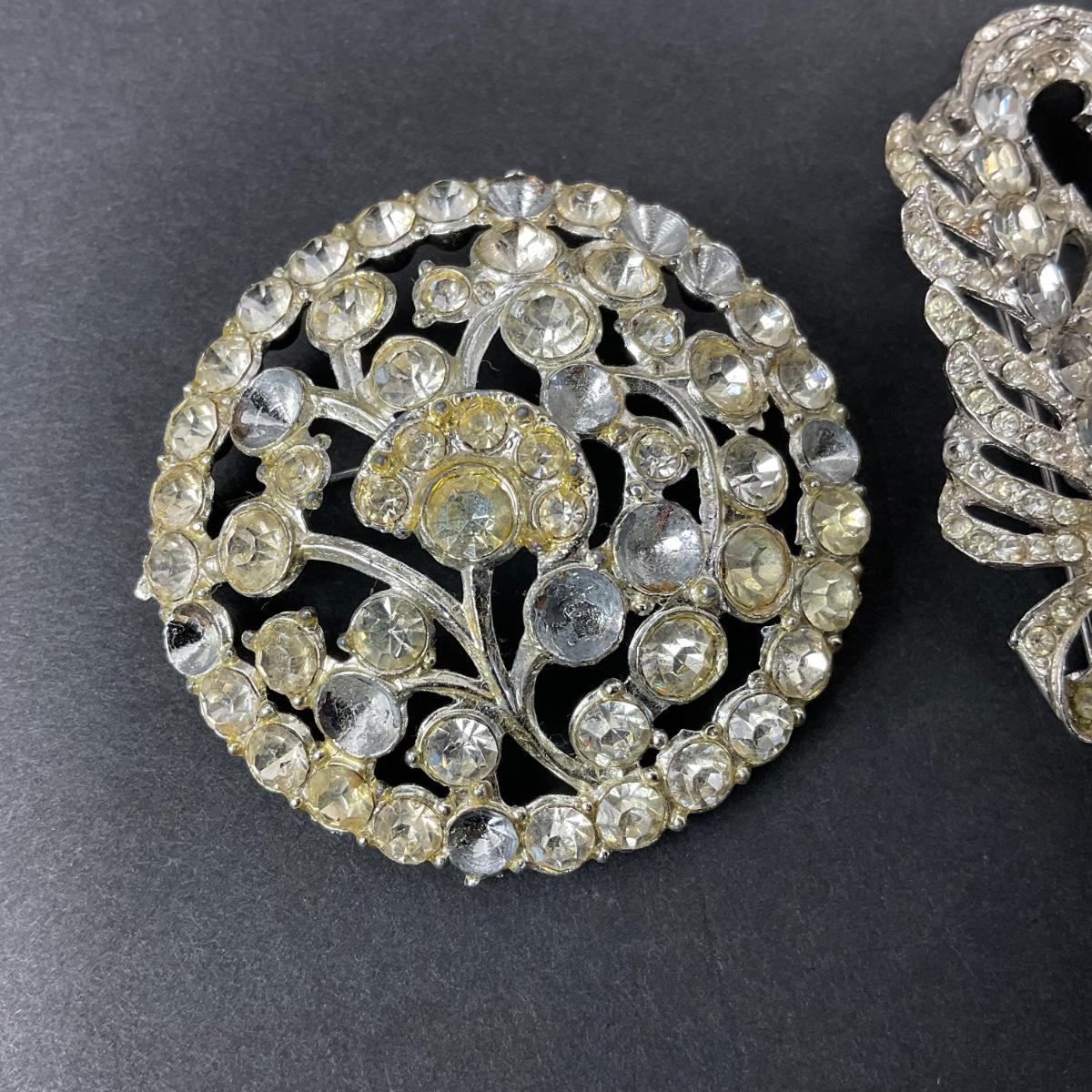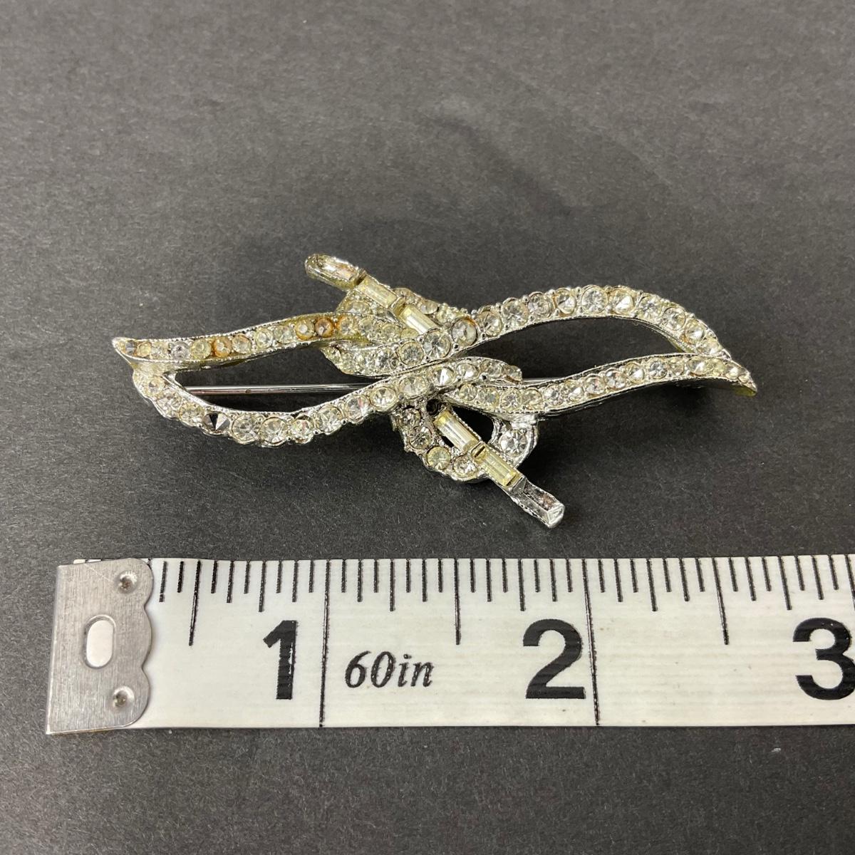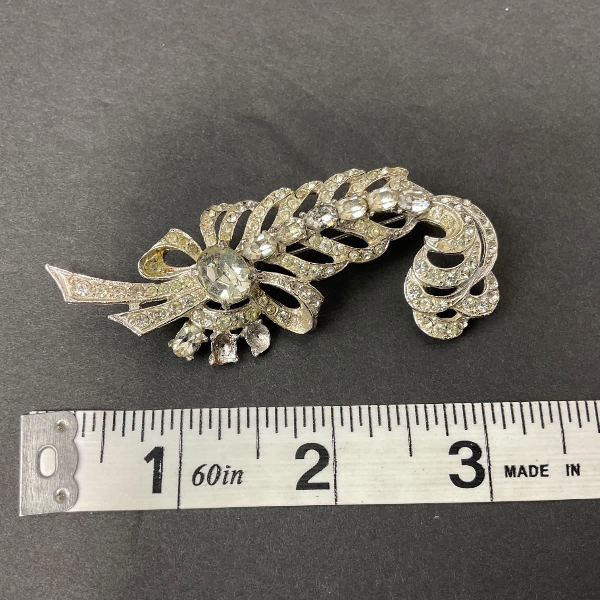 Four rhinestone brooches. One is a marked Joesph Wiesner NY. This pieces are worn damaged and some are missing rhinestones. Please see photos for details and condition. Any condition statement is given as a courtesy to a client, is an opinion, and should not be treated as a statement of fact. Reference to condition written, oral or within a condition report shall not be regarded as a full account of condition and may not include all defects, alterations, or restorations. Absence of a condition report does not imply a lot is flawless or lacking imperfections or damage. Katherine’s Auction & Appraisal Service shall have no responsibility for any error or omission. Returns shall not be accepted on the basis of condition. ::: Shipping is available on this lot. If you require shipping you must let us know at the close of the auction. We will coordinate with you after the item has been won. Shipping fees will include insurance up to or exceeding the value of all items being mailed. If you have any questions regarding this lot please contact the auctioneer either via this website, by direct email or by phone. PICK UP TIMES and other important information can be found in the TERMS and DESCRIPTION of the auction. Please take a look for pertinent information. Thanks!