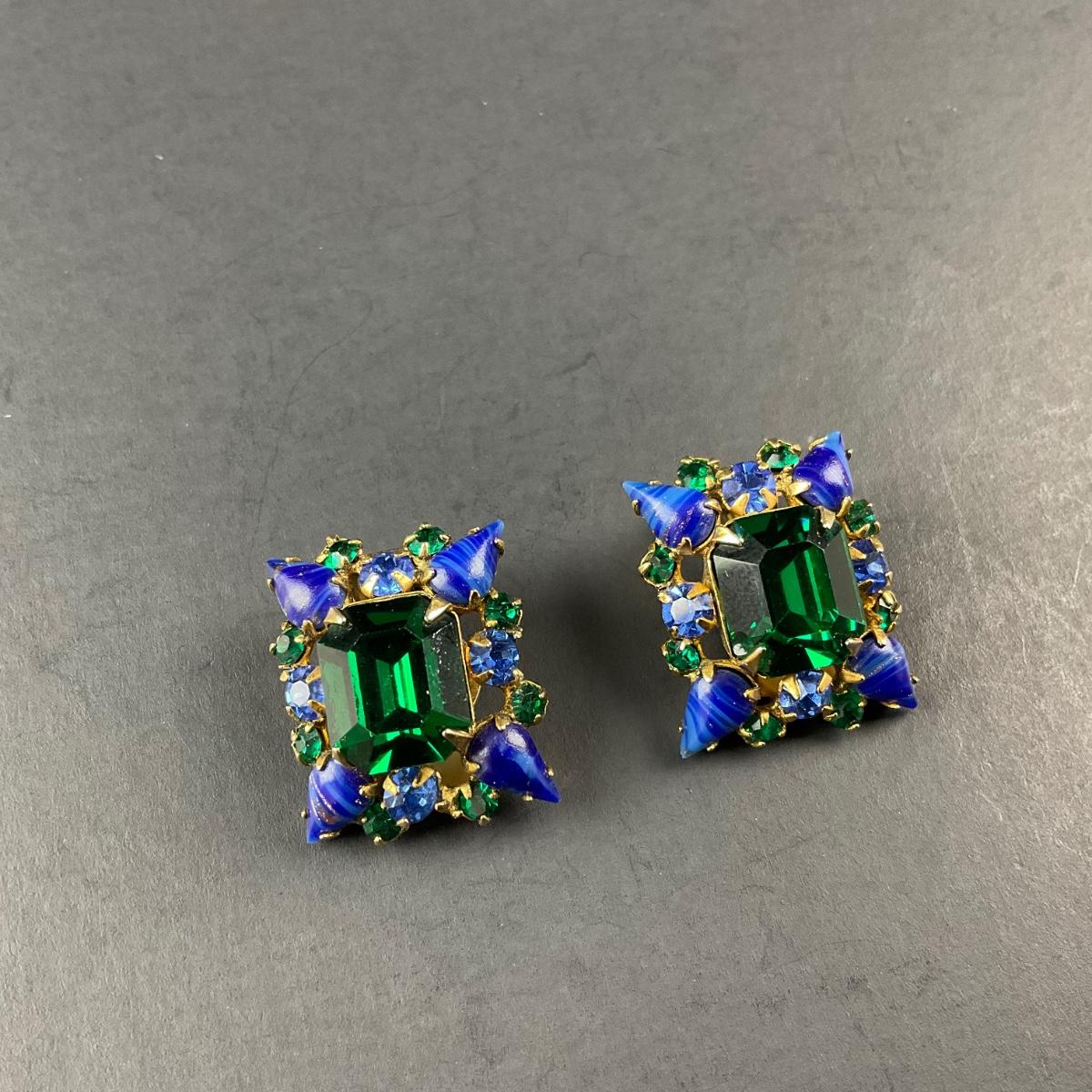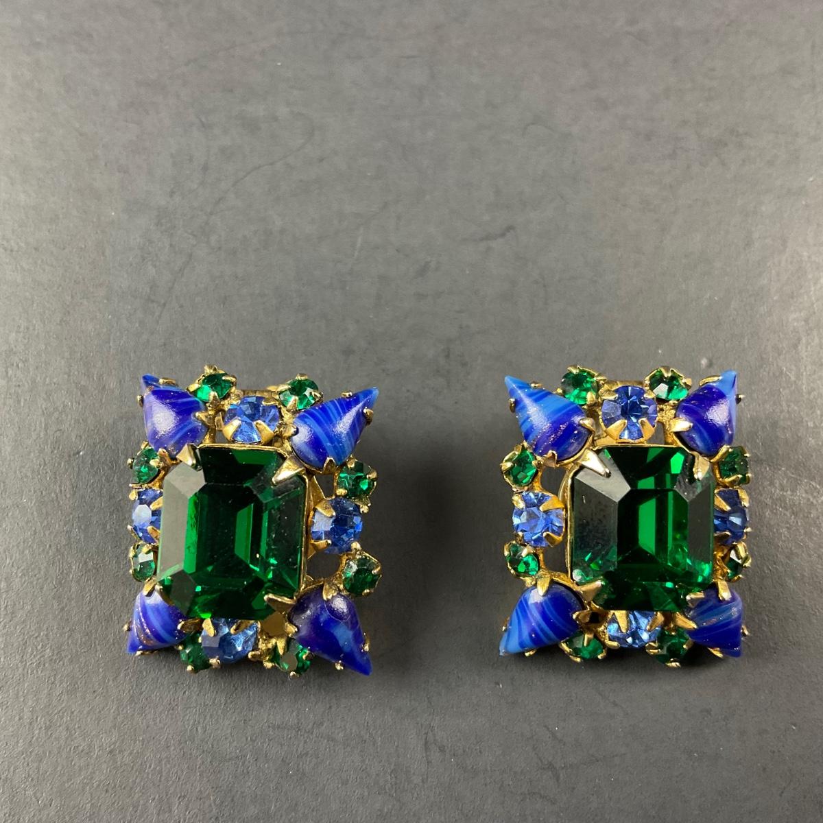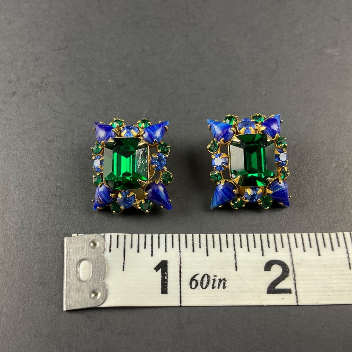 One pair of green and blue rhinestone Robert Levy (Robert) marked fashioncraft clip earrings. This piece has no damage, and appears to be in great shape with no visable chips, cracks, or broken pieces. Please see photos for details and condition. Any condition statement is given as a courtesy to a client, is an opinion, and should not be treated as a statement of fact. Reference to condition written, oral or within a condition report shall not be regarded as a full account of condition and may not include all defects, alterations, or restorations. Absence of a condition report does not imply a lot is flawless or lacking imperfections or damage. Katherine’s Auction & Appraisal Service shall have no responsibility for any error or omission. Returns shall not be accepted on the basis of condition. ::: Shipping is available on this lot. If you require shipping you must let us know at the close of the auction. We will coordinate with you after the item has been won. Shipping fees will include insurance up to or exceeding the value of all items being mailed. If you have any questions regarding this lot please contact the auctioneer either via this website, by direct email or by phone. PICK UP TIMES and other important information can be found in the TERMS and DESCRIPTION of the auction. Please take a look for pertinent information. Thanks!