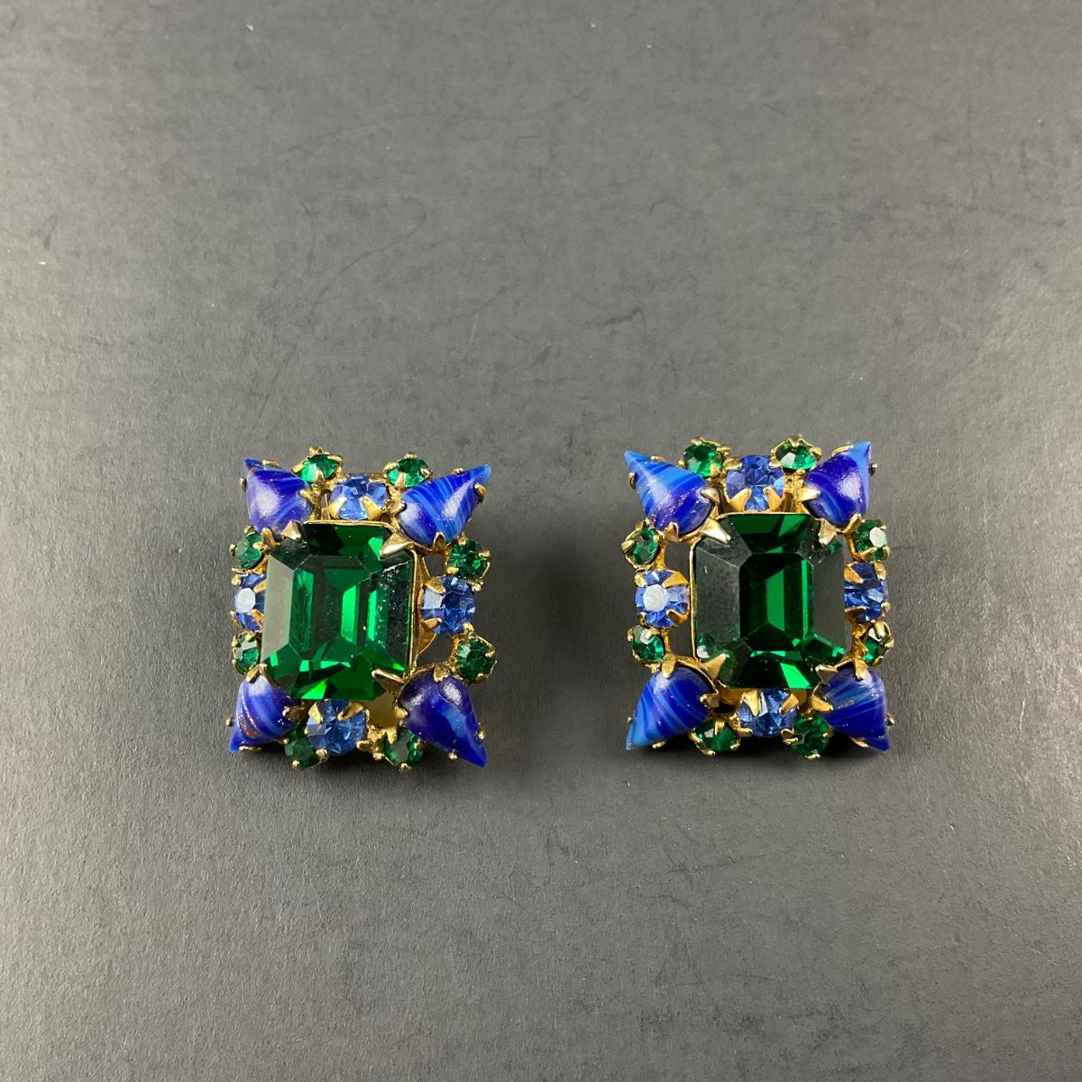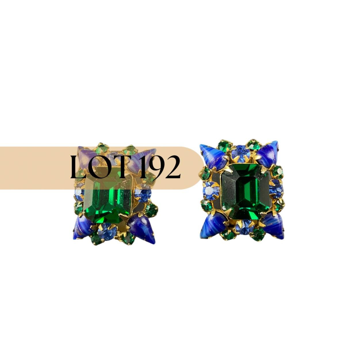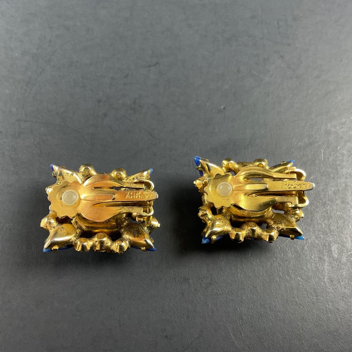 One pair of green and blue rhinestone Robert Levy (Robert) marked fashioncraft clip earrings. This piece has no damage, and appears to be in great shape with no visable chips, cracks, or broken pieces. Please see photos for details and condition. Any condition statement is given as a courtesy to a client, is an opinion, and should not be treated as a statement of fact. Reference to condition written, oral or within a condition report shall not be regarded as a full account of condition and may not include all defects, alterations, or restorations. Absence of a condition report does not imply a lot is flawless or lacking imperfections or damage. Katherine’s Auction & Appraisal Service shall have no responsibility for any error or omission. Returns shall not be accepted on the basis of condition. ::: Shipping is available on this lot. If you require shipping you must let us know at the close of the auction. We will coordinate with you after the item has been won. Shipping fees will include insurance up to or exceeding the value of all items being mailed. If you have any questions regarding this lot please contact the auctioneer either via this website, by direct email or by phone. PICK UP TIMES and other important information can be found in the TERMS and DESCRIPTION of the auction. Please take a look for pertinent information. Thanks!