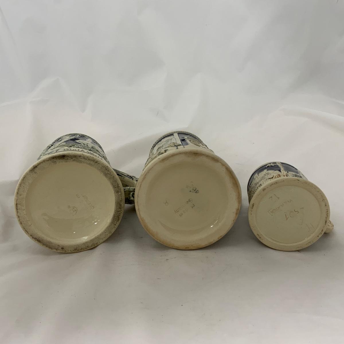 Three attractive German steins, grouped together by color theme. Nice stoneware pieces, circa 1900. Add to your collection today! Each of these steins in in great antique condition. Please see photos for details and condition. ::: Shipping is available on this lot. If you require shipping you must let us know at the close of the auction. We will coordinate with you after the item has been won. Shipping fees will include insurance up to or exceeding the value of all items being mailed. If you have any questions regarding this lot please contact the auctioneer either via this website, by direct email or by phone. PICK UP TIMES and other important information can be found in the TERMS and DESCRIPTION of the auction. Please take a look for pertinent information. Thanks!