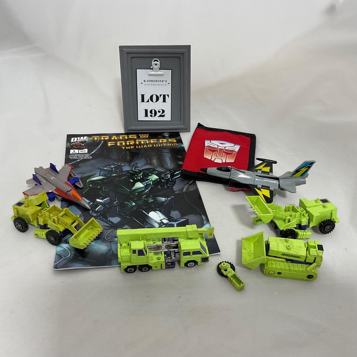 Eight 1980’s transformers collector pieces, well loved includes one misc possibly broken piece. One comic. And one wallet. Please see photos for details and condition. ::: Shipping is available on this lot. If you require shipping you must let us know at the close of the auction. We will coordinate with you after the item has been won. Shipping fees will include insurance up to or exceeding the value of all items being mailed. If you have any questions regarding this lot please contact the auctioneer either via this website, by direct email or by phone. PICK UP TIMES and other important information can be found in the TERMS and DESCRIPTION of the auction. Please take a look for pertinent information. Thanks!