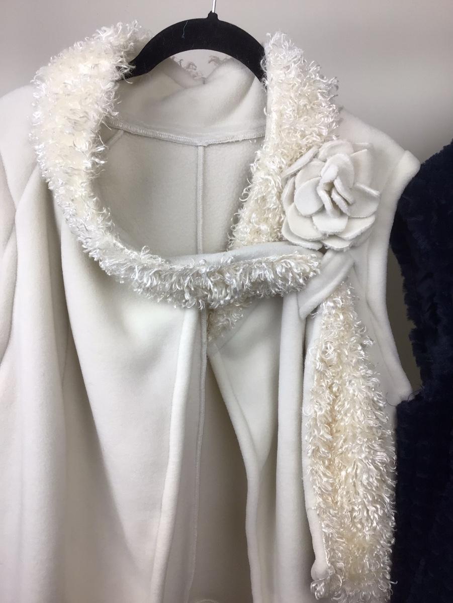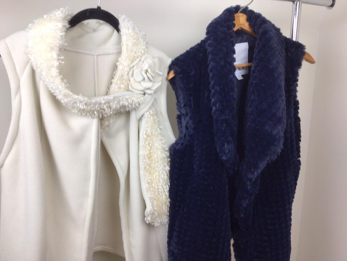 There are 2 vests in the lot, blue is NVLT and is faux fur, White has a flower with scarf attached to the vest.