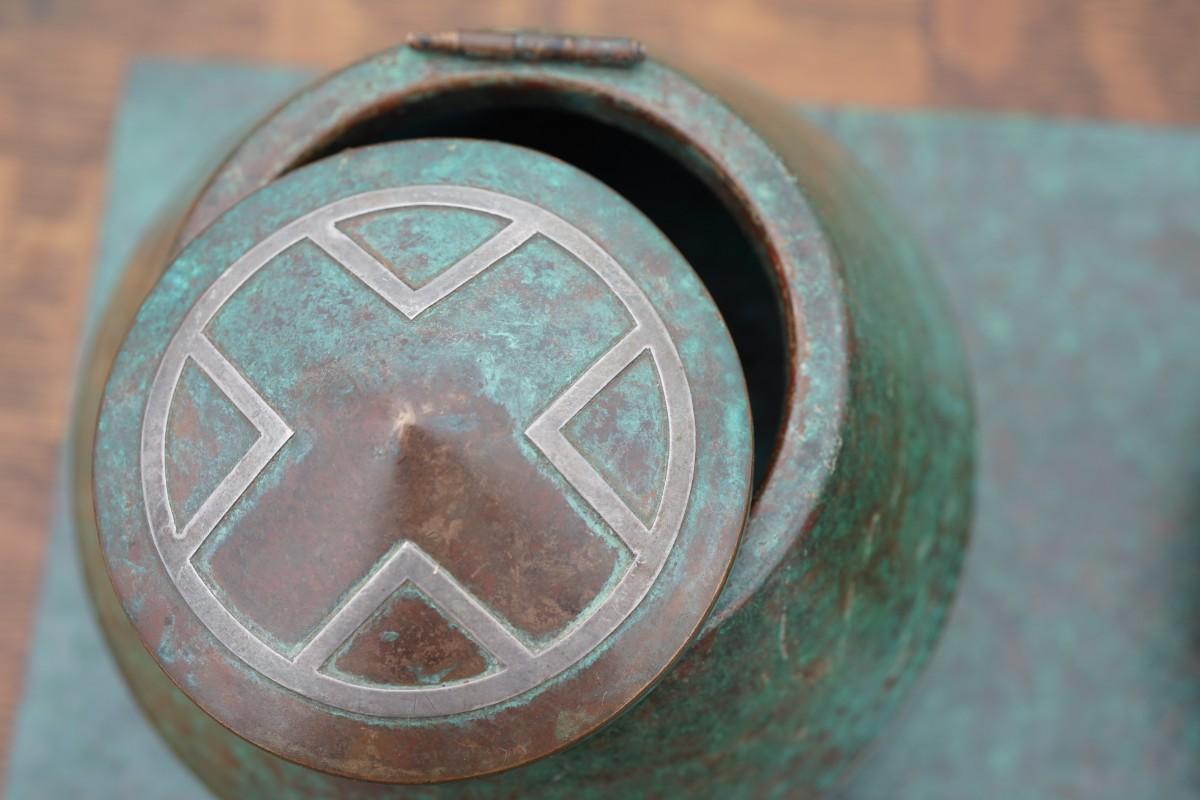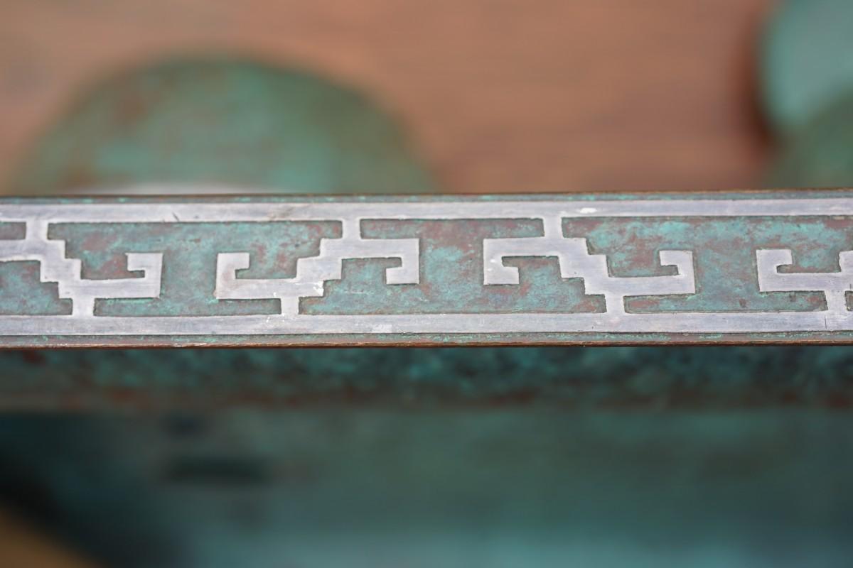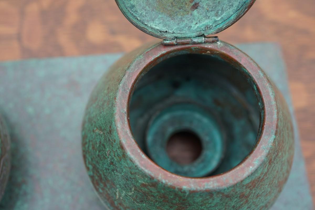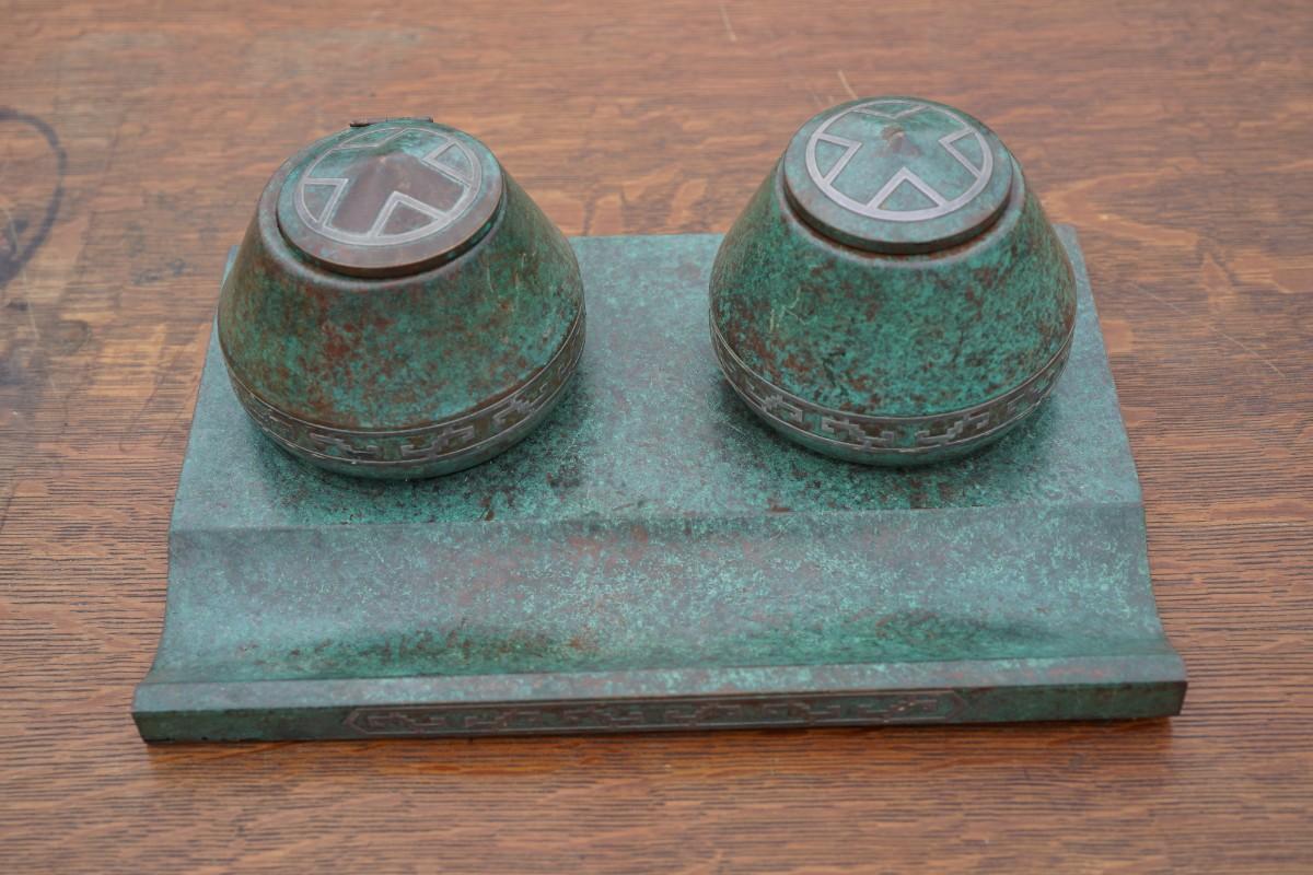1920-30'S DESK SET MOTTLED GREEN FINISH OVER BRONZE WITH STERLING ACCENT