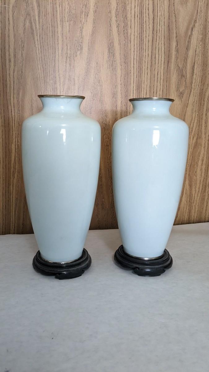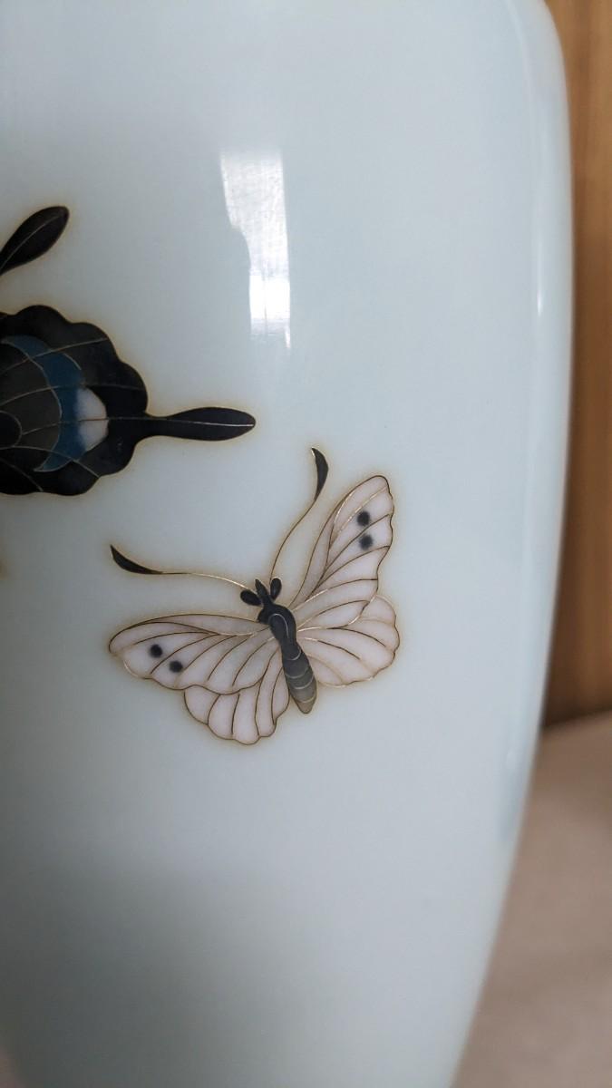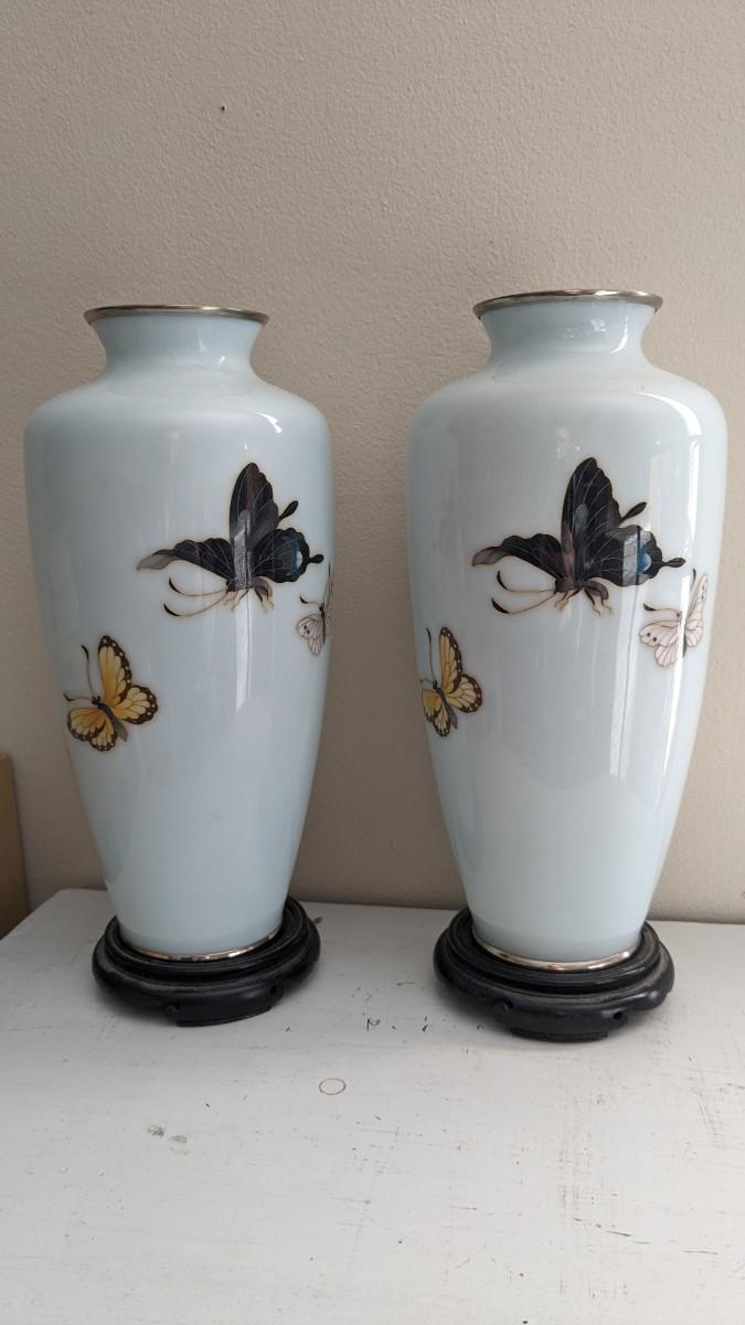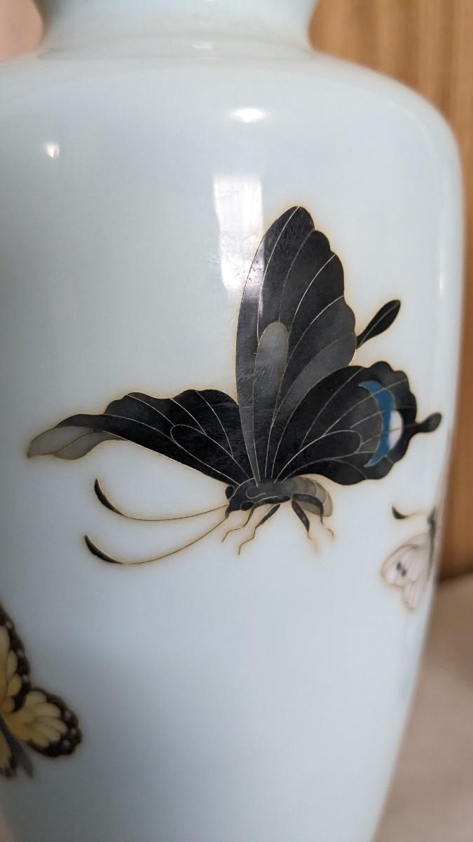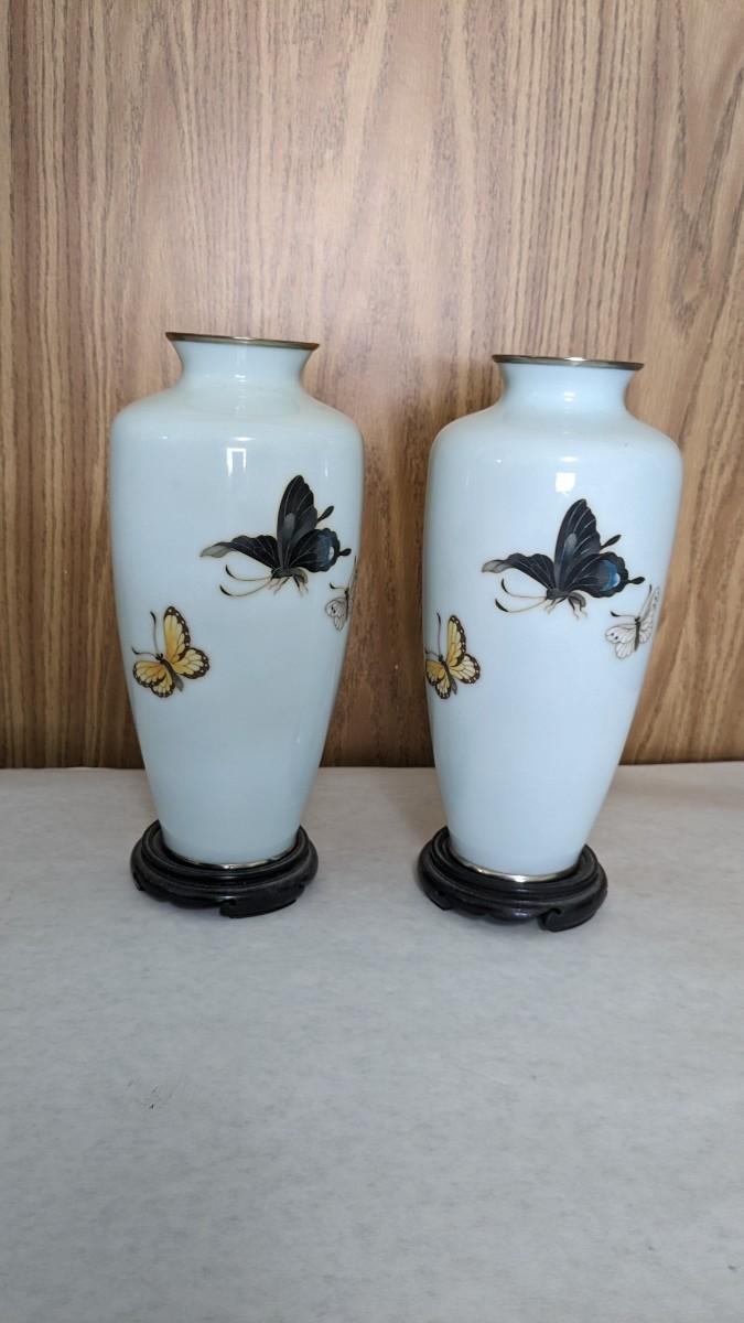 2ea, 8.5" without bases. Both of these stunning pale blue vases are marked with beautiful butterfly detail and Ando marking on bottoms. Please note that one does show damage that is easily hidden when displayed. Photo in front of white door is an attempt to show color difference. bdrm1