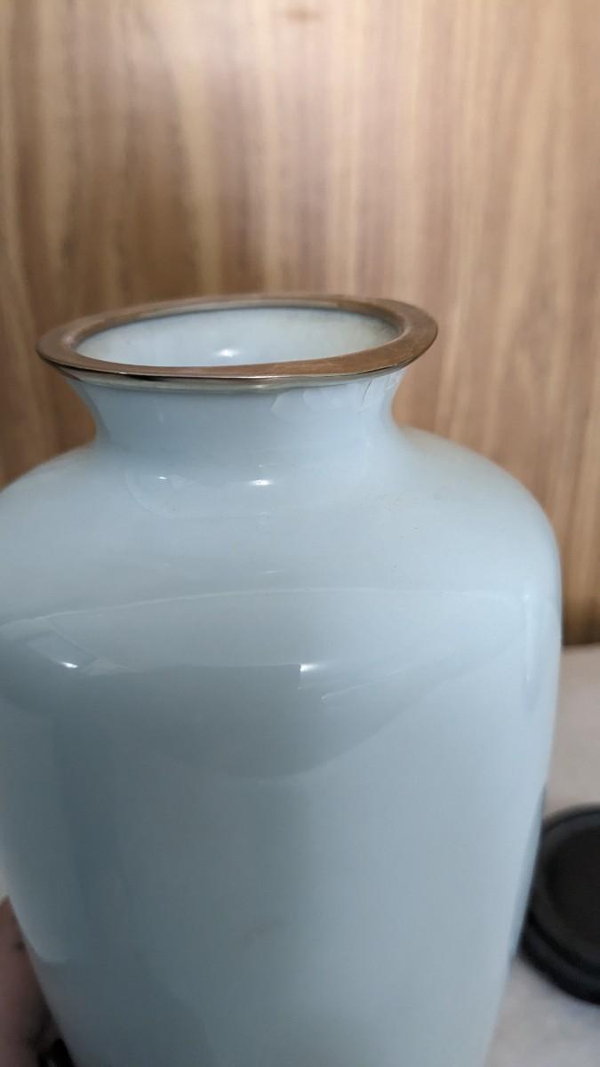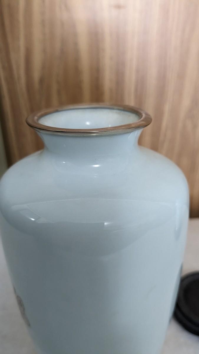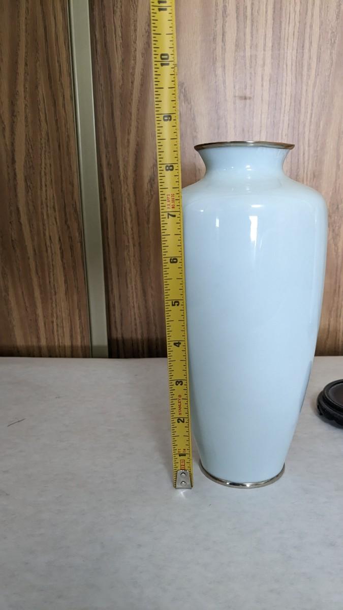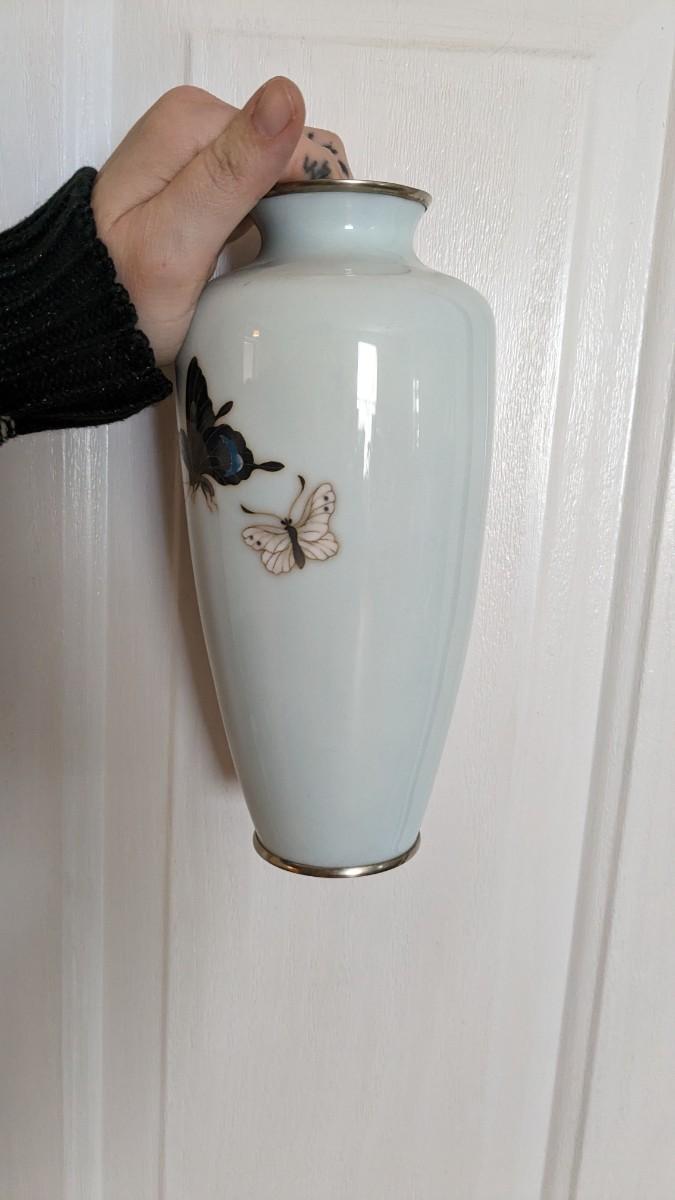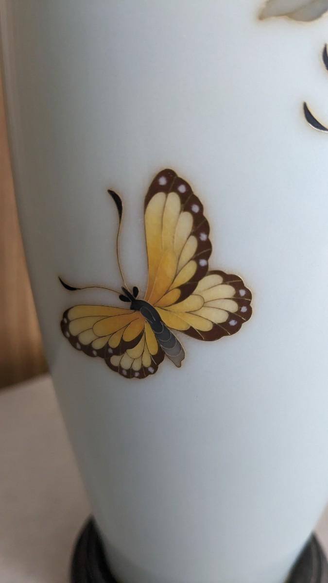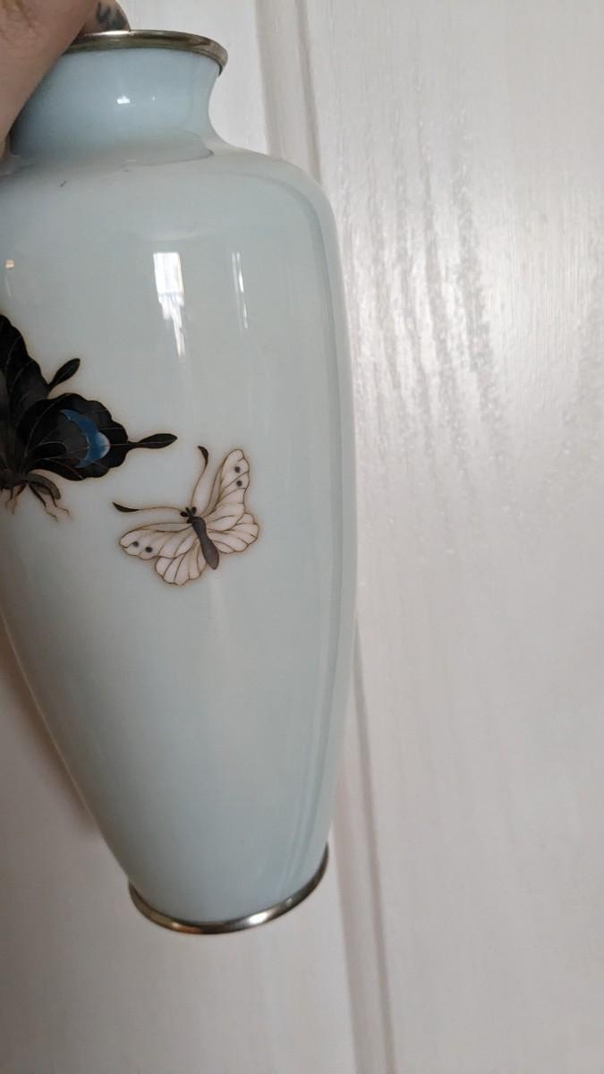 2ea, 8.5" without bases. Both of these stunning pale blue vases are marked with beautiful butterfly detail and Ando marking on bottoms. Please note that one does show damage that is easily hidden when displayed. Photo in front of white door is an attempt to show color difference. bdrm1