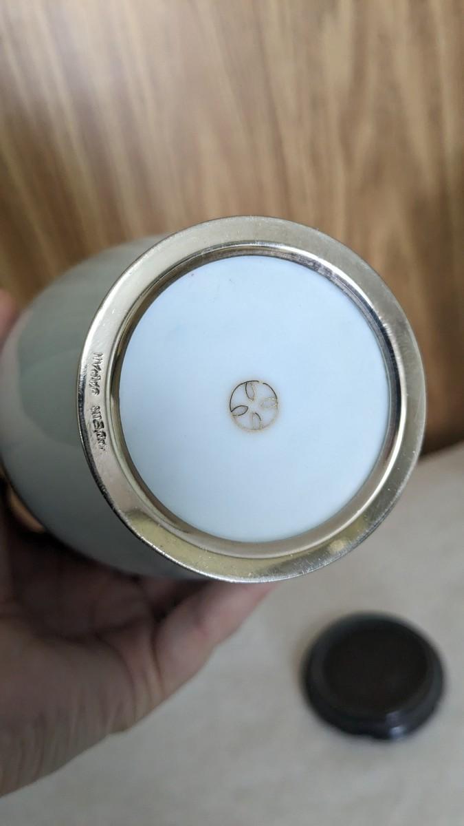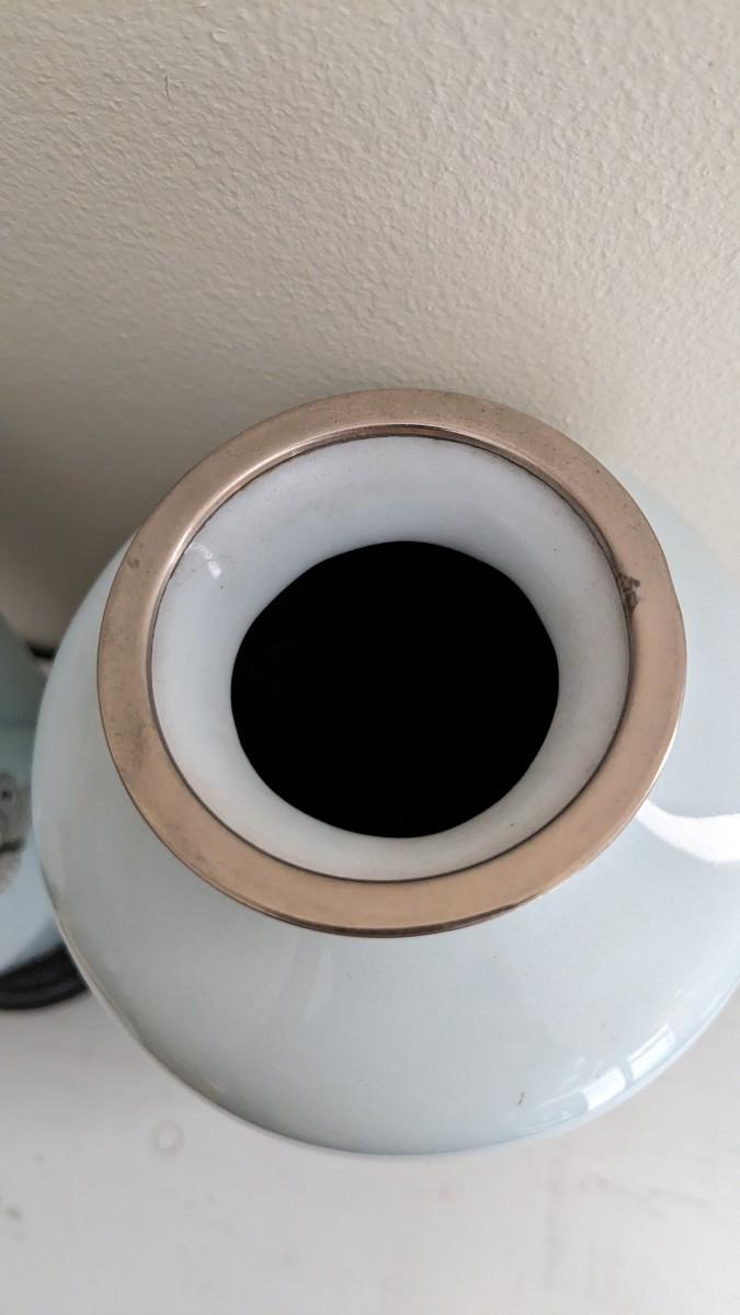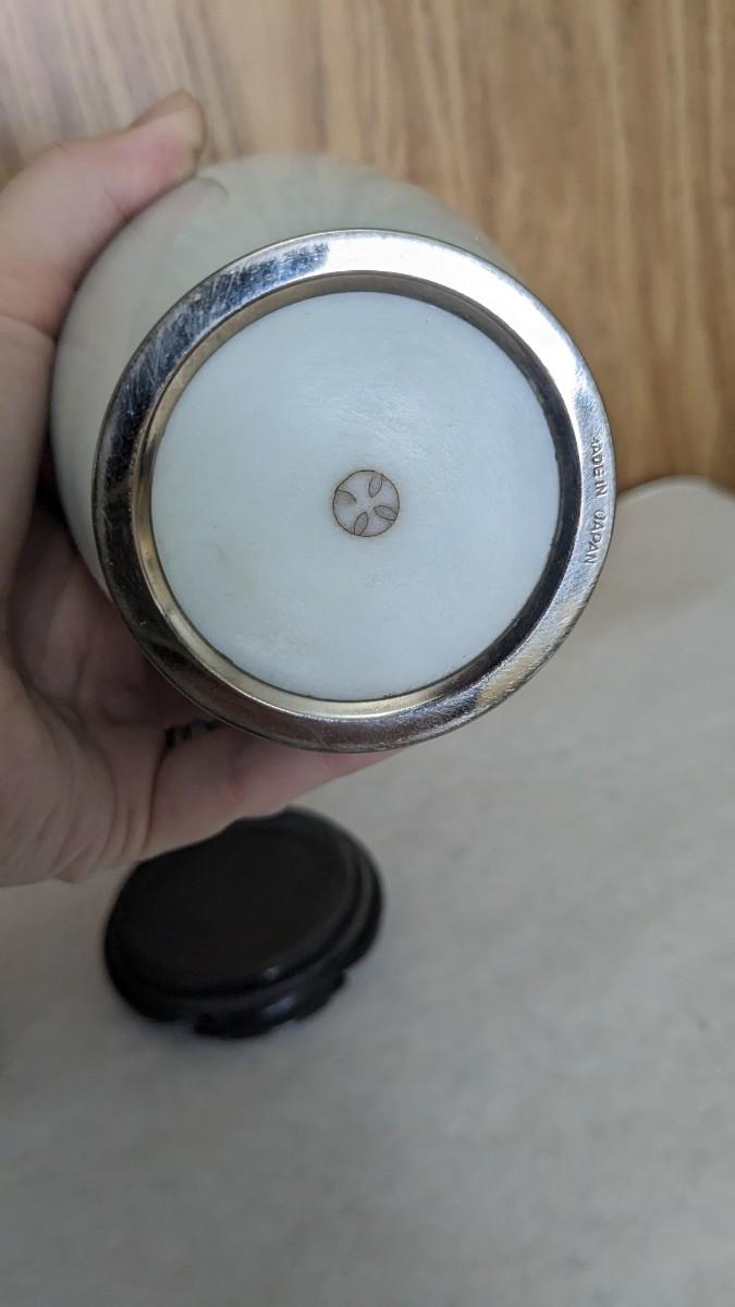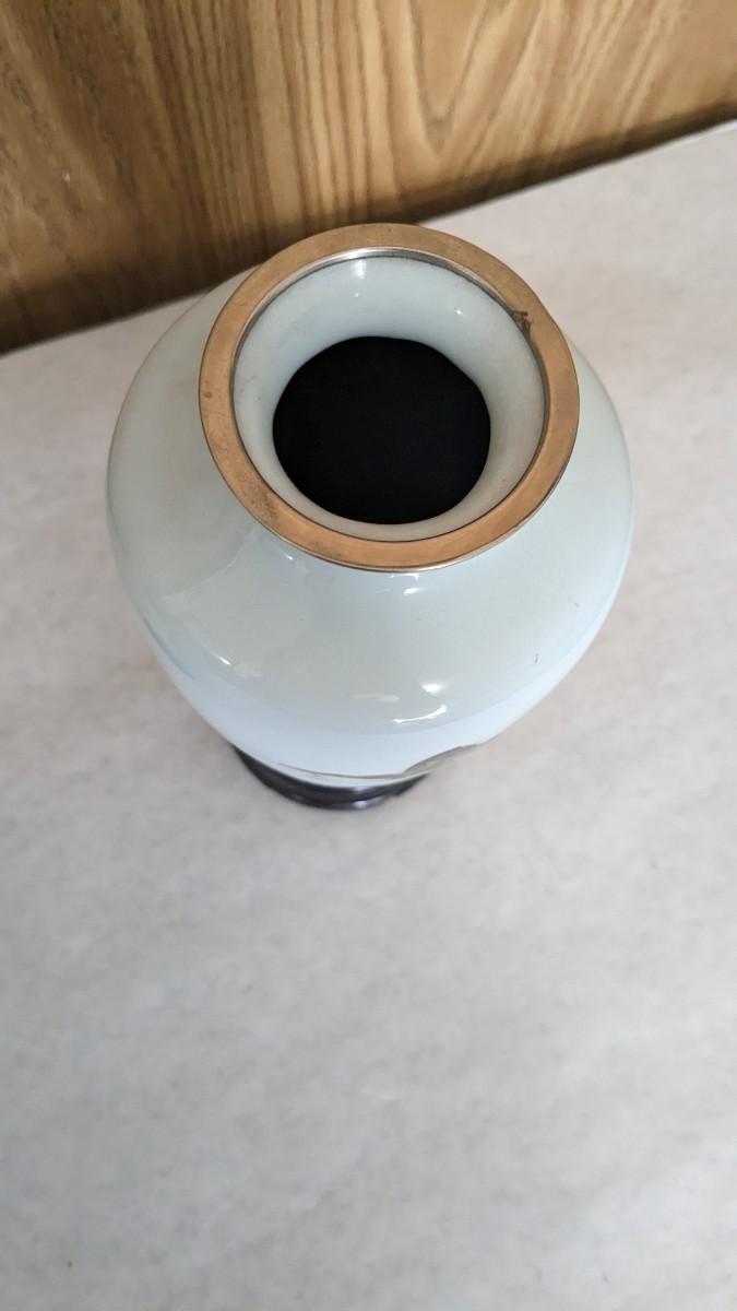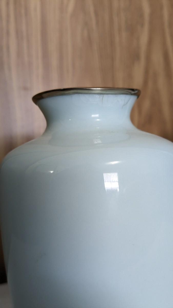 2ea, 8.5" without bases. Both of these stunning pale blue vases are marked with beautiful butterfly detail and Ando marking on bottoms. Please note that one does show damage that is easily hidden when displayed. Photo in front of white door is an attempt to show color difference. bdrm1