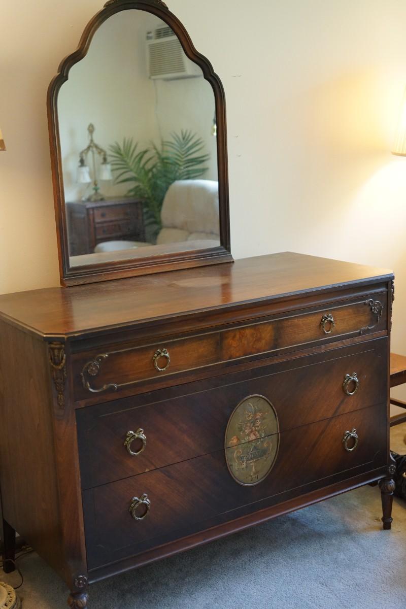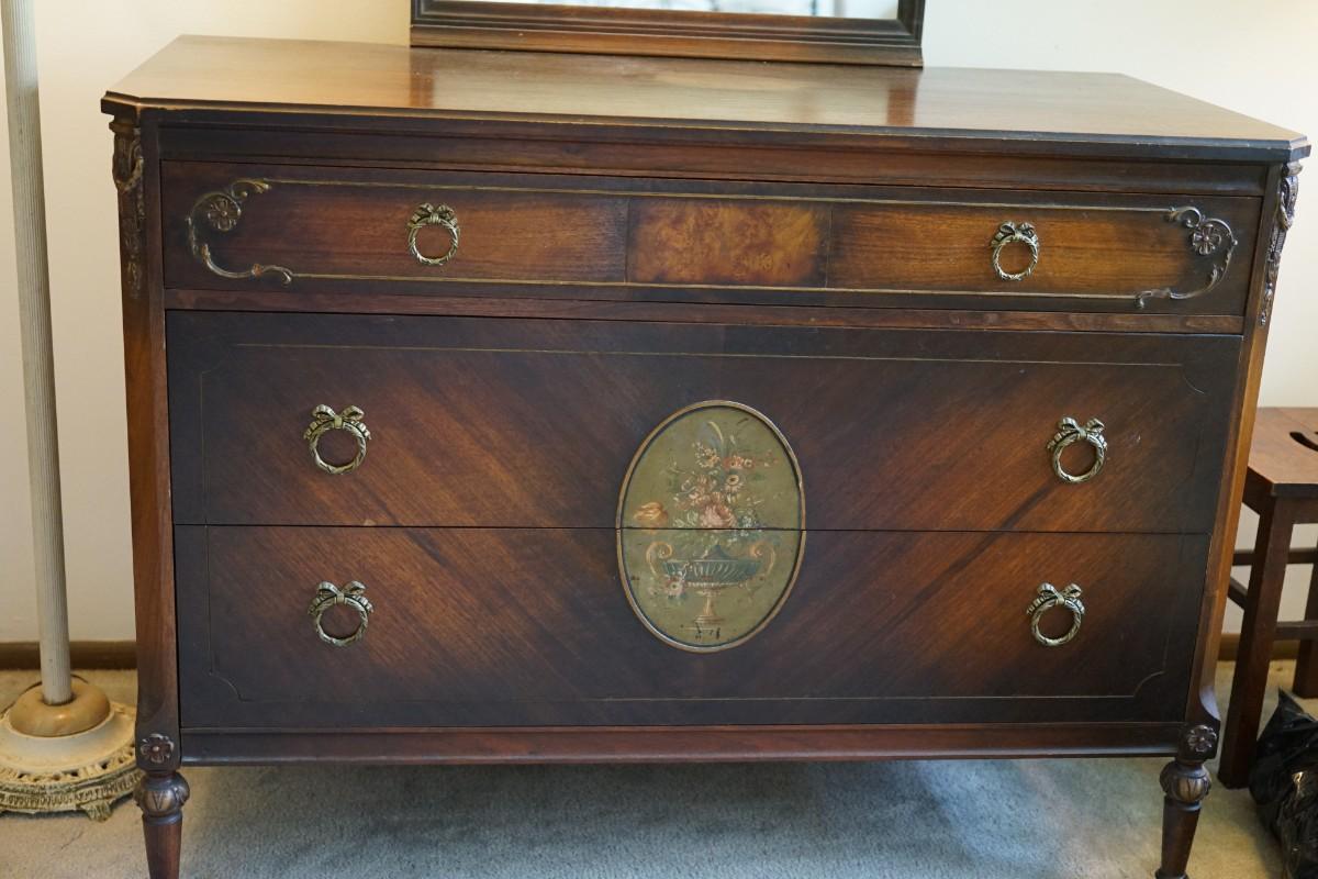 1920's DRESSER WITH MIRROR, MAHOGANY W/ HAND PAINTED FLORAL PANEL ON FRONT