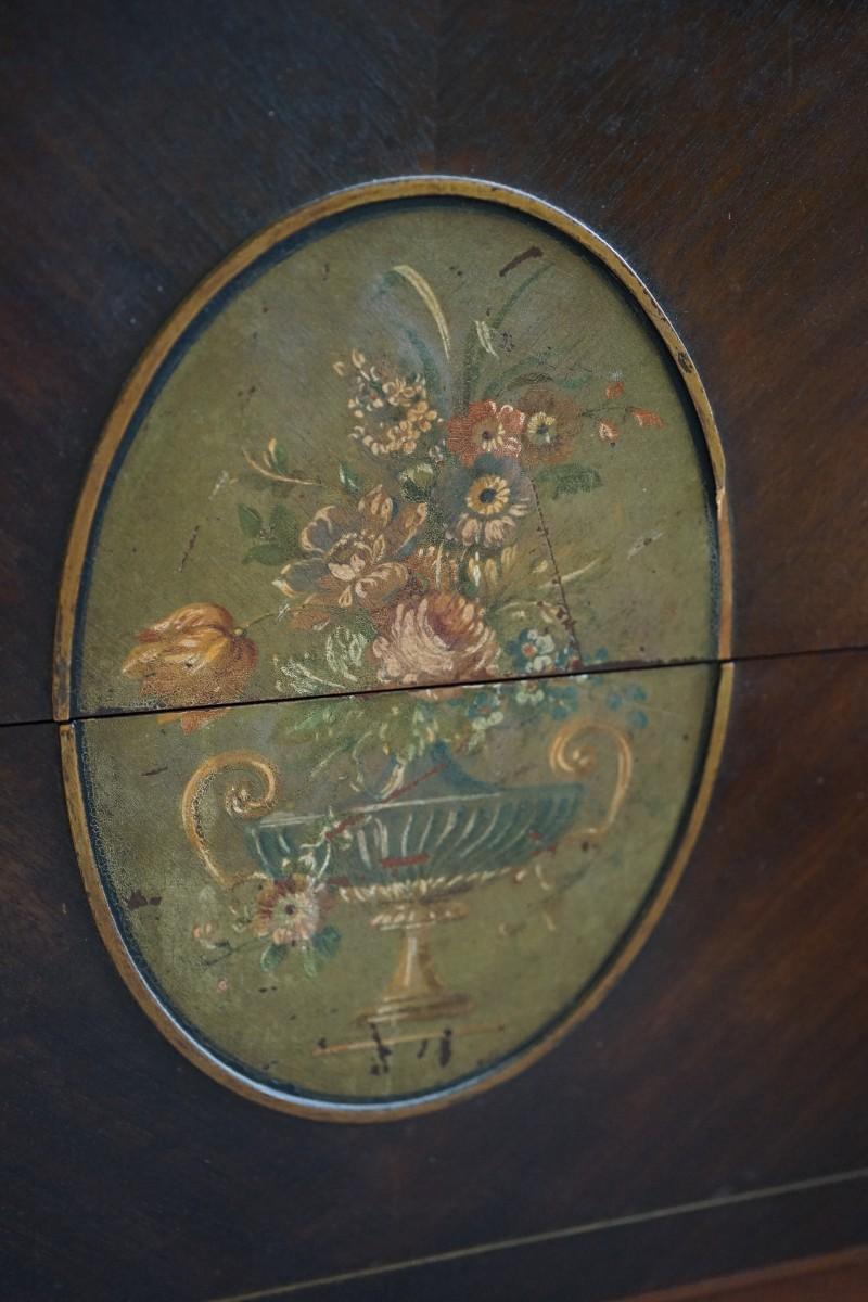 1920's  DRESSER WITH MIRROR, MAHOGANY W/ HAND PAINTED FLORAL PANEL ON FRONT