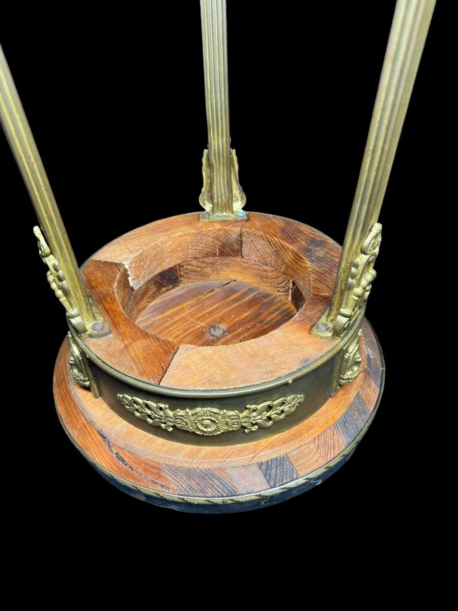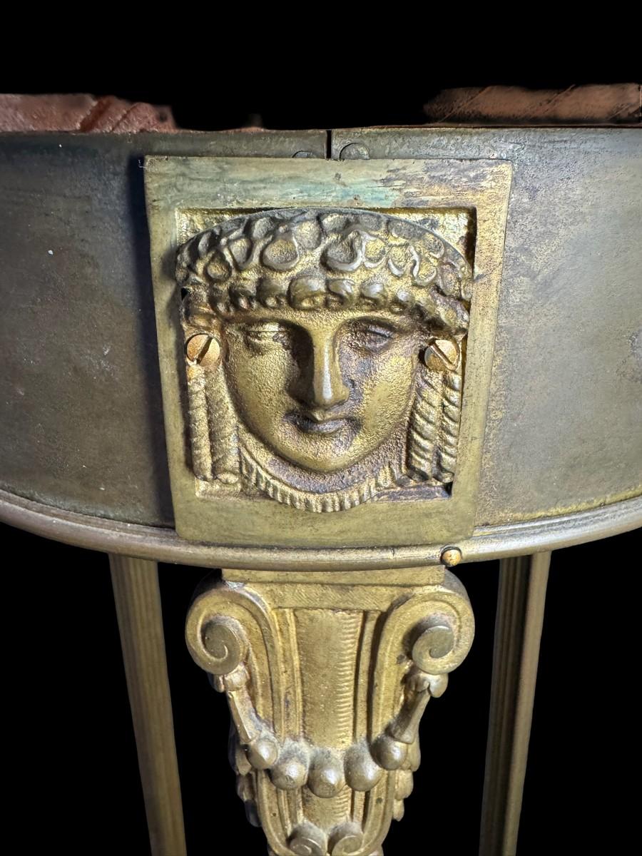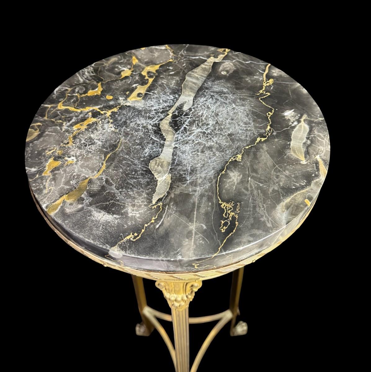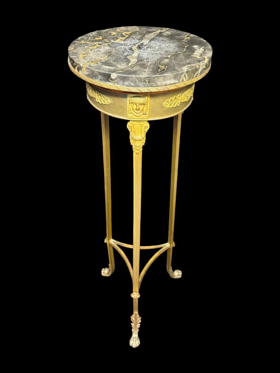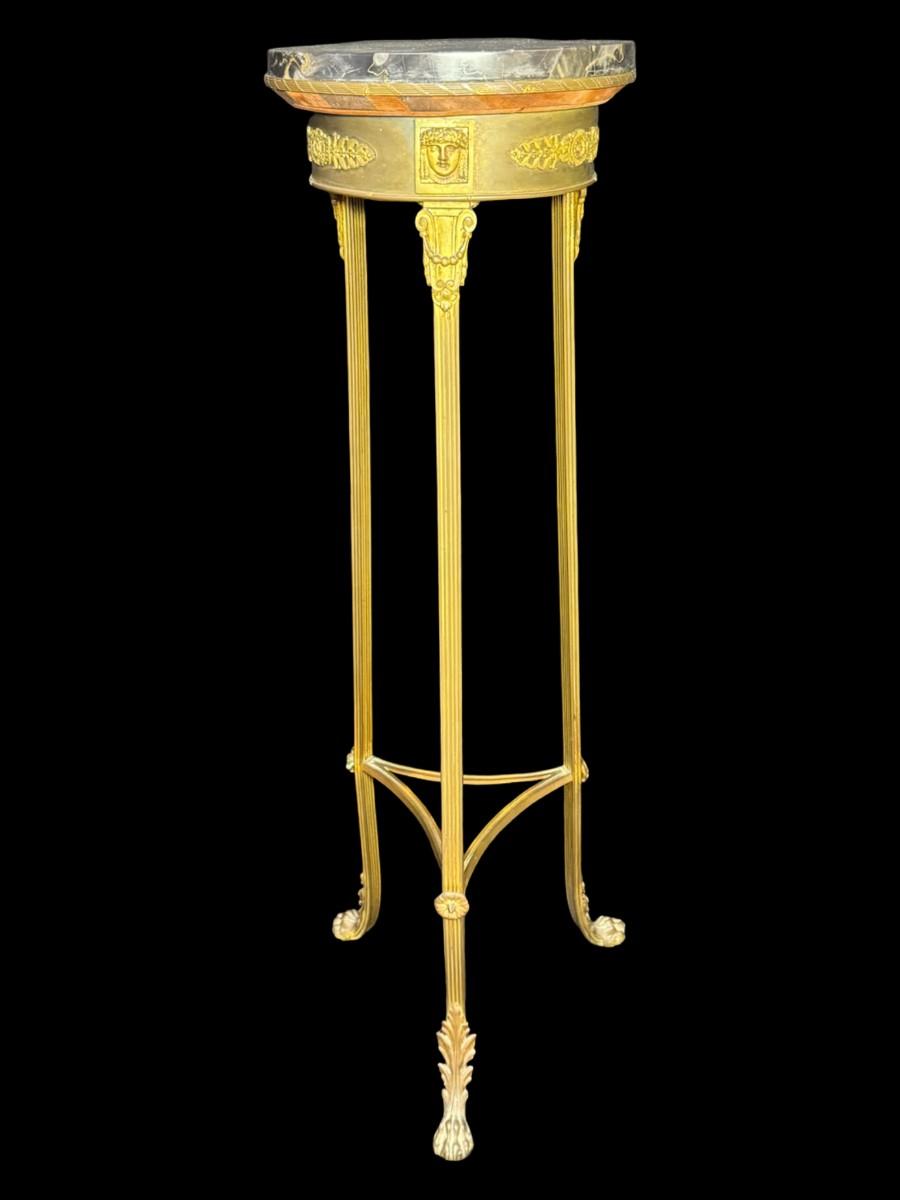 This fern stand has a black marble top and bronze legs, and has a neoclassical look. There is a distinctive sphinx or deity motif on the border. Measurement: 40”H x 11.5” Diameter. [JP]