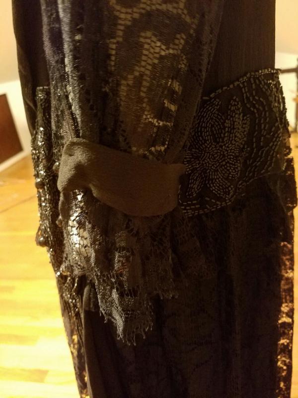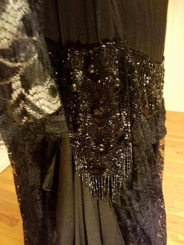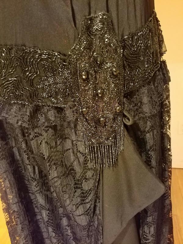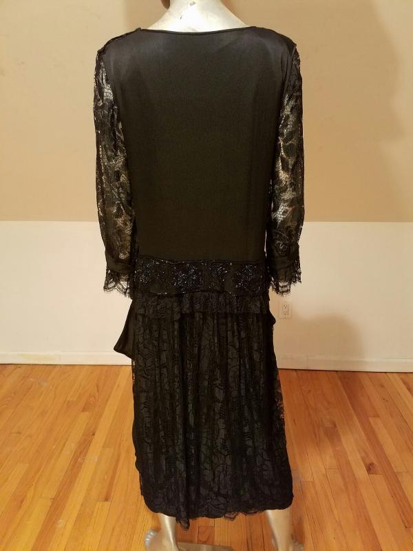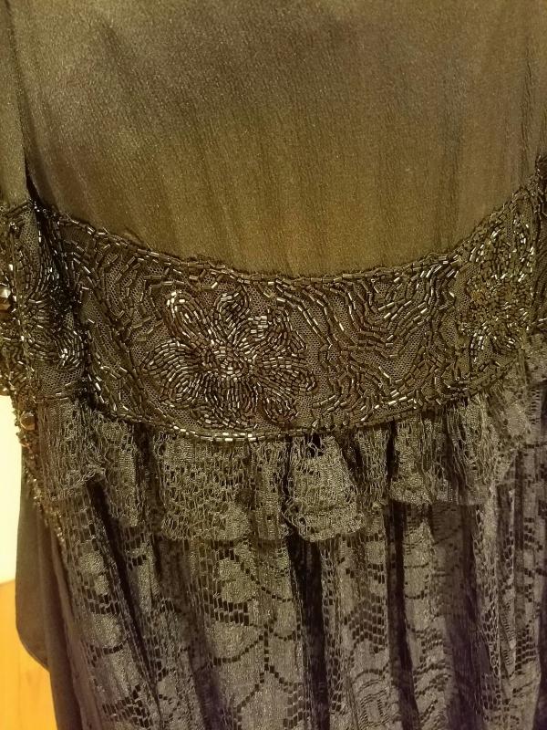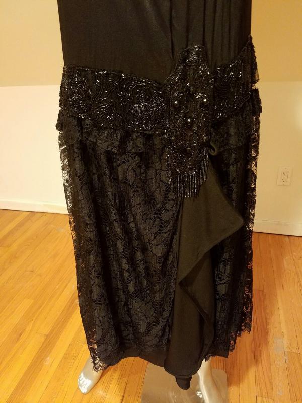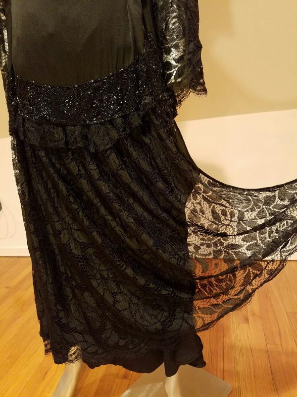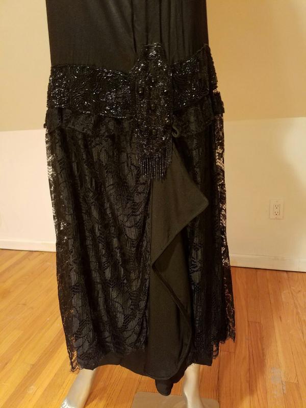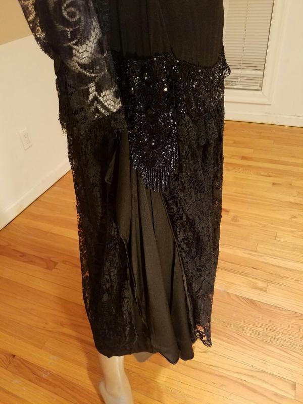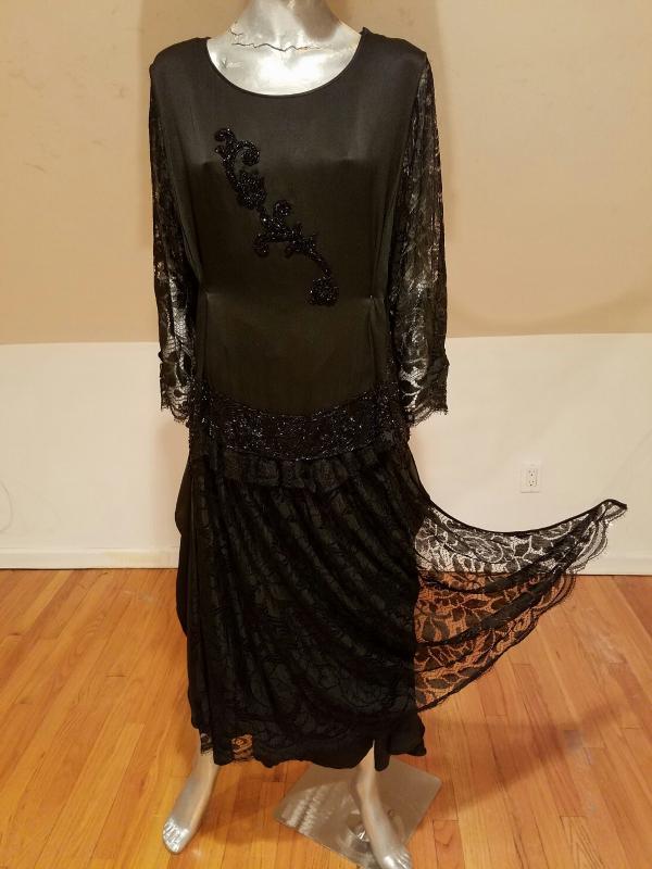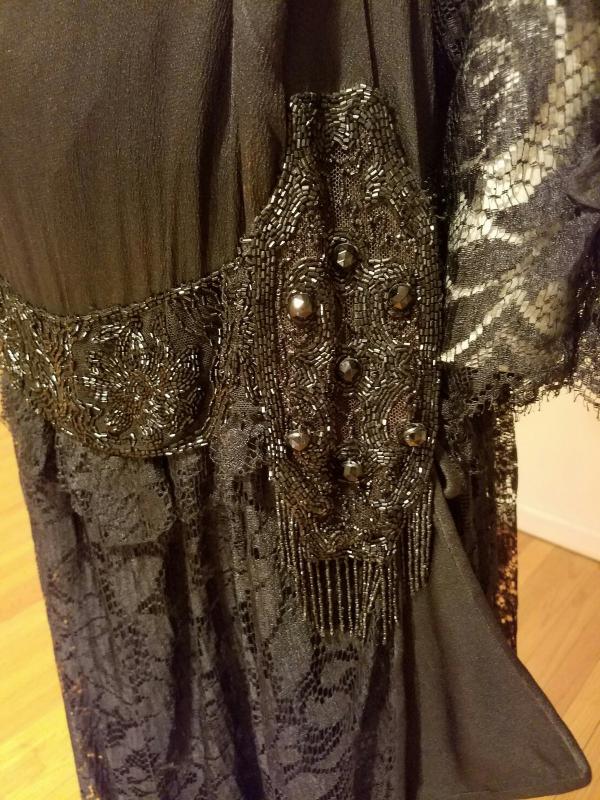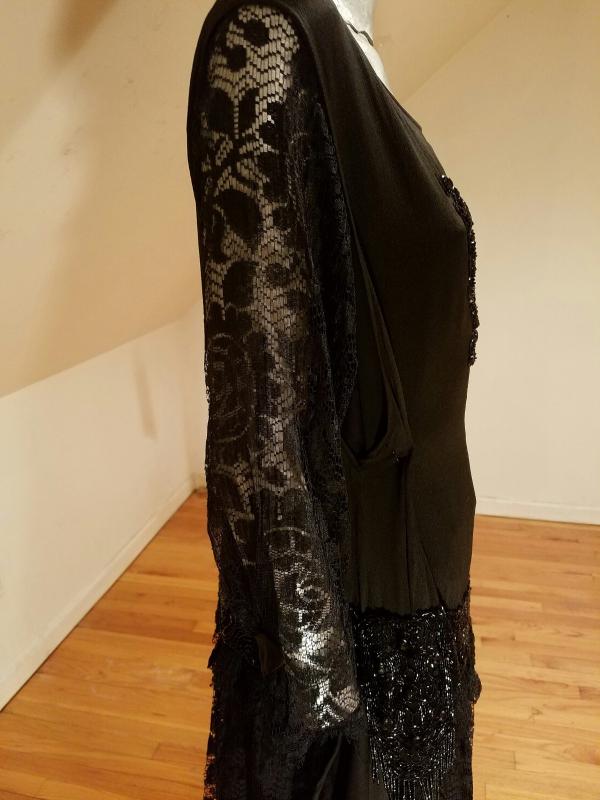 What a rare French beauty this Flapper dress is. From the late 1910 to early 1920 it is a site to see.. Gorgeous black beadings and fringes. The beading in exquisite . The dress has an under top with all lace sleeves.with amazing details. Hook & eye at the bodice and under bodice. No pictures can do this one justice you have to see it in real life to truly appreciate it. in very good antique vintage condition It is an Exquisite Wearable Art