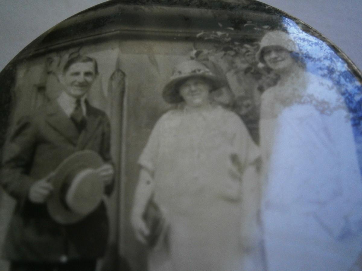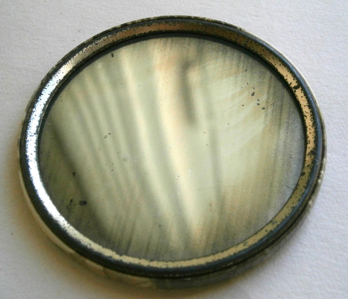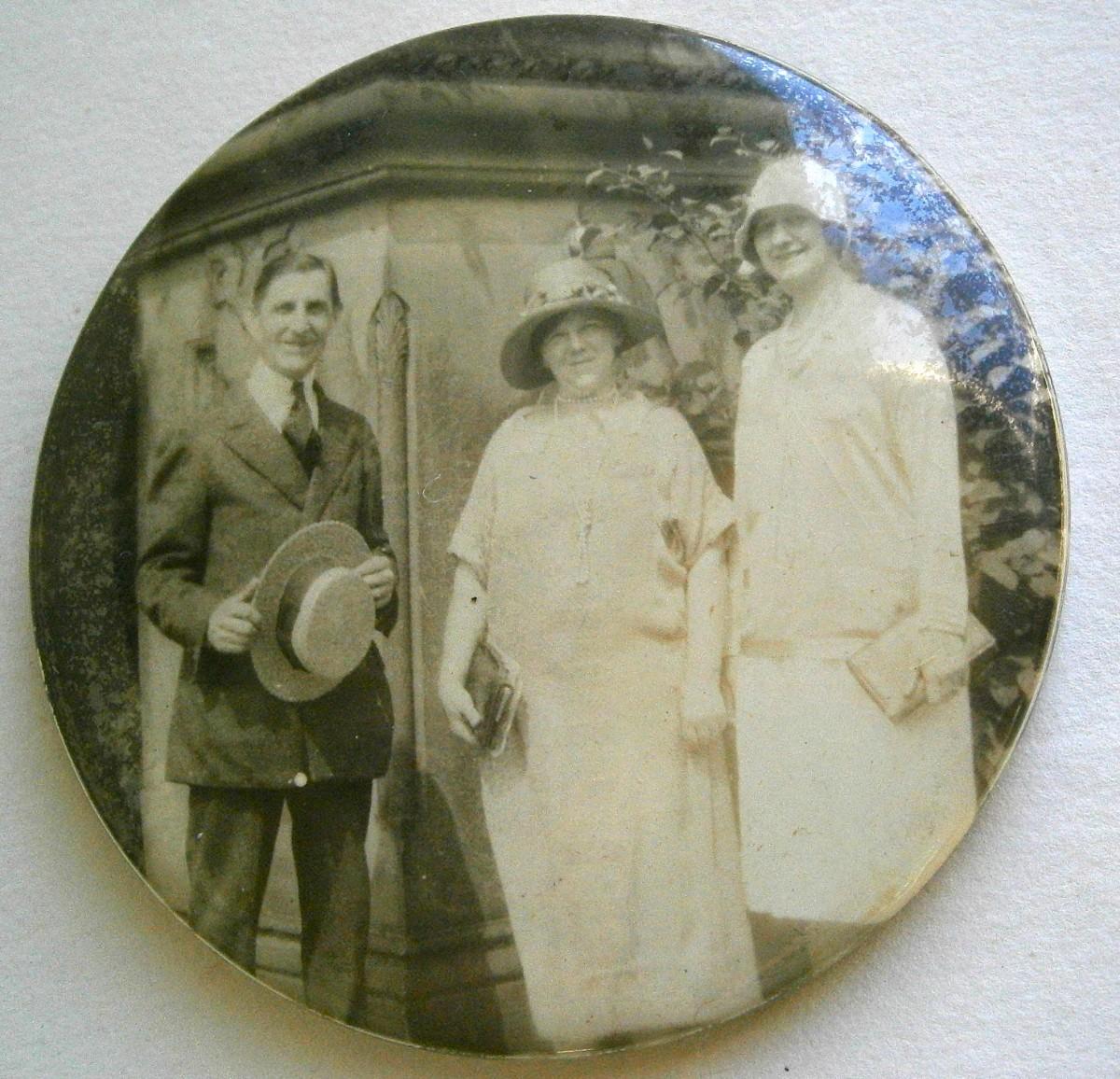 1920's Pocket Mirror with Image of Man with Straw Hat standing with 2 women, 2 1/8 in. diameter, celluloid over tin.