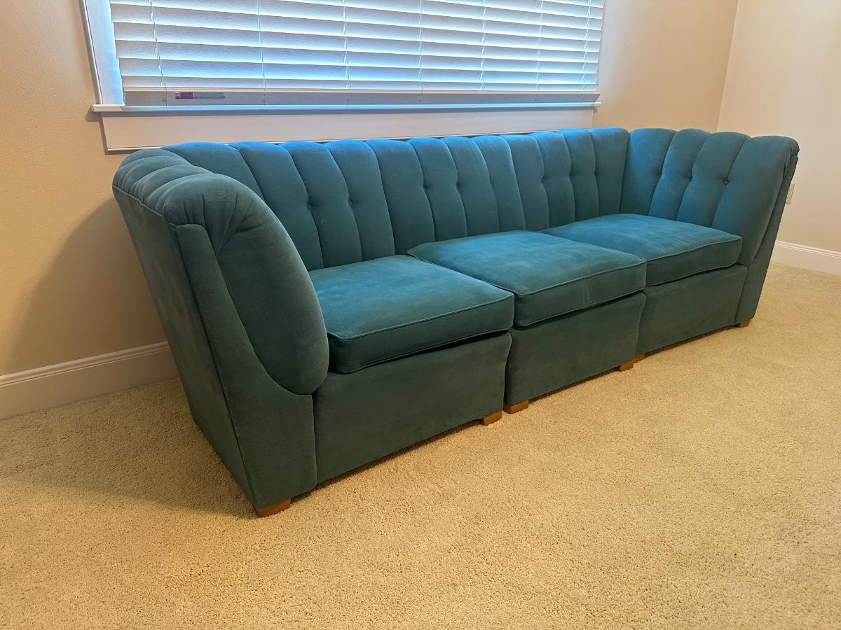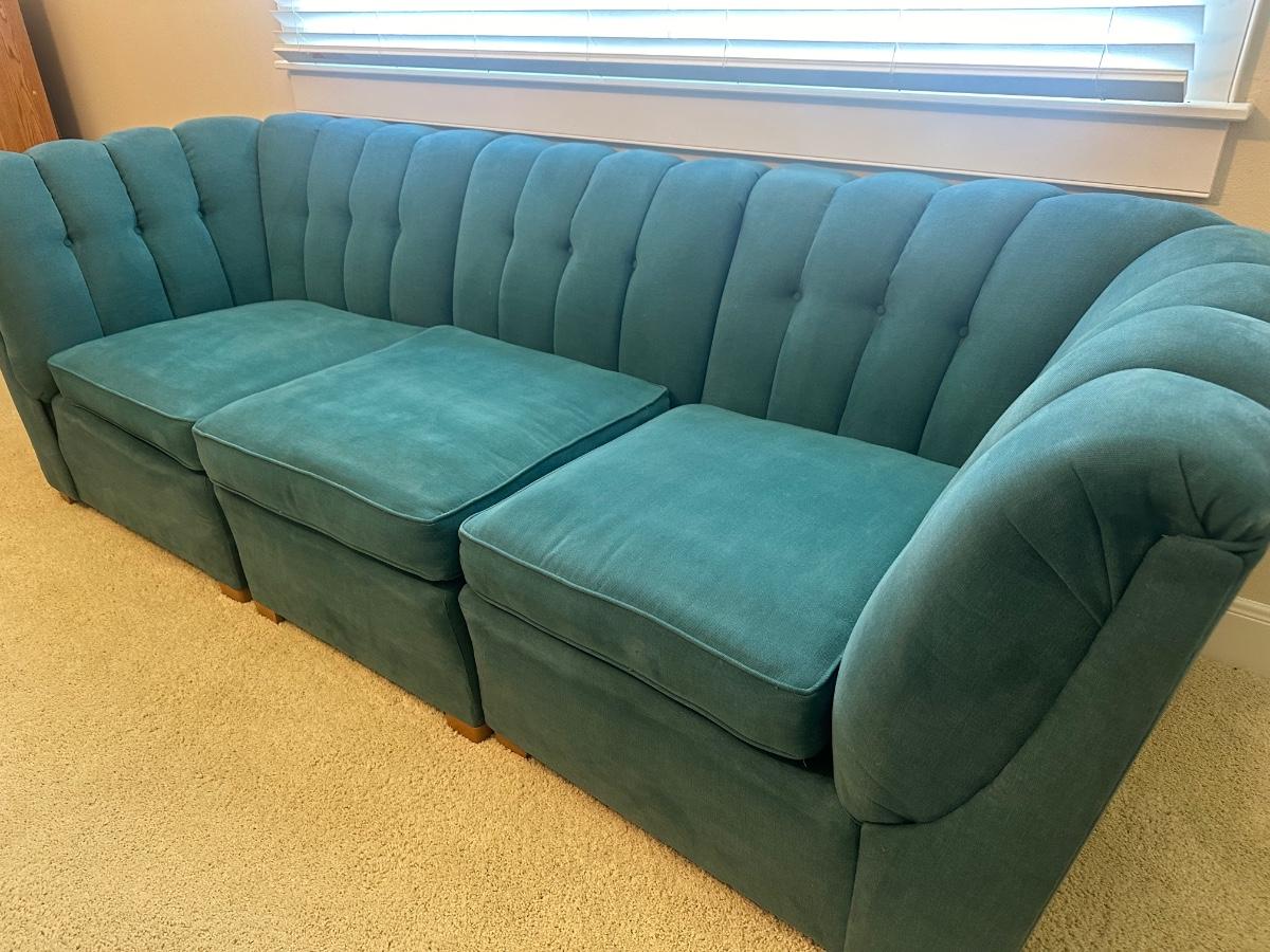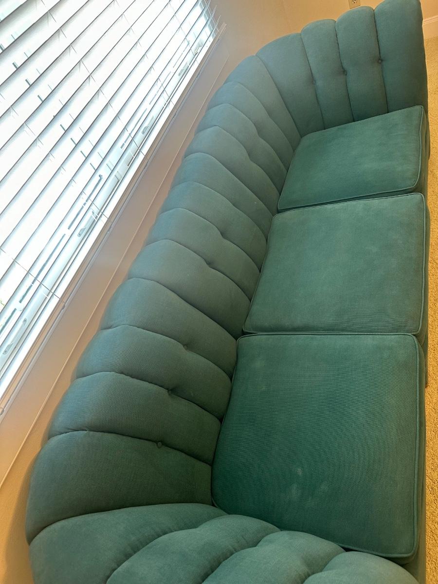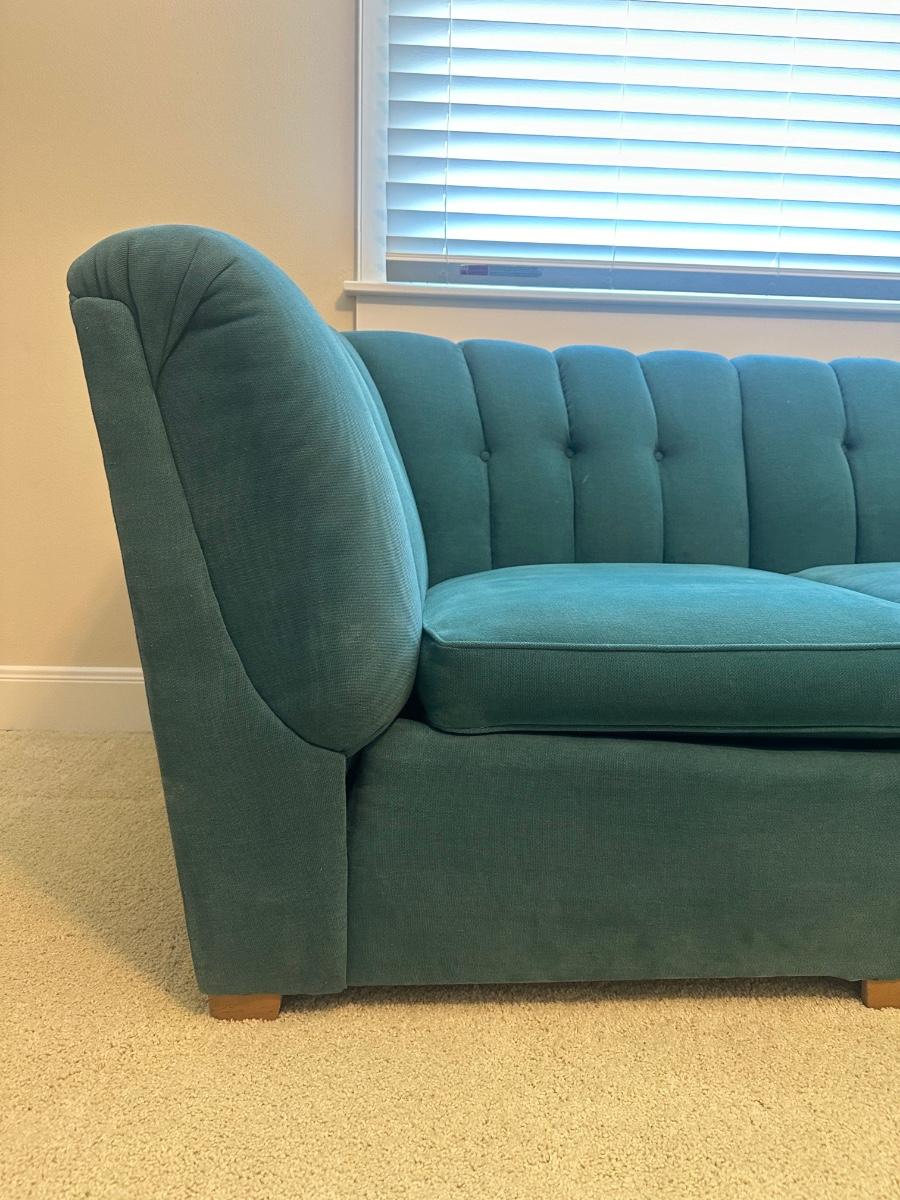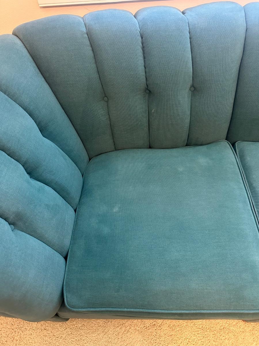 Sofa has been recovered. Slight wear on the fabric but beautiful overall!