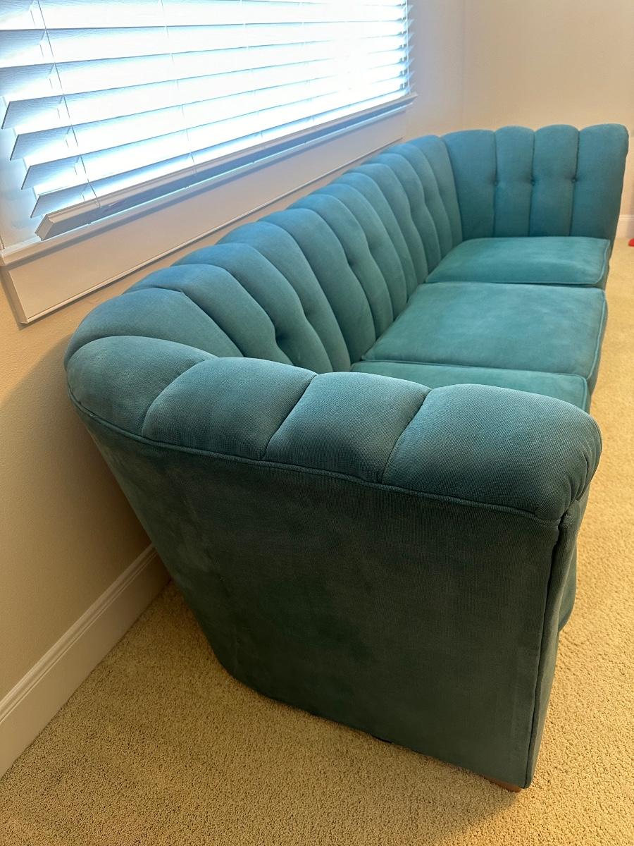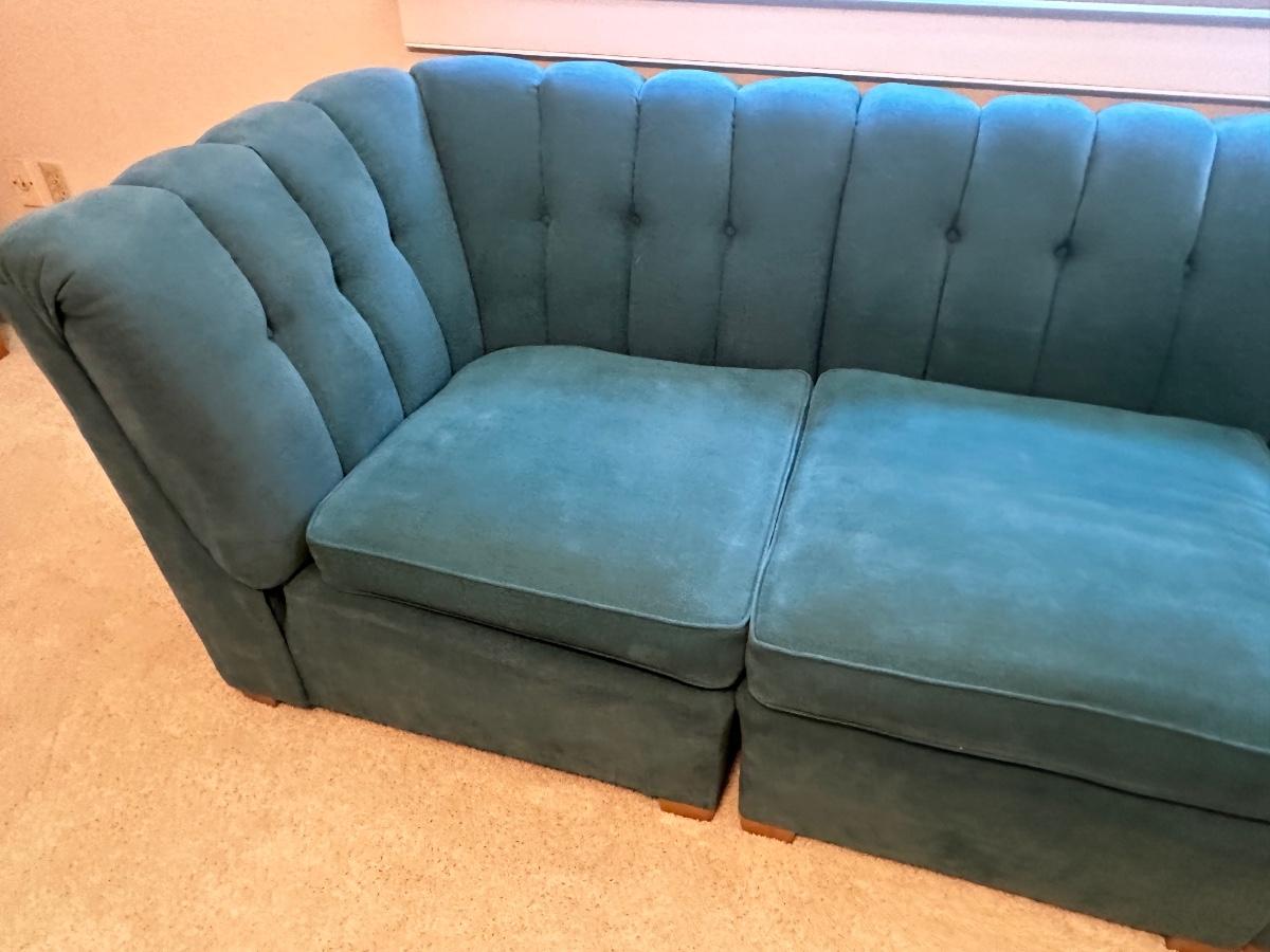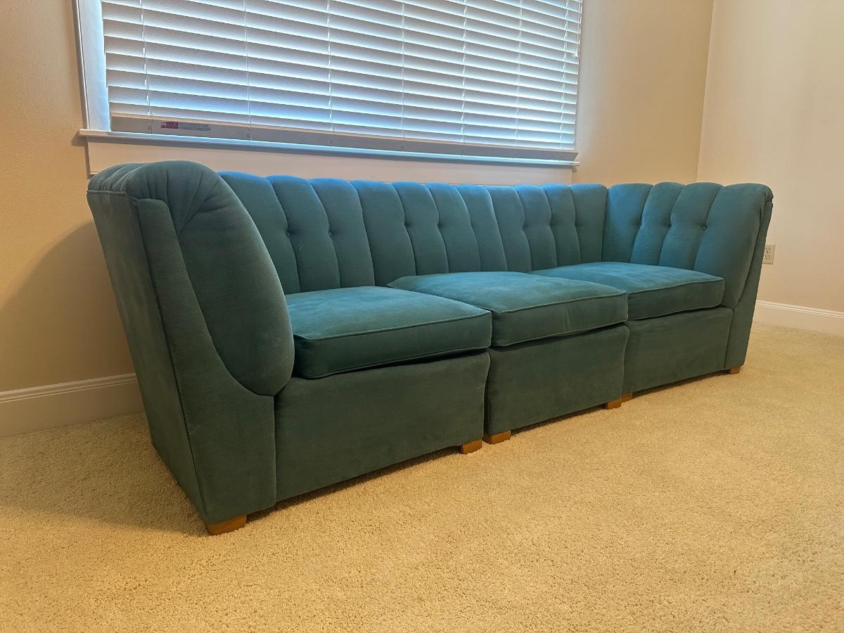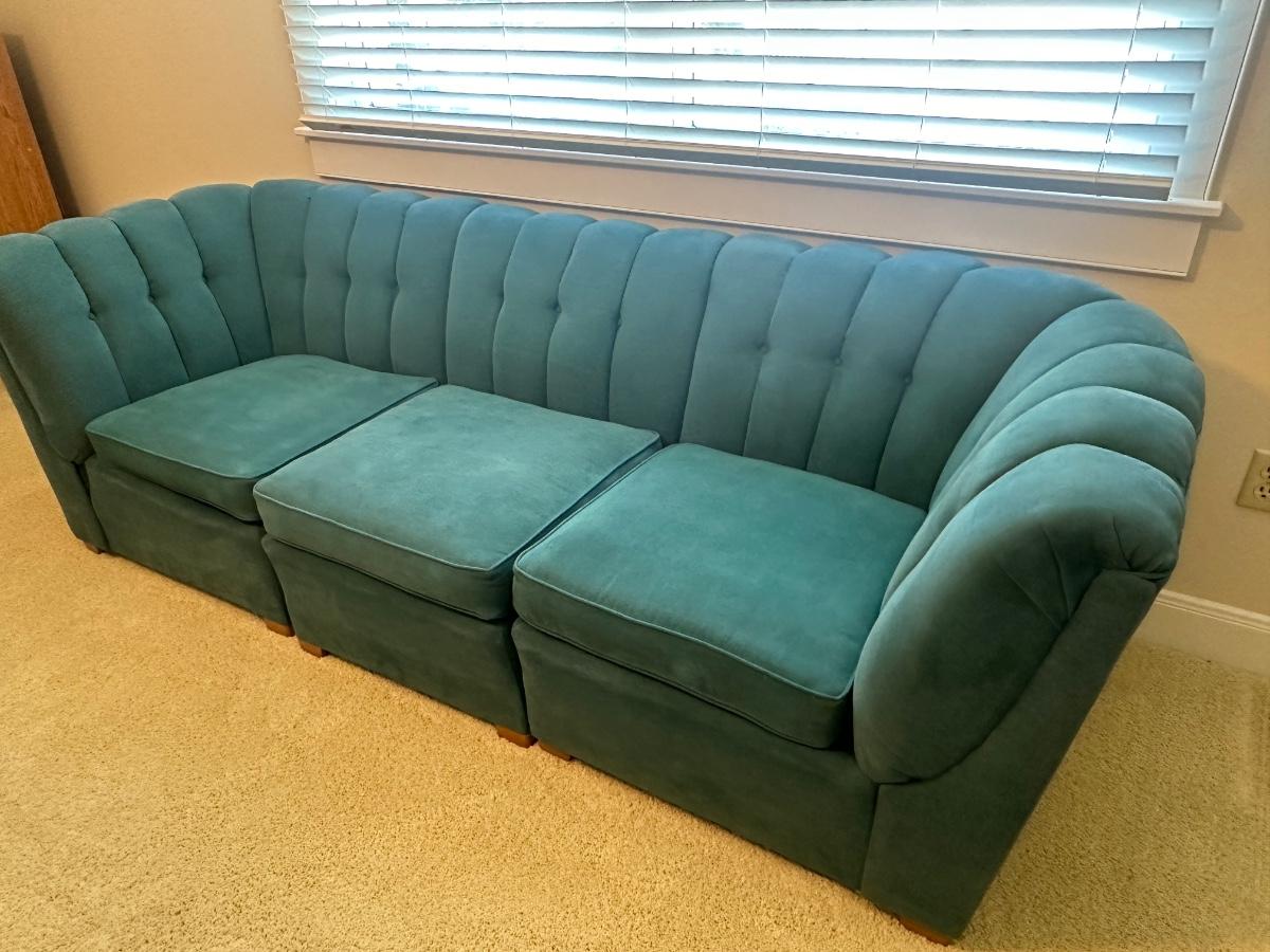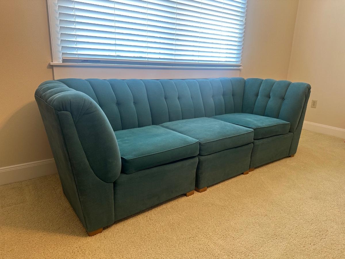 Sofa has been recovered. Slight wear on the fabric but beautiful overall!