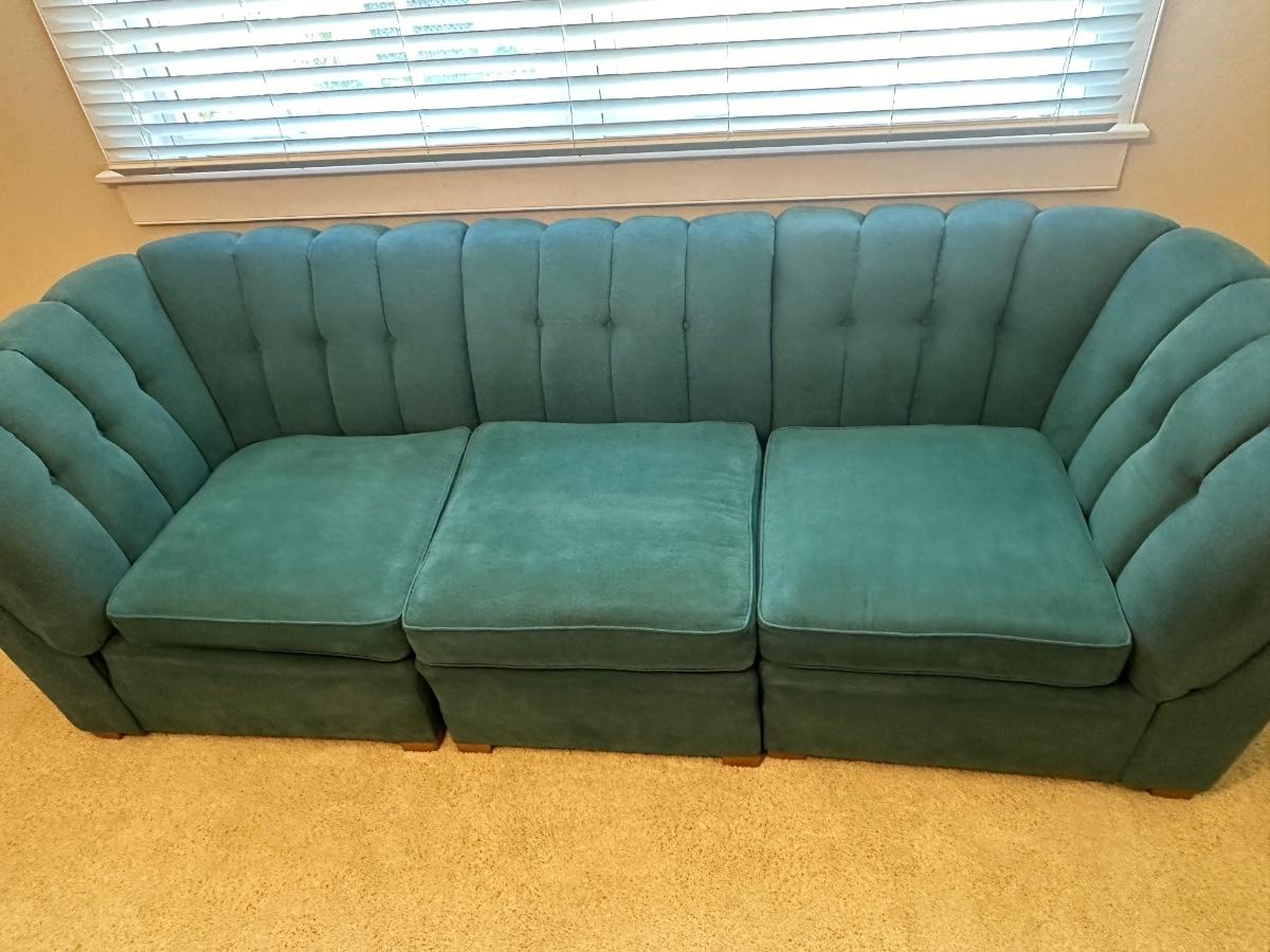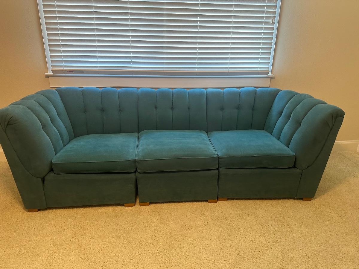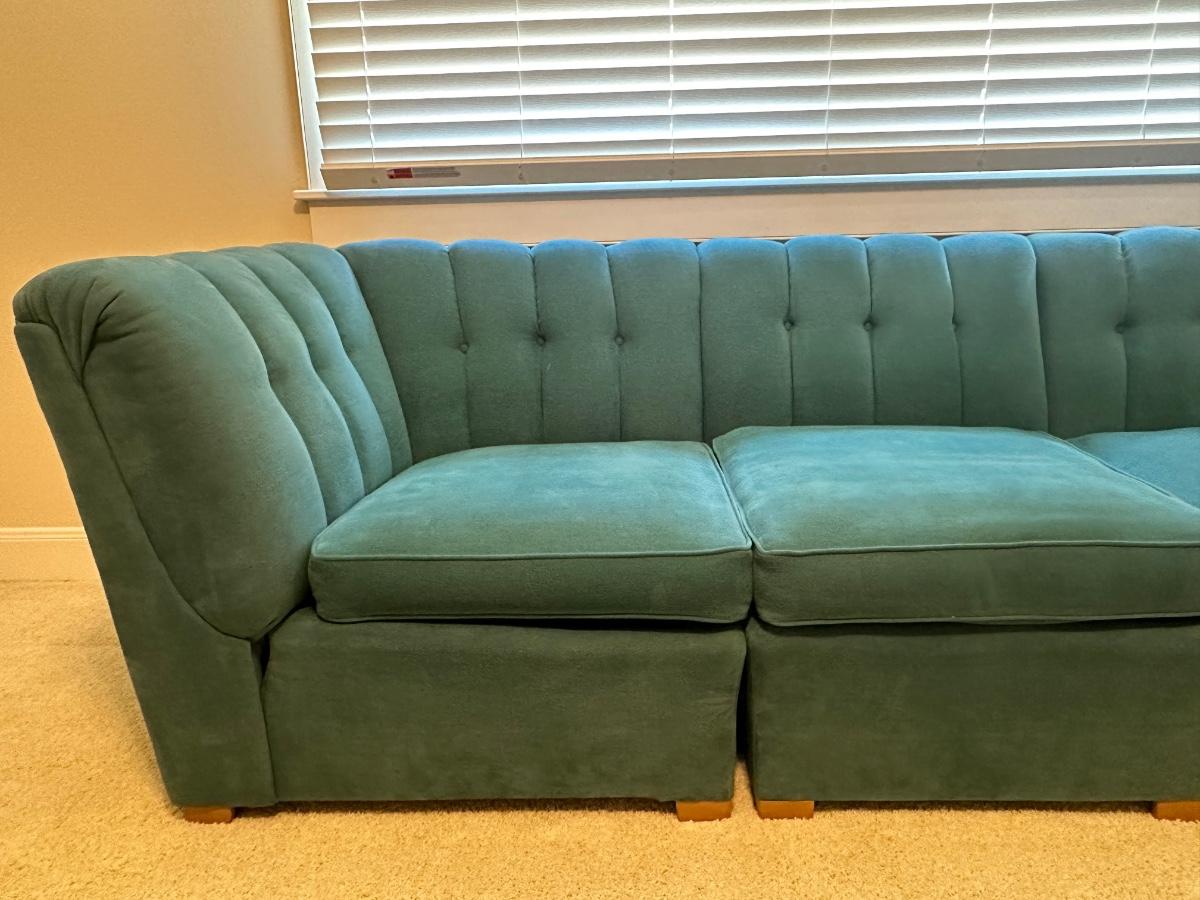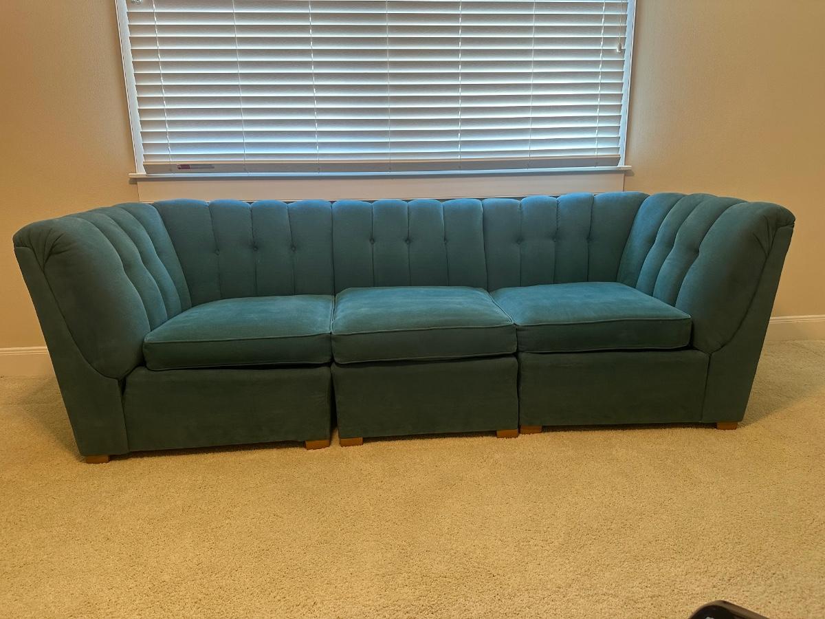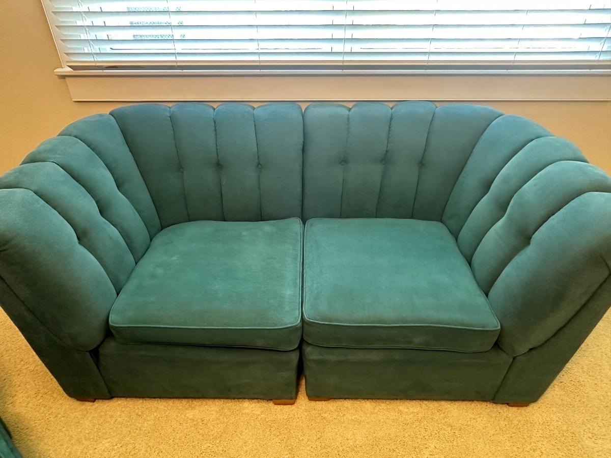 Sofa has been recovered. Slight wear on the fabric but beautiful overall!