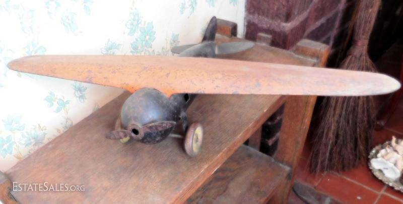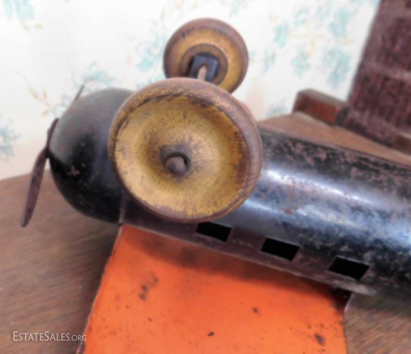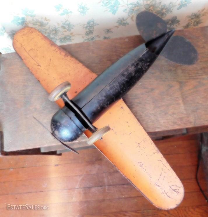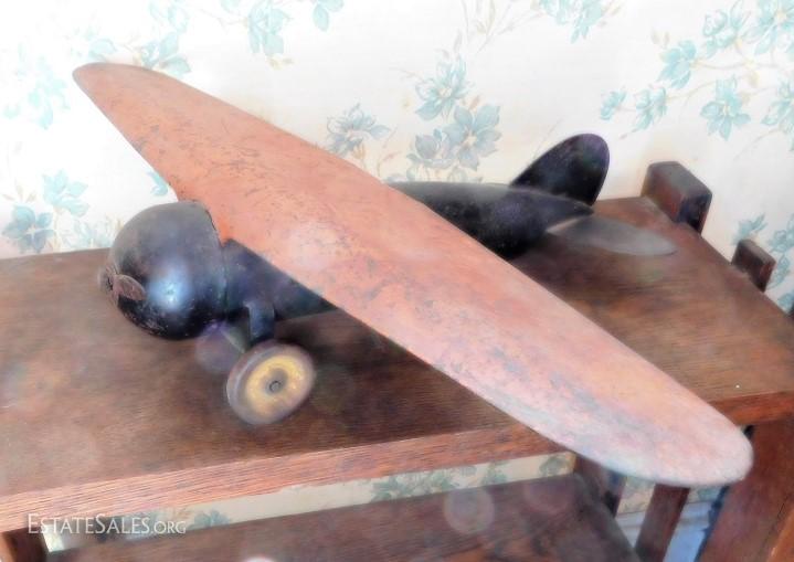1920's Wyandotte (?) folded steel airplane in good condition. There is visible paint wear but all parts are present and the wooden wheels are intact. This is a very nice piece and rare to find in such good condition. Has not been restored or re-painted. Appears to be in original condition.